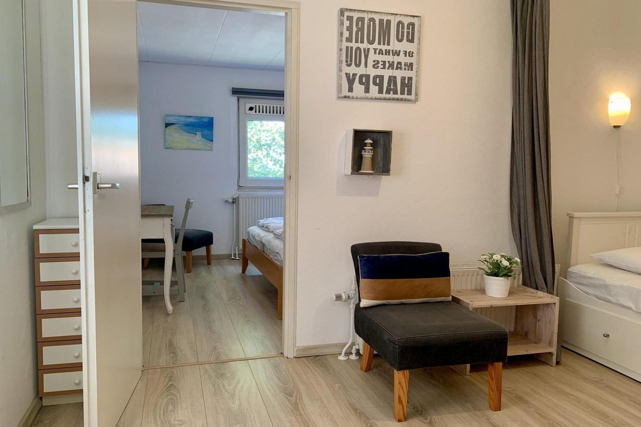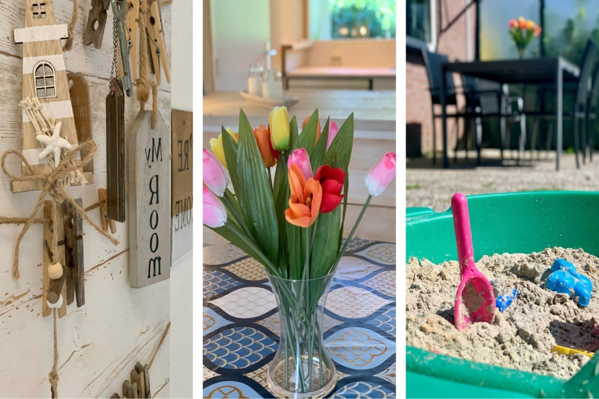 Ground floor: (Living room(TV(smart TV, dutch television channels, german television channels, international television channels), seating area, air conditioning), open kitchen(stove, electric kettle, toaster, hood, coffee machine(filter), oven, microwave, dishwasher, fridge-freezer), bedroom(double bed(160 x 200 cm), Floor mattress), bedroom(single bed(90 x 200 cm)), bedroom(bunk bed(90 x 200 cm), cot), bathroom(shower, washbasin, toilet), toilet) terrace, garden, high chair