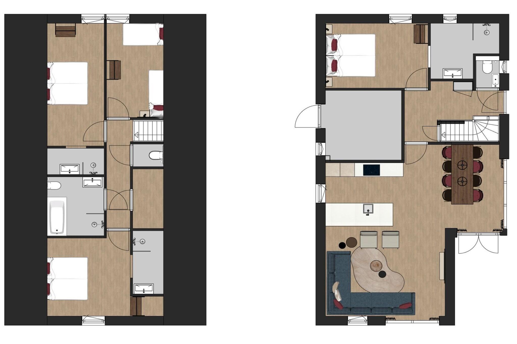Ground floor: (Kitchen(hob(induction), electric kettle, toaster, espresso machine, combination microwave, dishwasher, fridge-freezer, Hand blender, dishes and cutlery, Cooking basics), Living/diningroom(TV(smart TV), dining table, seating area), Bedroom with bathroom(single bed, single bed, bathtub or shower, washbasin), toilet(toilet)) On the 1st floor: (bedroom(single bed, single bed), Bedroom with bathroom(single bed, single bed, shower, washbasin), Bedroom with bathroom(single bed, single bed, bathtub or shower, washbasin), bathroom(shower, washbasin, toilet), toilet(toilet)) sauna, heating(floor heating), terrace, garden, garden furniture, parking, parasol, high chair