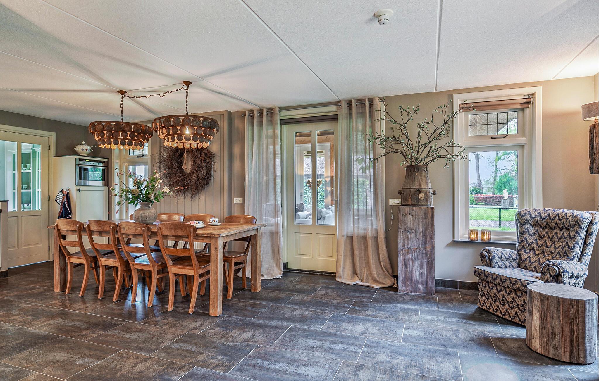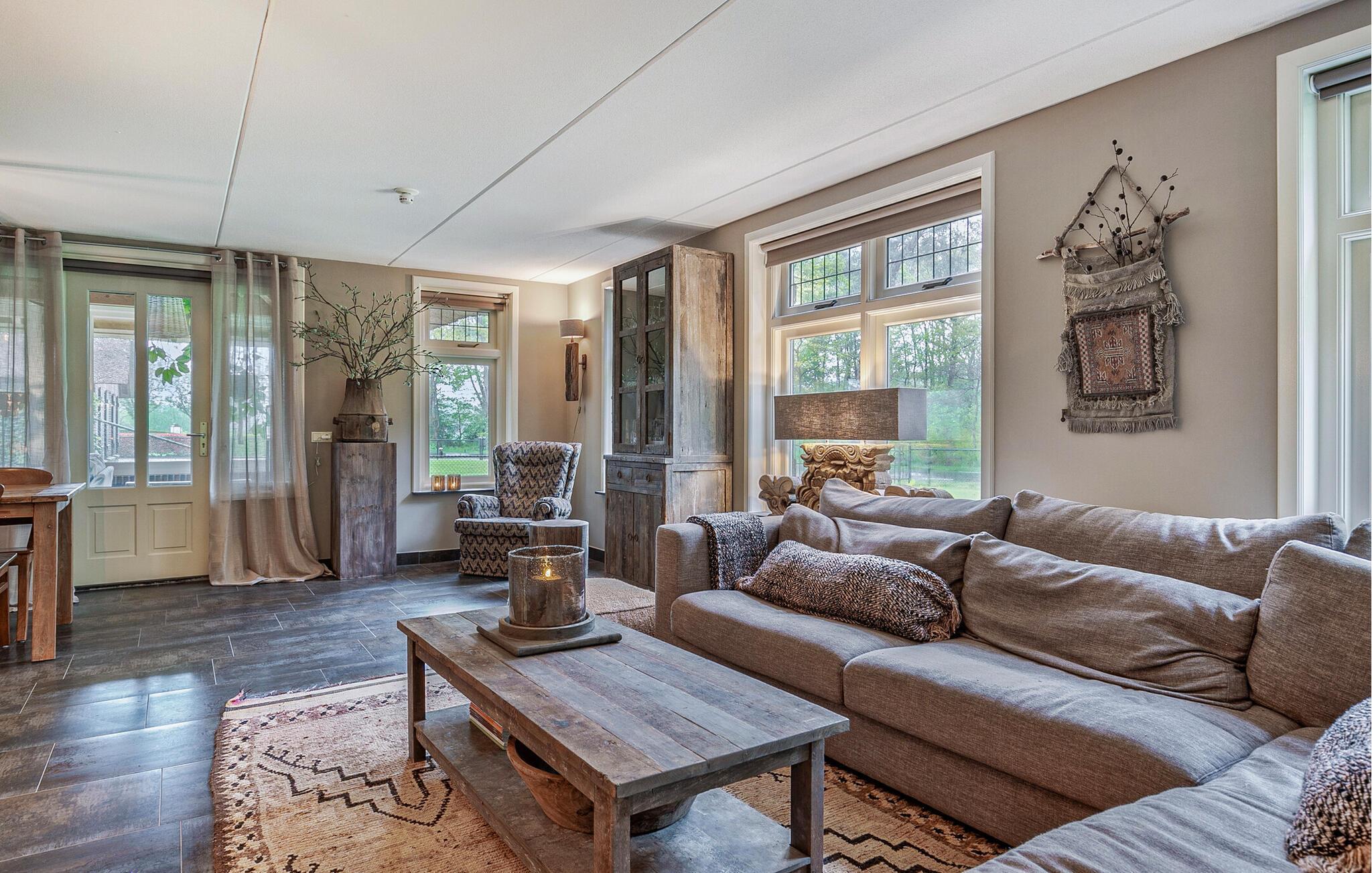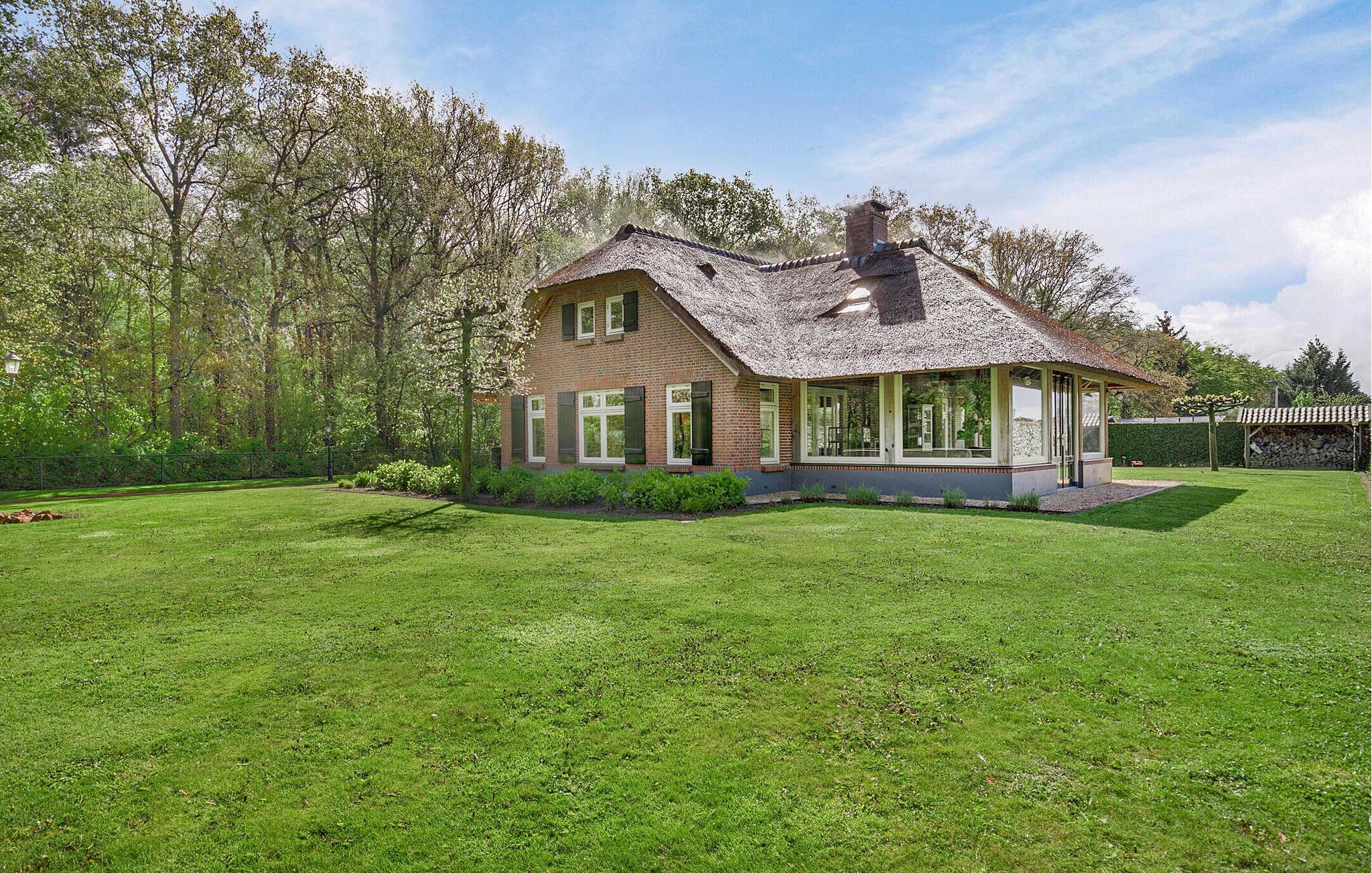 Das einladende und geräumige Haus mit Reetdach erwartet Sie umgeben von Natur und fügt sich mit der für die Veluwe typischen Architektur ideal in die Umgebung ein. Verbringen Sie hier in ansprechendem Ambiente, das Stil und Komfort gekonnt verbindet, eine erholsame Auszeit. Beim Betreten werden Sie von einem geräumigen und lichtdurchfluteten Wohnzimmer mit einem eleganten Holzofen begrüßt, der in den kälteren Monaten eine gemütliche Atmosphäre schafft. Das Wohnzimmer ist offen mit der voll ausgestatteten Küche verbunden. Große Panoramafenster sorgen für viel natürliches Licht und bieten einen wunderschönen Blick auf den Garten und den Wald, der das Grundstück an zwei Seiten umgibt.