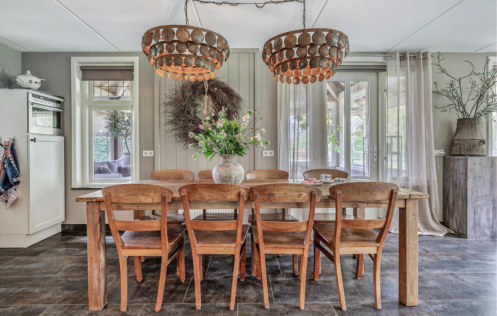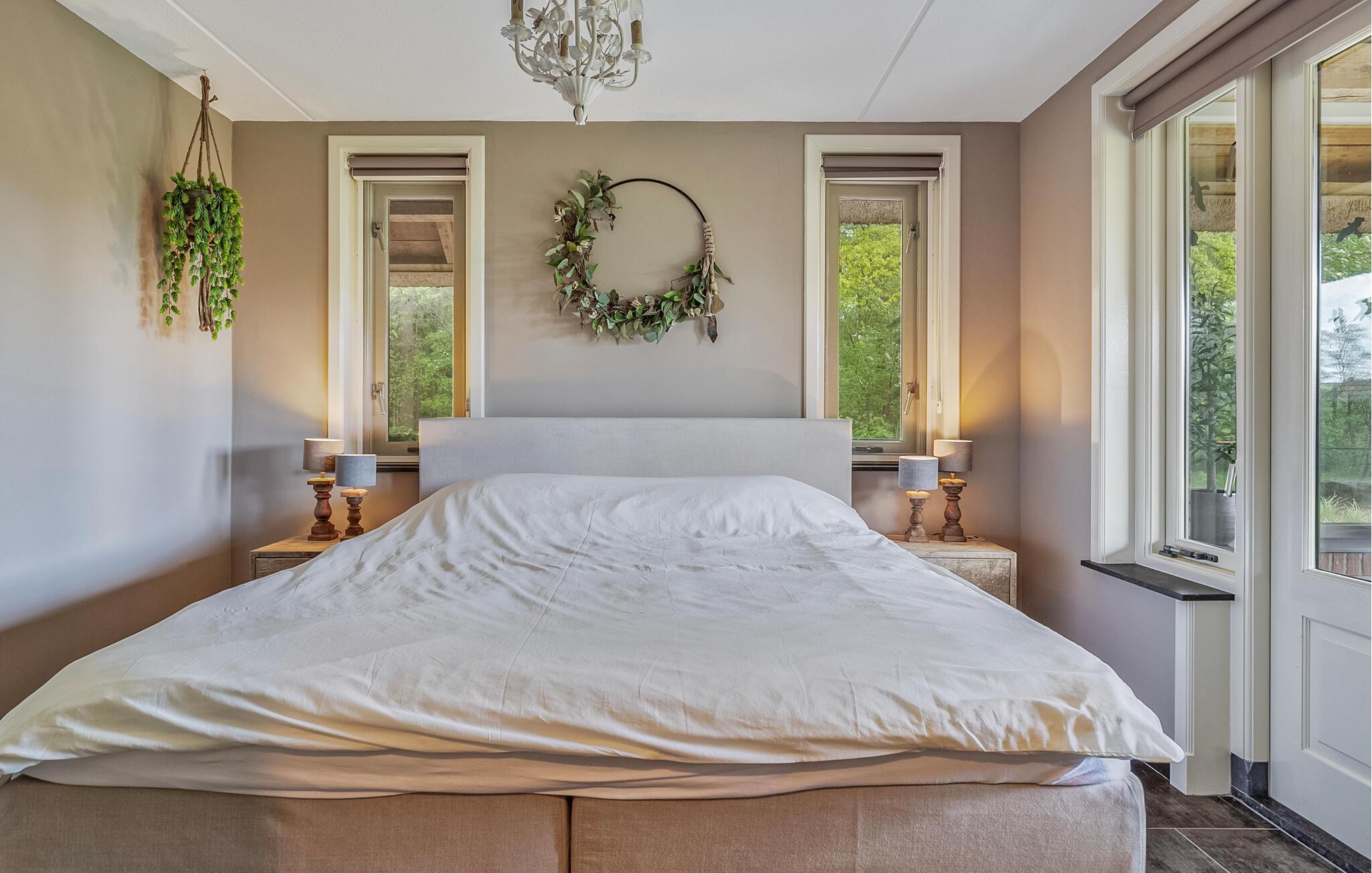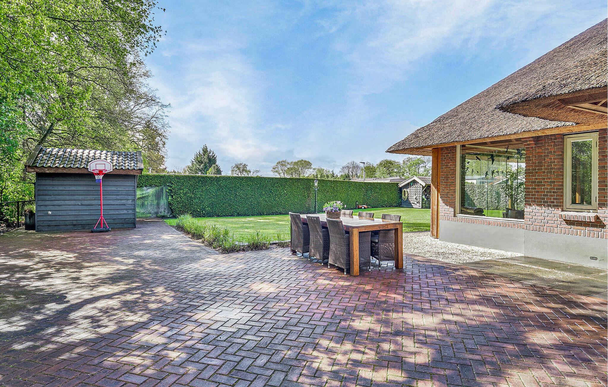 Das einladende und geräumige Haus mit Reetdach erwartet Sie umgeben von Natur und fügt sich mit der für die Veluwe typischen Architektur ideal in die Umgebung ein. Verbringen Sie hier in ansprechendem Ambiente, das Stil und Komfort gekonnt verbindet, eine erholsame Auszeit. Beim Betreten werden Sie von einem geräumigen und lichtdurchfluteten Wohnzimmer mit einem eleganten Holzofen begrüßt, der in den kälteren Monaten eine gemütliche Atmosphäre schafft. Das Wohnzimmer ist offen mit der voll ausgestatteten Küche verbunden. Große Panoramafenster sorgen für viel natürliches Licht und bieten einen wunderschönen Blick auf den Garten und den Wald, der das Grundstück an zwei Seiten umgibt.