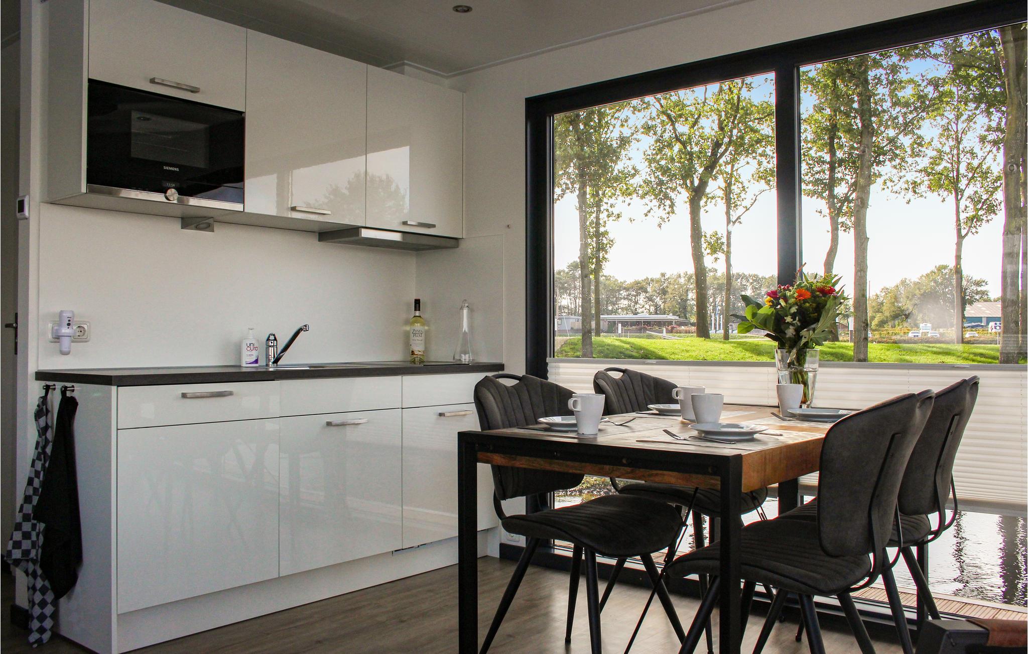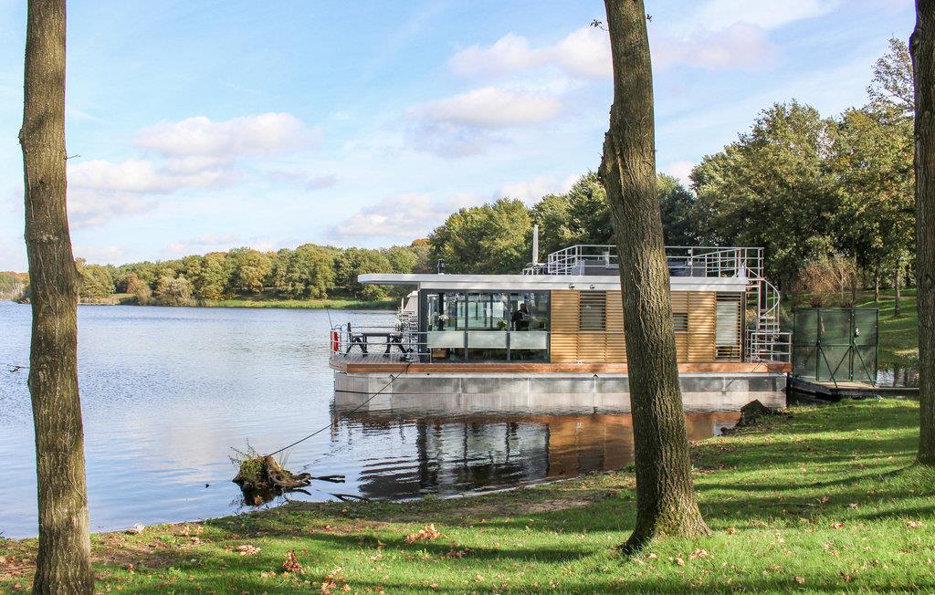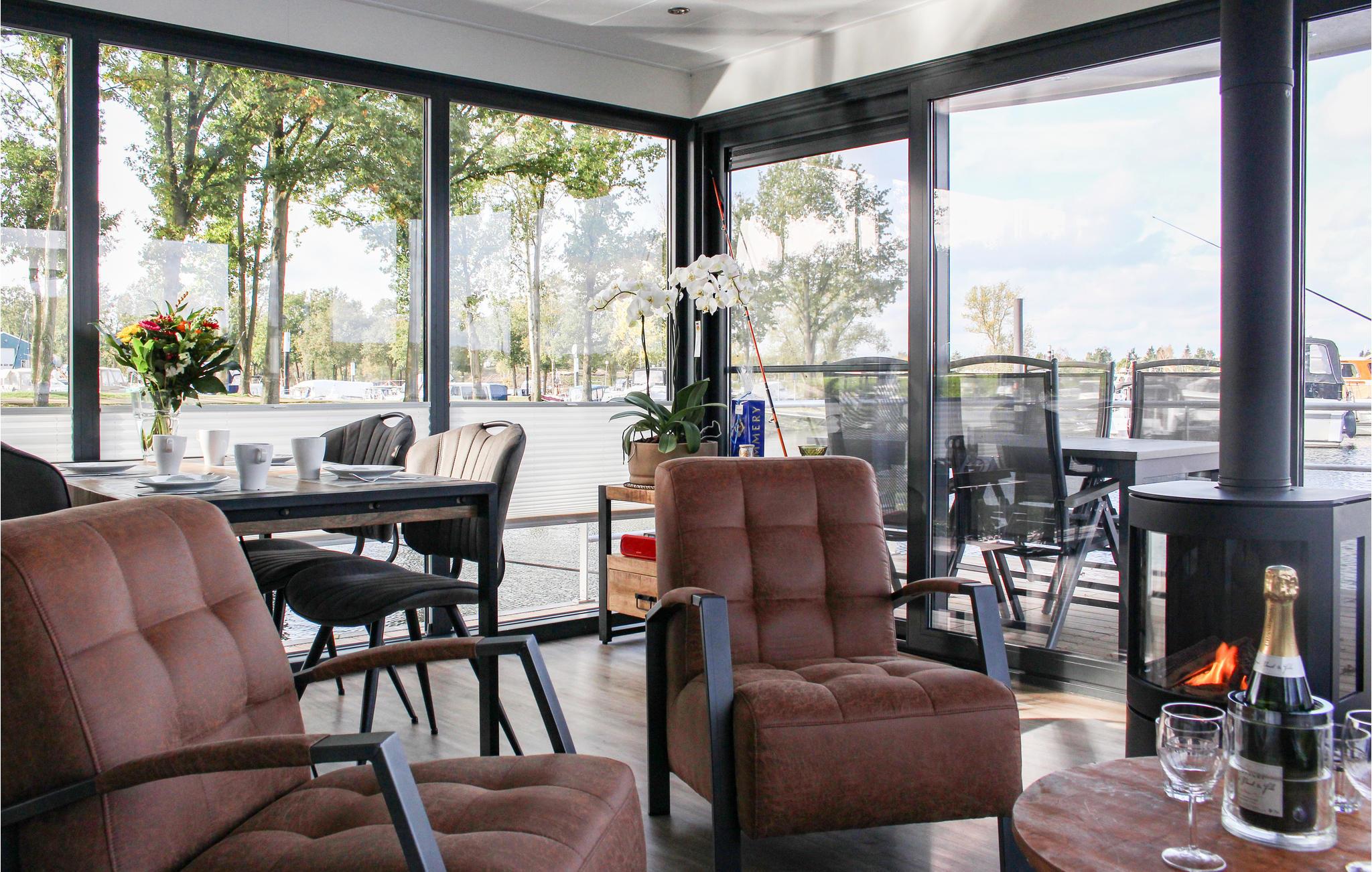 Dieses Hausboot mit 84 m² Wohnfläche ist ideal für einen erholsamen Aufenthalt von vier Personen. Dies ist das größte Hausboot, das in den Benelux-Ländern angeboten wird. Es gibt zwei Schlafzimmer, jedes mit einem bequemen Doppelbett, ein modernes Wohnzimmer mit großen Fenstern und attraktivem Gaskamin. Die offene Küche ist komplett ausgestattet mit Geschirrspüler, Filterkaffeemaschine, Mikrowelle und 2-Flammen-Induktionskochfeld. Das Badezimmer verfügt über eine ebenerdige Dusche, einen beheizten Handtuchhalter, ein Waschbecken mit Spiegel und einen Schrank. Gegenüber dem Badezimmer befindet sich die separate Toilette. Die Räume in diesem Hausboot sind mit Infrarot-Paneelen ausgestattet, die eine wunderbare Strahlungswärme erzeugen.