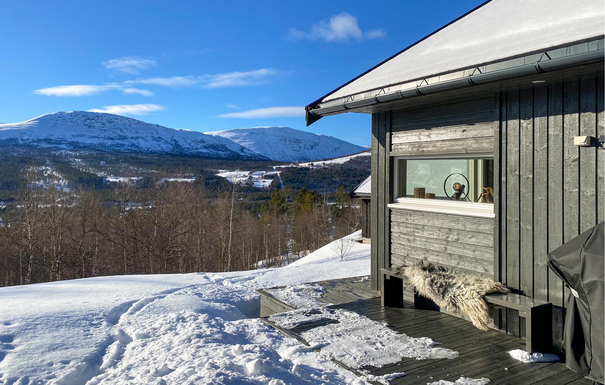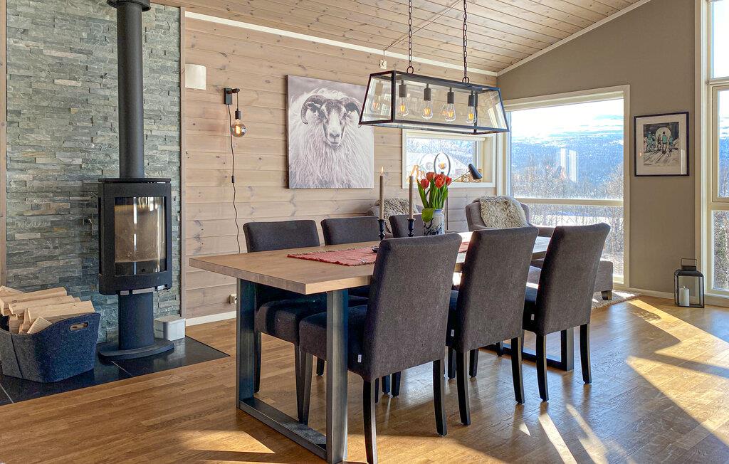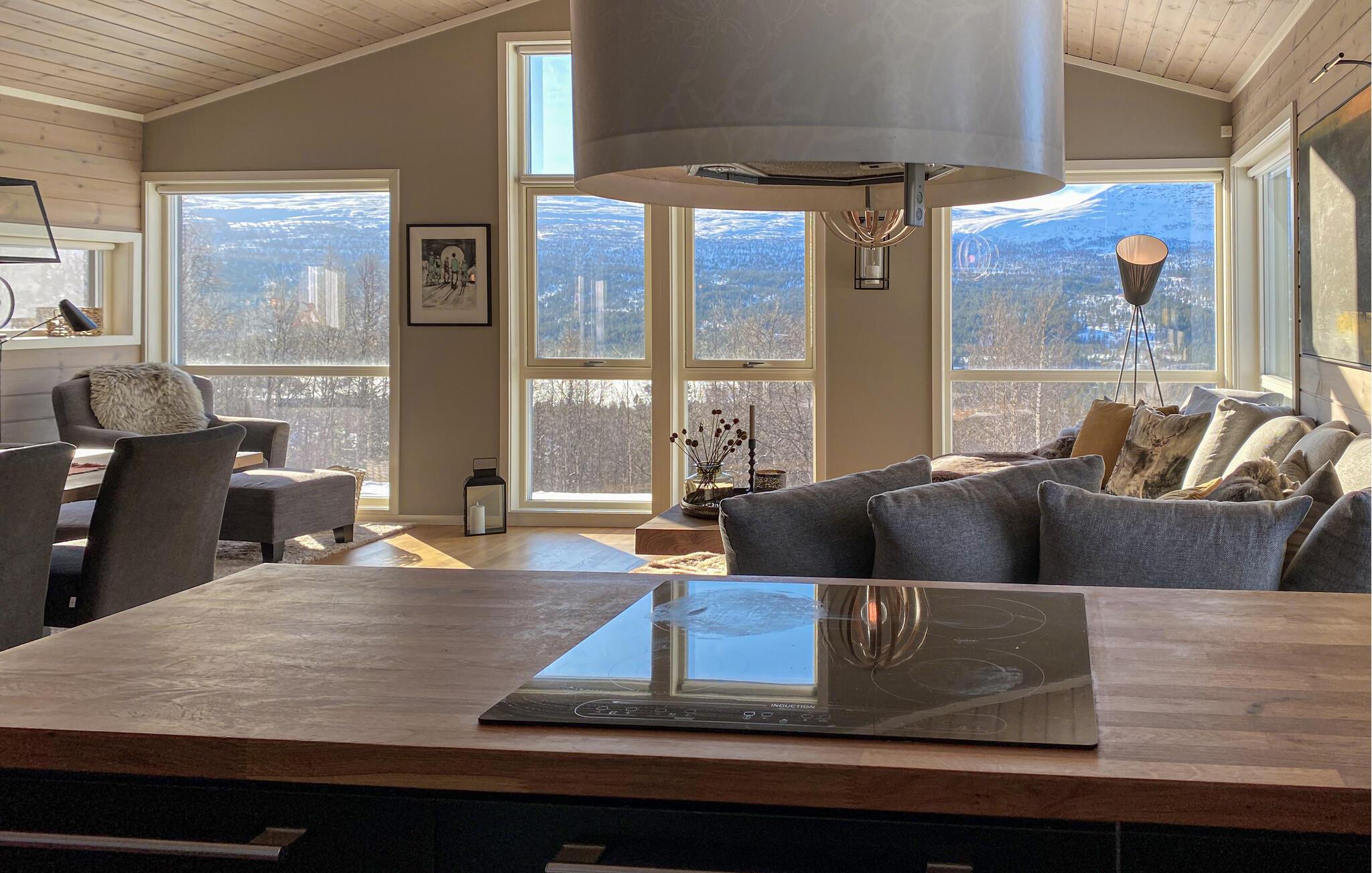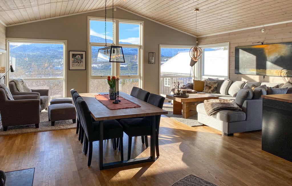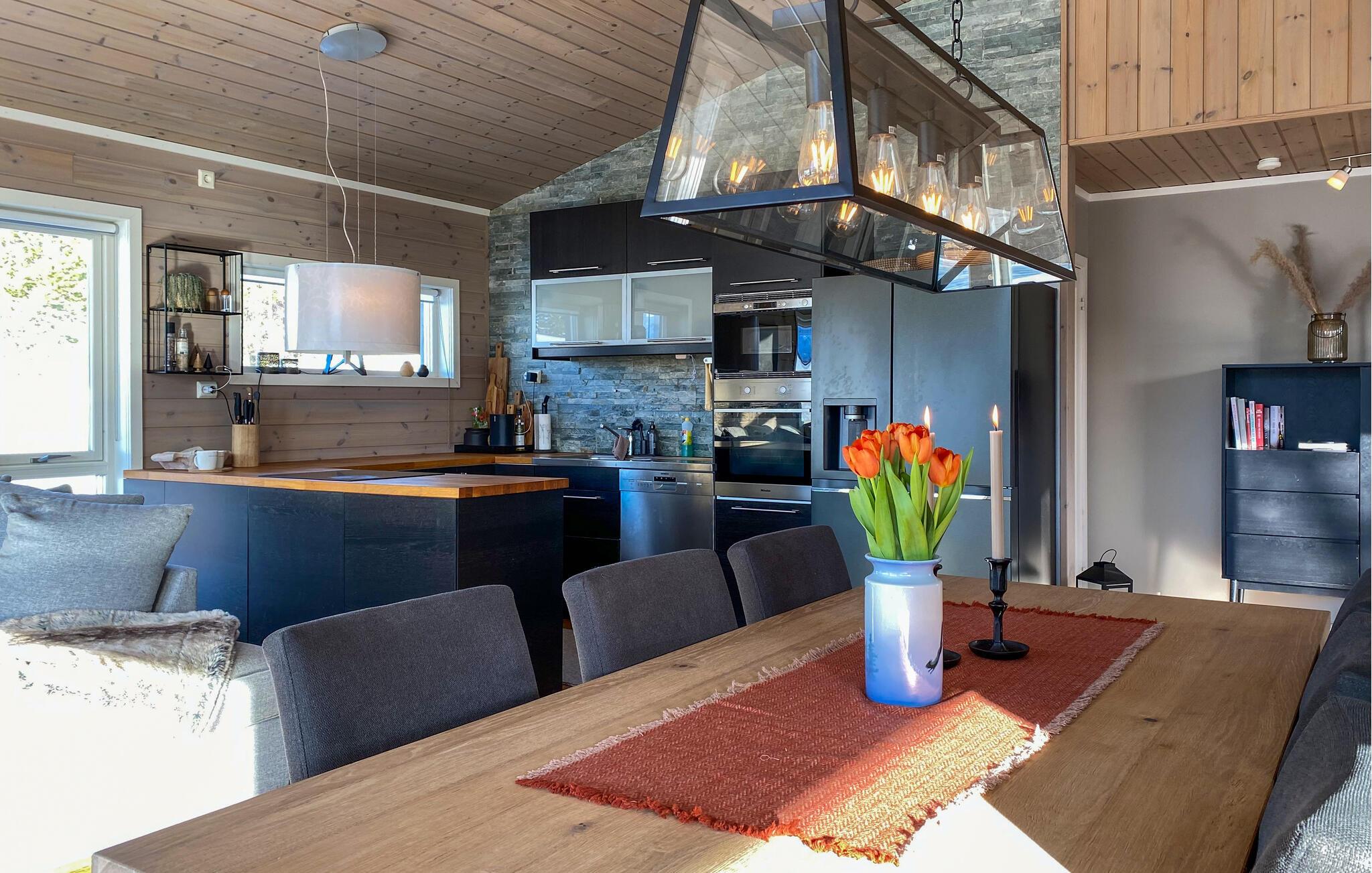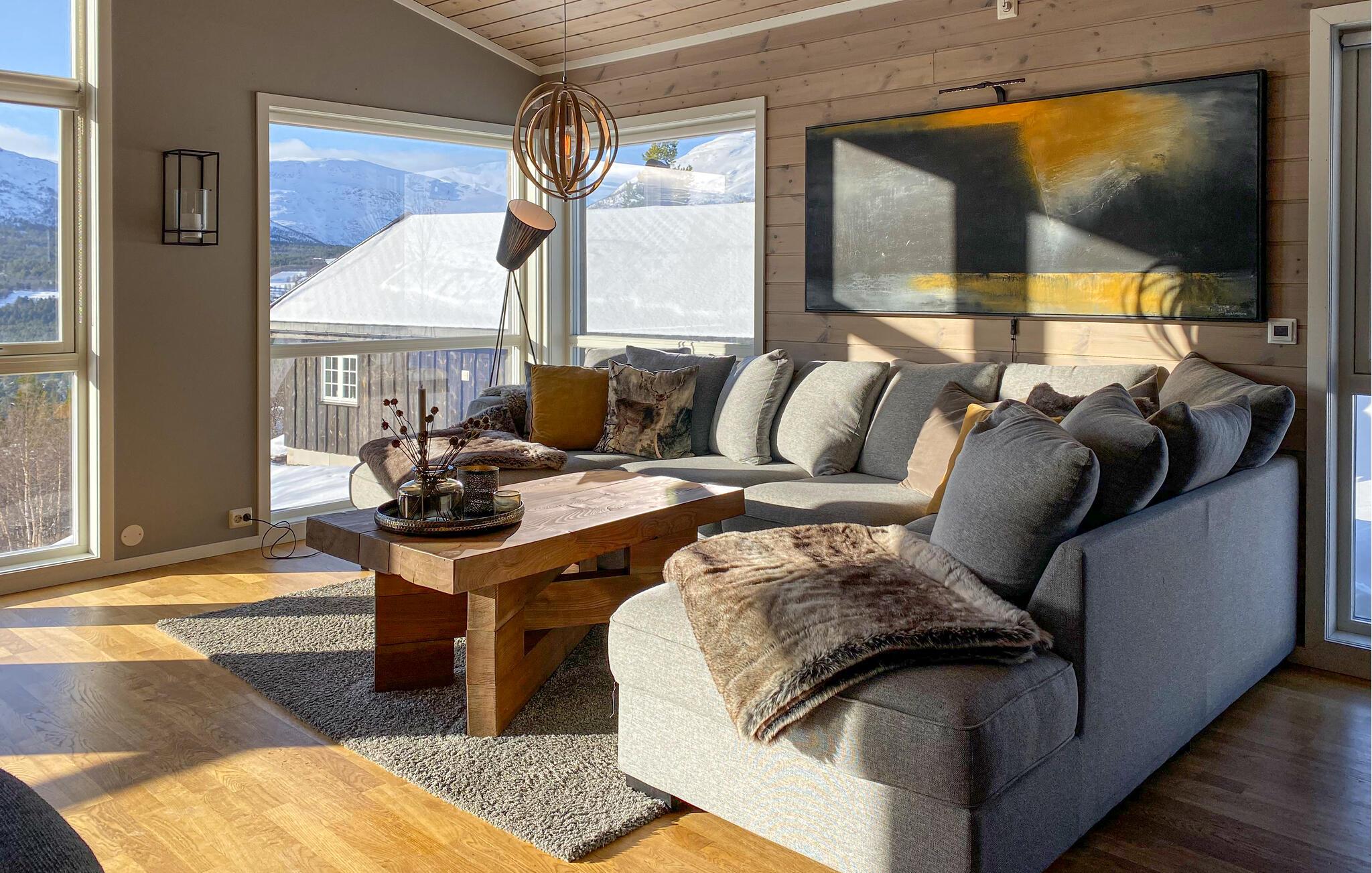 In dieser wundervollen Berghütte in Bjorli erwarten Sie eine atemberaubende Aussicht, eine gemütliche Atmosphäre und zahlreiche Möglichkeiten für Outdoor-Aktivitäten, sowohl im Sommer als auch im Winter. Die lichtdurchflutete Hütte besticht durch ihre große Fensterfront, die Ihnen einen spektakulären Blick auf die umliegenden Berge bietet. Entspannen Sie sich im großzügigen Wohnbereich mit stilvoller Einrichtung, bequemen Sofas und einem Kaminofen, der an kühlen Abenden für eine wohlige Wärme sorgt. Der offene Essbereich mit einem großen Holztisch lädt zu gemeinsamen Mahlzeiten ein, während die moderne Küche mit einer stilvollen Holz- und Steinkombination zum Kochen inspiriert.