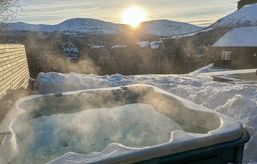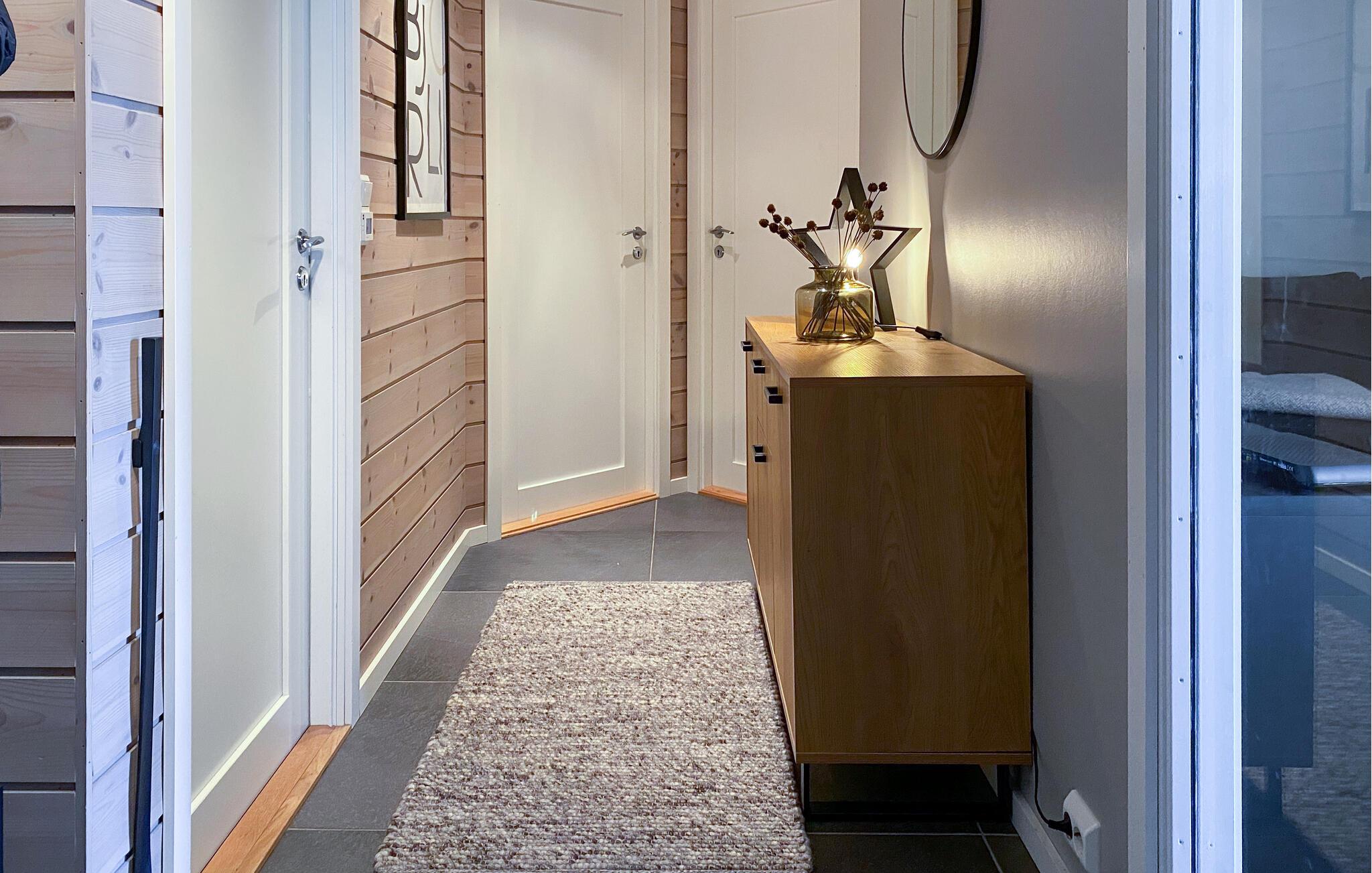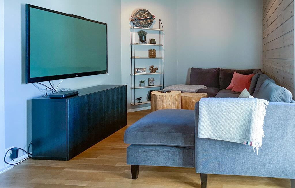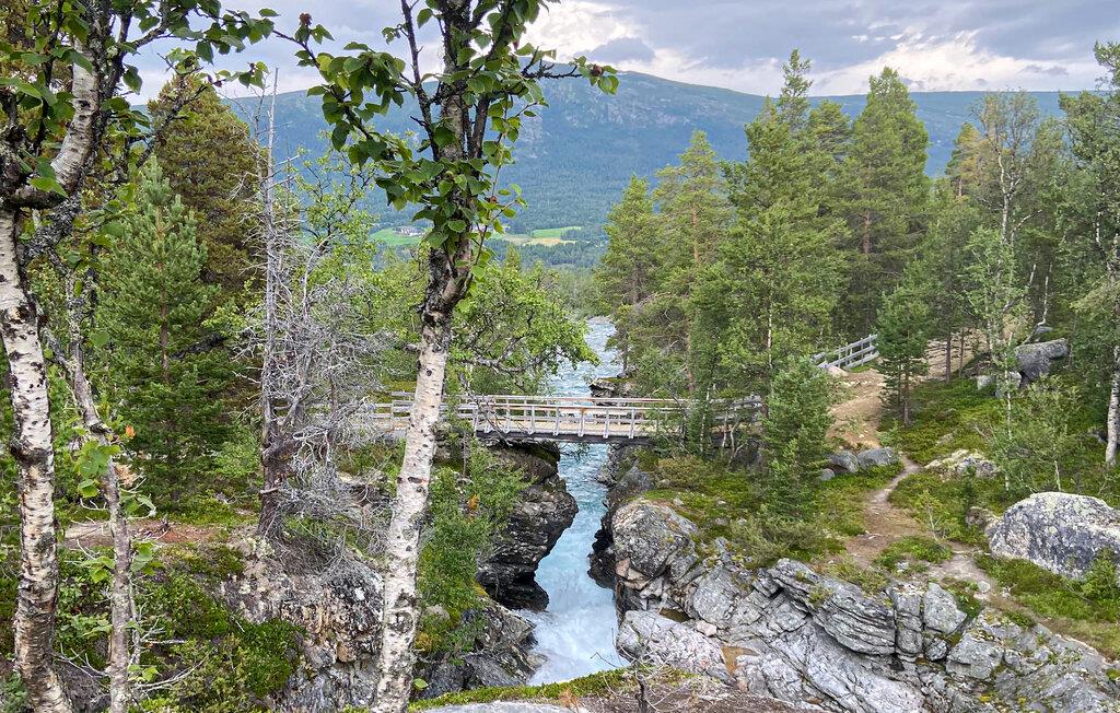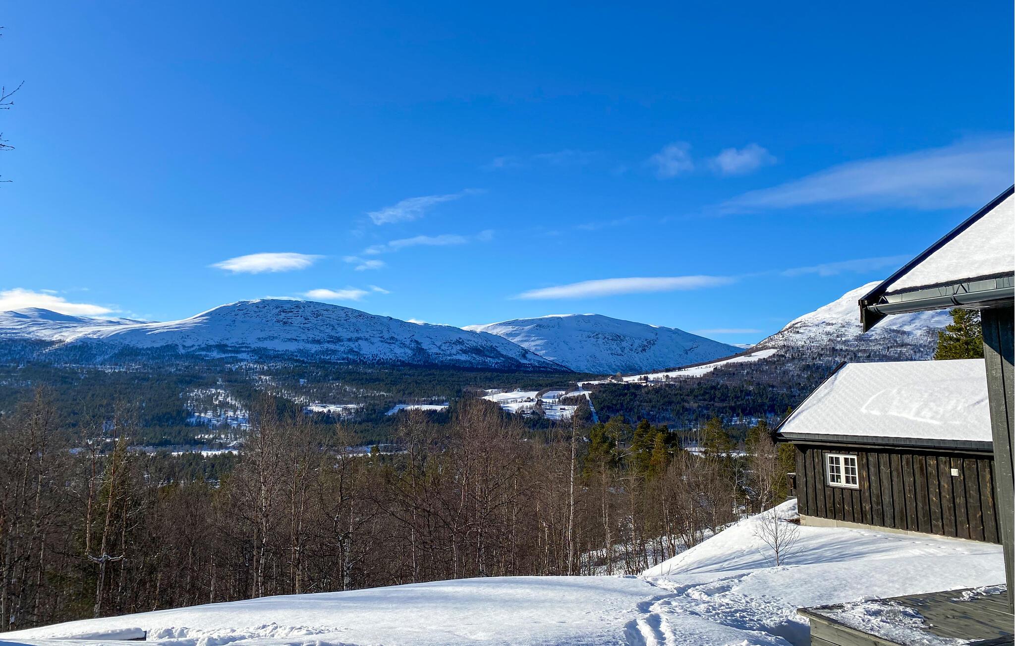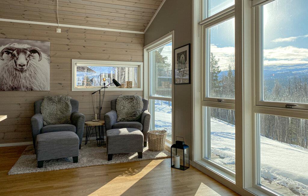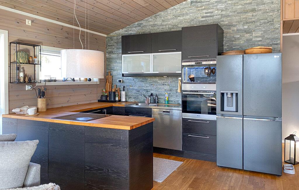 In dieser wundervollen Berghütte in Bjorli erwarten Sie eine atemberaubende Aussicht, eine gemütliche Atmosphäre und zahlreiche Möglichkeiten für Outdoor-Aktivitäten, sowohl im Sommer als auch im Winter. Die lichtdurchflutete Hütte besticht durch ihre große Fensterfront, die Ihnen einen spektakulären Blick auf die umliegenden Berge bietet. Entspannen Sie sich im großzügigen Wohnbereich mit stilvoller Einrichtung, bequemen Sofas und einem Kaminofen, der an kühlen Abenden für eine wohlige Wärme sorgt. Der offene Essbereich mit einem großen Holztisch lädt zu gemeinsamen Mahlzeiten ein, während die moderne Küche mit einer stilvollen Holz- und Steinkombination zum Kochen inspiriert.