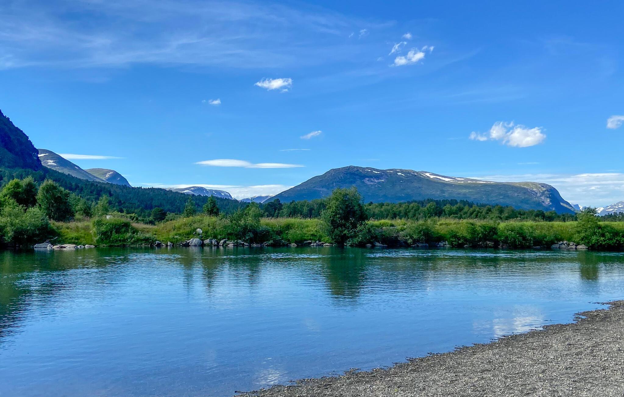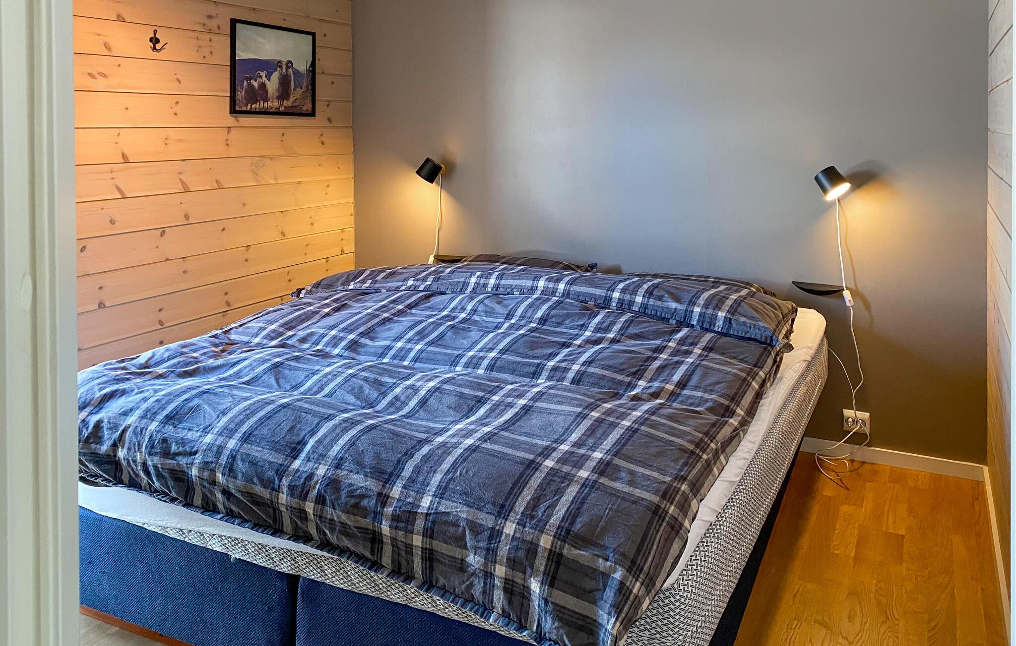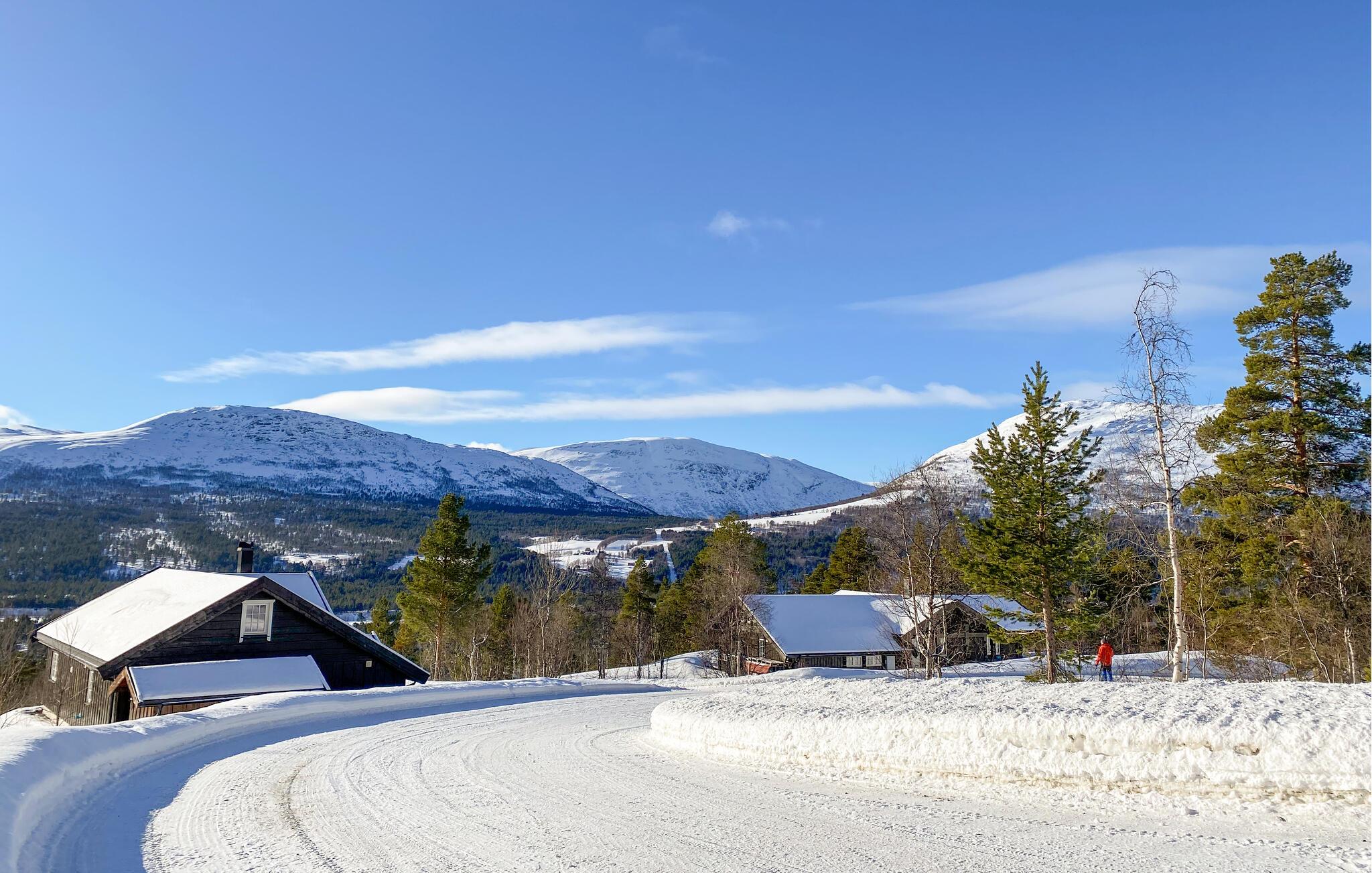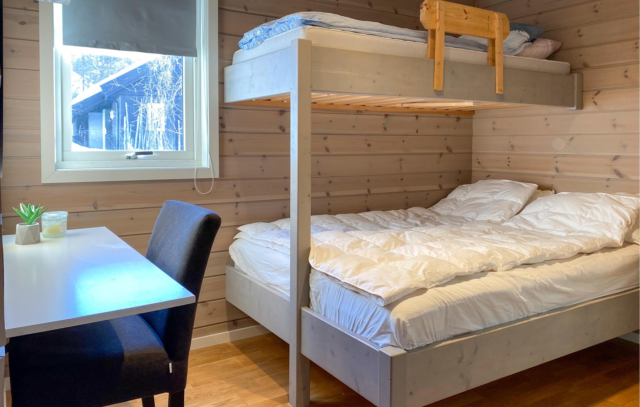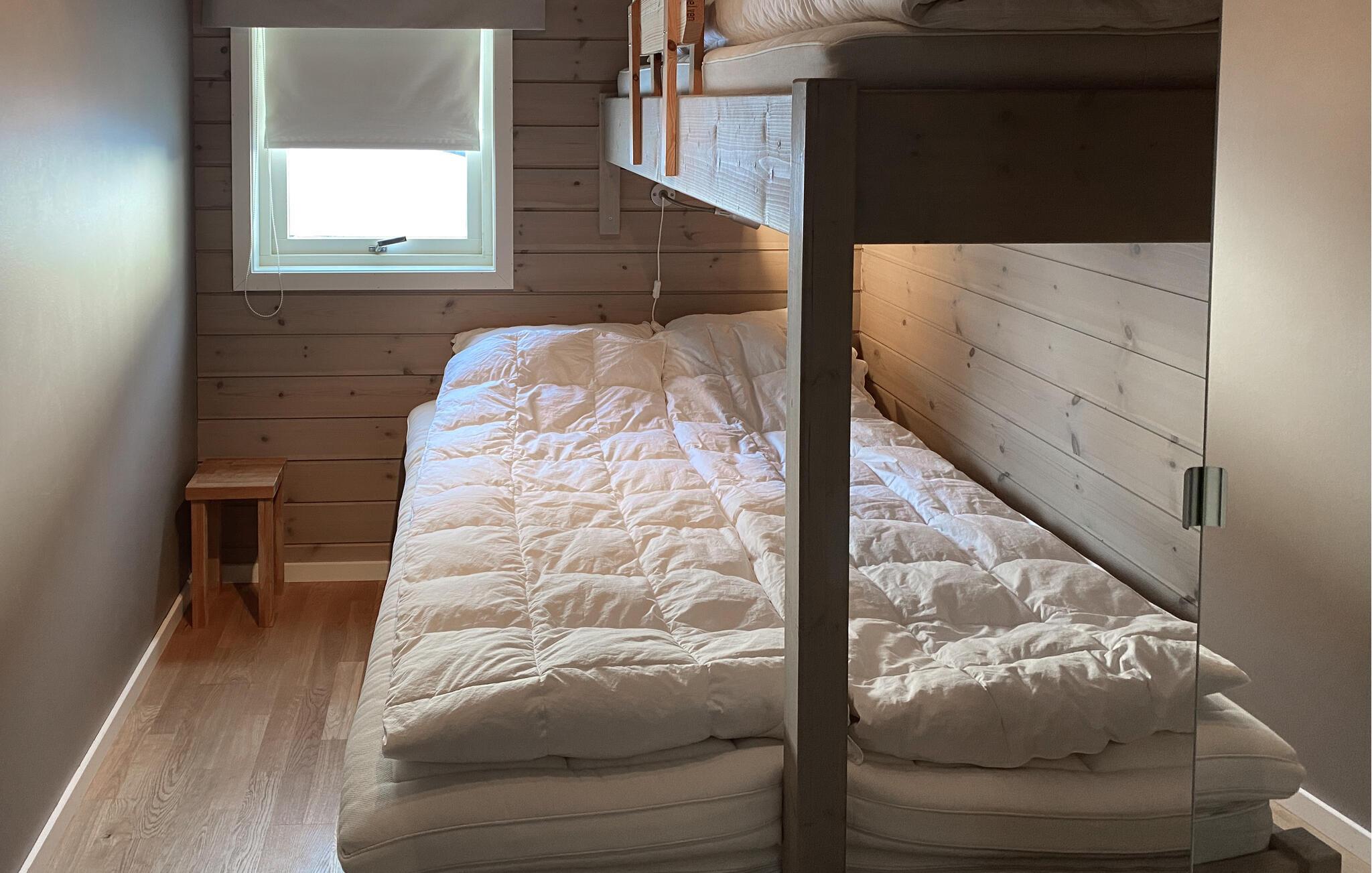 In dieser wundervollen Berghütte in Bjorli erwarten Sie eine atemberaubende Aussicht, eine gemütliche Atmosphäre und zahlreiche Möglichkeiten für Outdoor-Aktivitäten, sowohl im Sommer als auch im Winter. Die lichtdurchflutete Hütte besticht durch ihre große Fensterfront, die Ihnen einen spektakulären Blick auf die umliegenden Berge bietet. Entspannen Sie sich im großzügigen Wohnbereich mit stilvoller Einrichtung, bequemen Sofas und einem Kaminofen, der an kühlen Abenden für eine wohlige Wärme sorgt. Der offene Essbereich mit einem großen Holztisch lädt zu gemeinsamen Mahlzeiten ein, während die moderne Küche mit einer stilvollen Holz- und Steinkombination zum Kochen inspiriert.