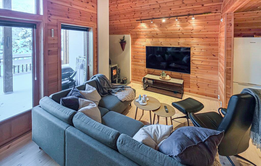 Diese zentral gelegene Wohnung vereint Komfort und Gemütlichkeit auf angenehme Weise. Durch eine große Fensterfront fällt viel Tageslicht ins Innere, während Sie einen schönen Blick auf die Berge genießen können. Verbringen Sie entspannte Stunden auf der bequemen Sofalandschaft bei einer Tasse Kaffee oder bei einem gemütlichen Filmabend. An kühlen Abenden können Sie den Kaminofen für wohlige Wärme entzünden.