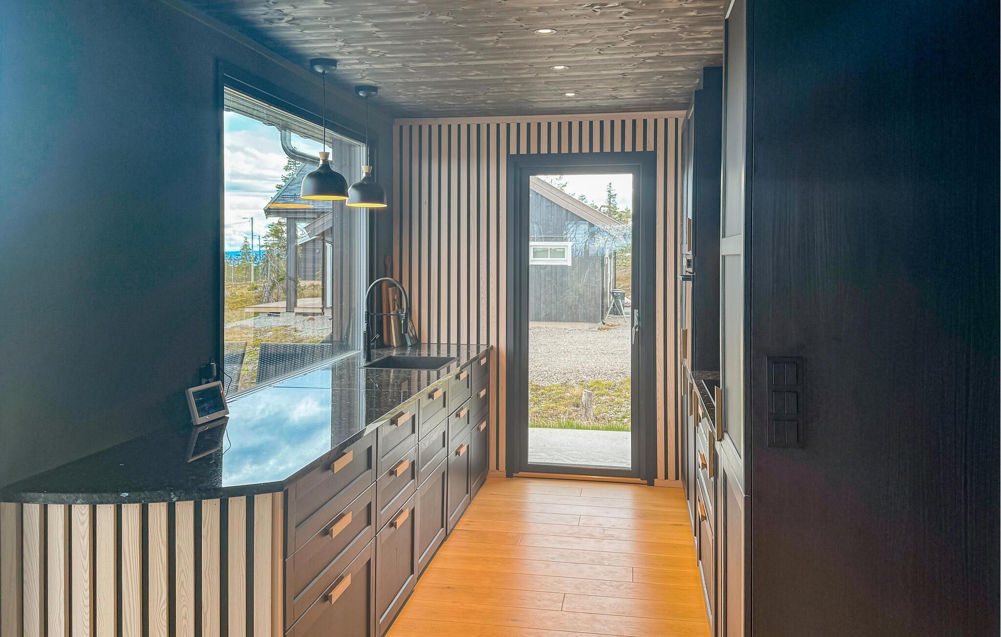 Erleben Sie erholsame Ferientage in Ihrem geschmackvoll gestalteten Ferienhaus, das sich harmonisch in die Landschaft einfügt. Hier wohnen Sie in ruhiger Umgebung mit guter Anbindung an Outdoor-Aktivitäten. Treten Sie ein in das offen und hochwertig eingerichtete Innere des Hauses. Entspannen Sie auf den gemütlichen Sofas im lichtdurchfluteten Wohnbereich und lassen Sie den Blick durch die großen Panoramafenster in die weite Natur schweifen. Genießen Sie gemeinsame Mahlzeiten im stilvollen Essbereich mit Kaminofen oder kochen Sie in der modernen Küche mit elegantem Design und hochwertigen Geräten. Das durchdachte Raumkonzept sorgt für ein angenehmes Wohngefühl mit klaren Linien und warmen Materialien.