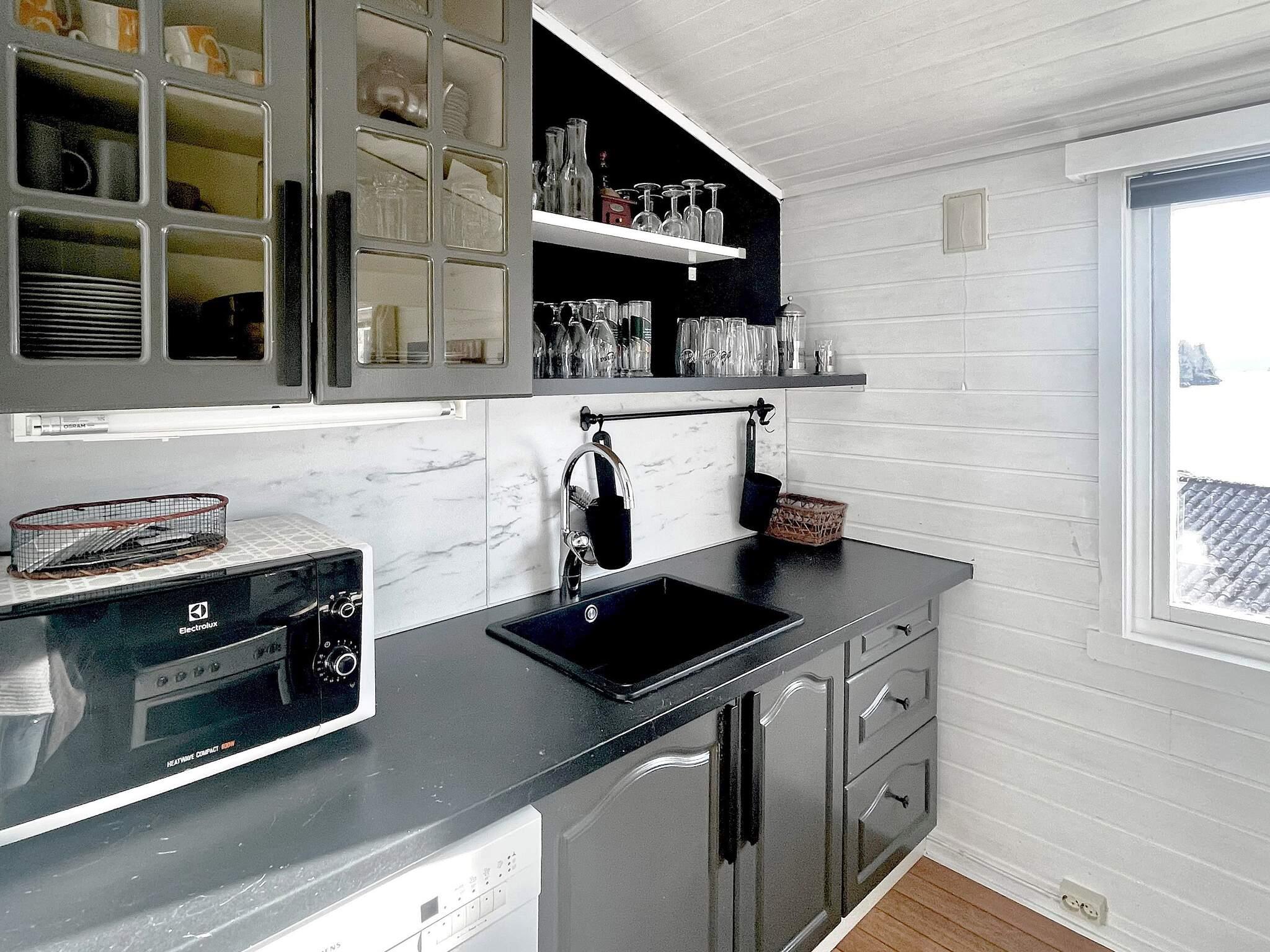 Das Ferienhaus steht umgeben von mehreren Häusern. Sonnige Terrasse von 18 m2 Größe mit Gartenmöbeln und Grill, wo Sie den Sonnenuntergang genießen und dem Plätschern der Wellen lauschen können. Am Ufer gibt es einen großen Anleger u.a. mit einem holzbefeuerten Badezuber und einem von den Gastgebern betriebenen Pub. Der nächste Sandstrand ist nur 150 m entfernt. Mit einem angenehmen und aktiven Gastgeber sind alle Voraussetzungen für einen aufregenden Sommer gegeben.
