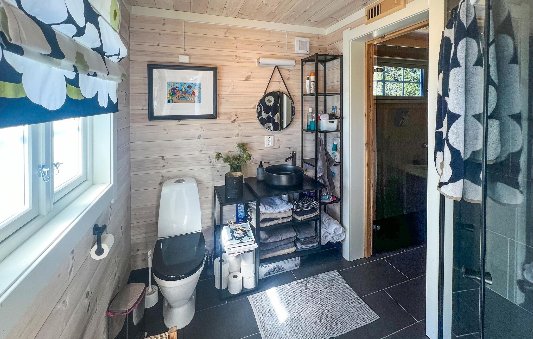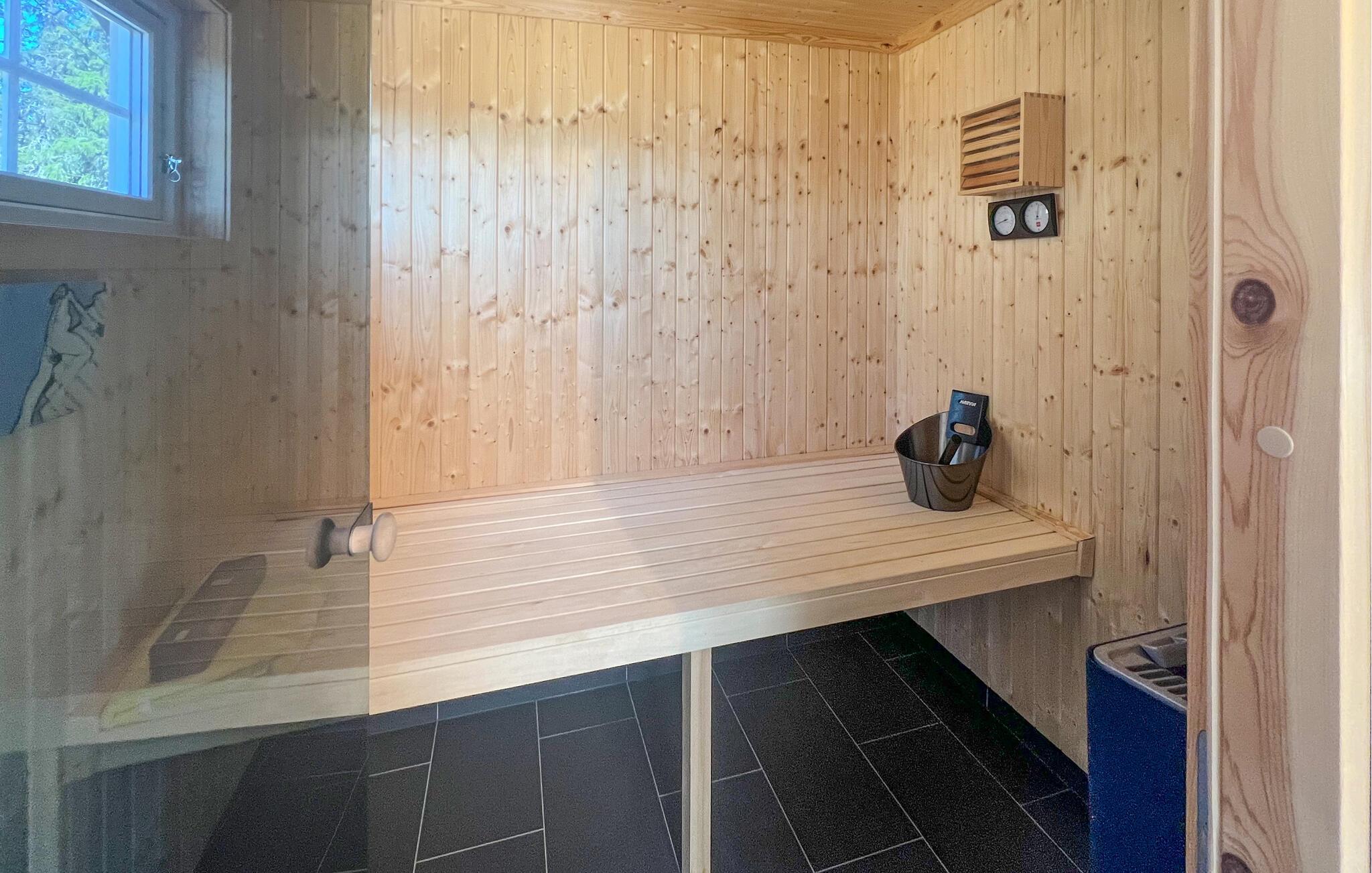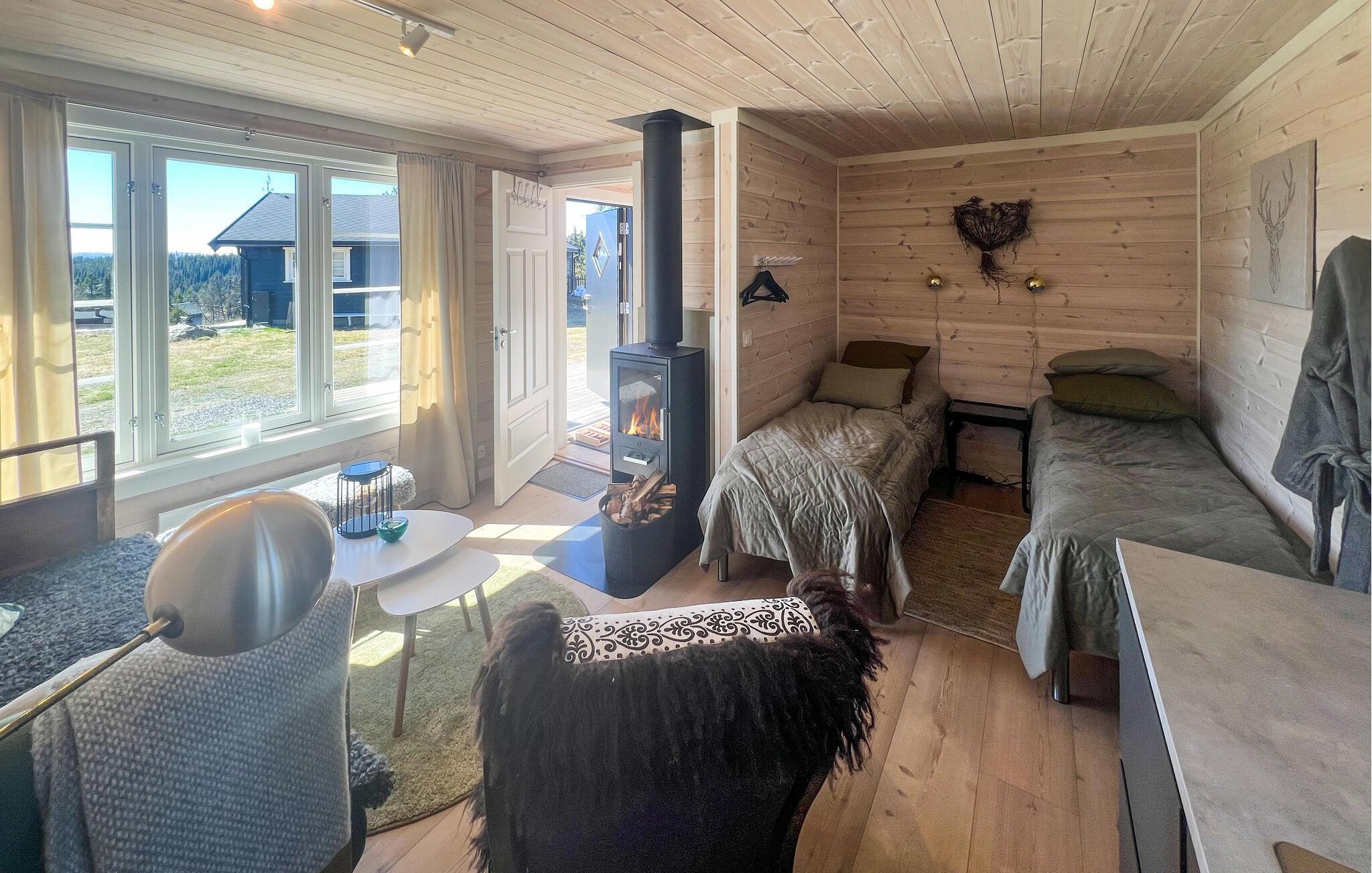 Lichtdurchfluteten Räume mit viel Holz schaffen eine warme Atmosphäre und reichlich skandinavische Gemütlichkeit im Innenbereich dieses einladenden Ferienhauses. Entspannen Sie auf der Couch am knisternden Kamin oder genießen Sie die Mahlzeiten, die Sie in der gut ausgestatteten Küche zubereitet haben. Die großen Fenster bieten eine herrliche Aussicht auf die umliegende Natur und sorgen für ein Gefühl der Ruhe und Weite.