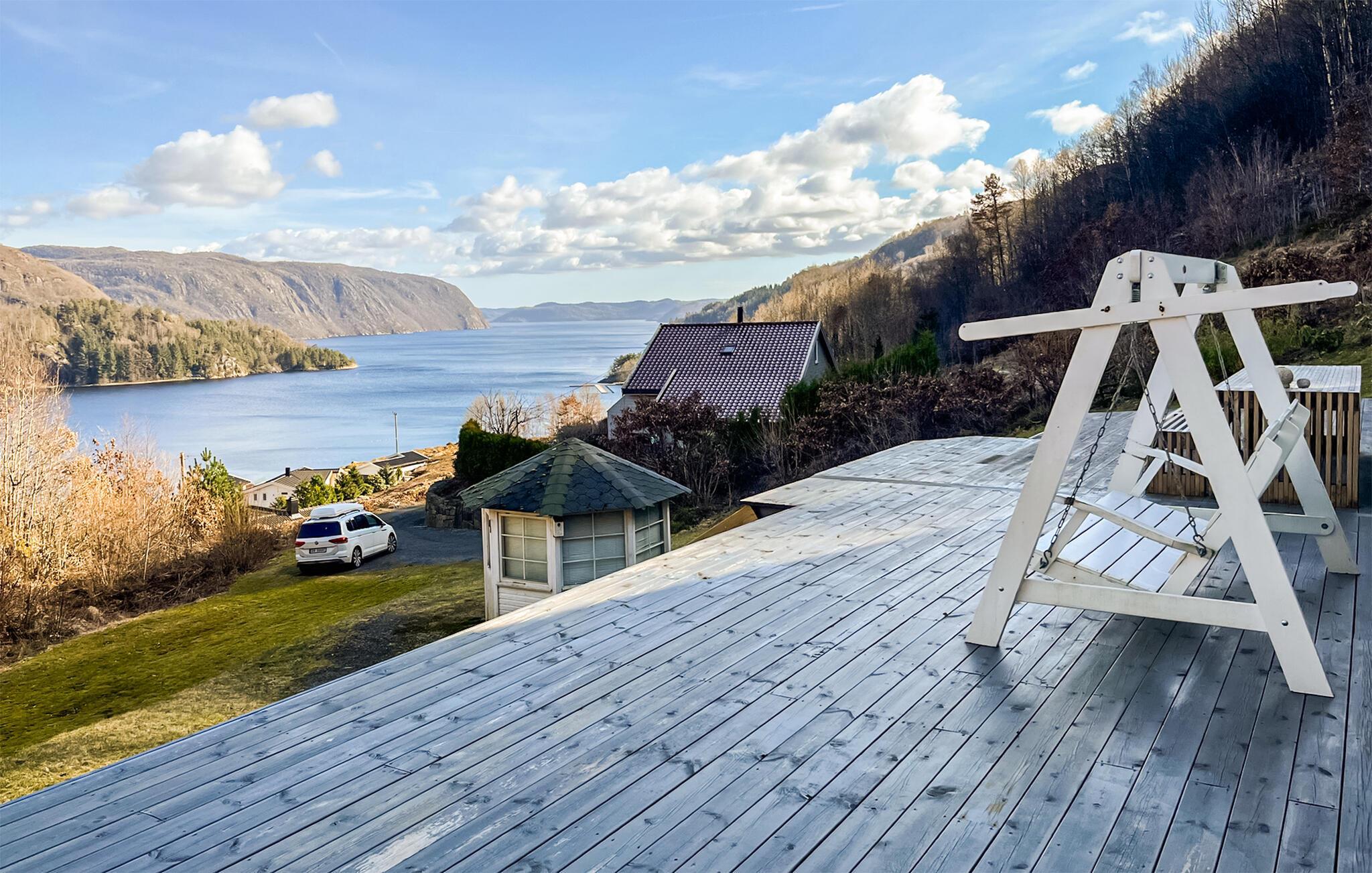 Treten Sie hinaus auf die großzügige, überdachte Terrasse und atmen Sie die frische norwegische Luft ein. Lassen Sie sich auf den bequemen Gartenmöbeln nieder, genießen Sie Ihr Frühstück mit Blick auf das Wasser oder veranstalten Sie hier gesellige Grillabende. Der kleine Pavillon auf dem Grundstück bietet eine weitere Rückzugsmöglichkeit.