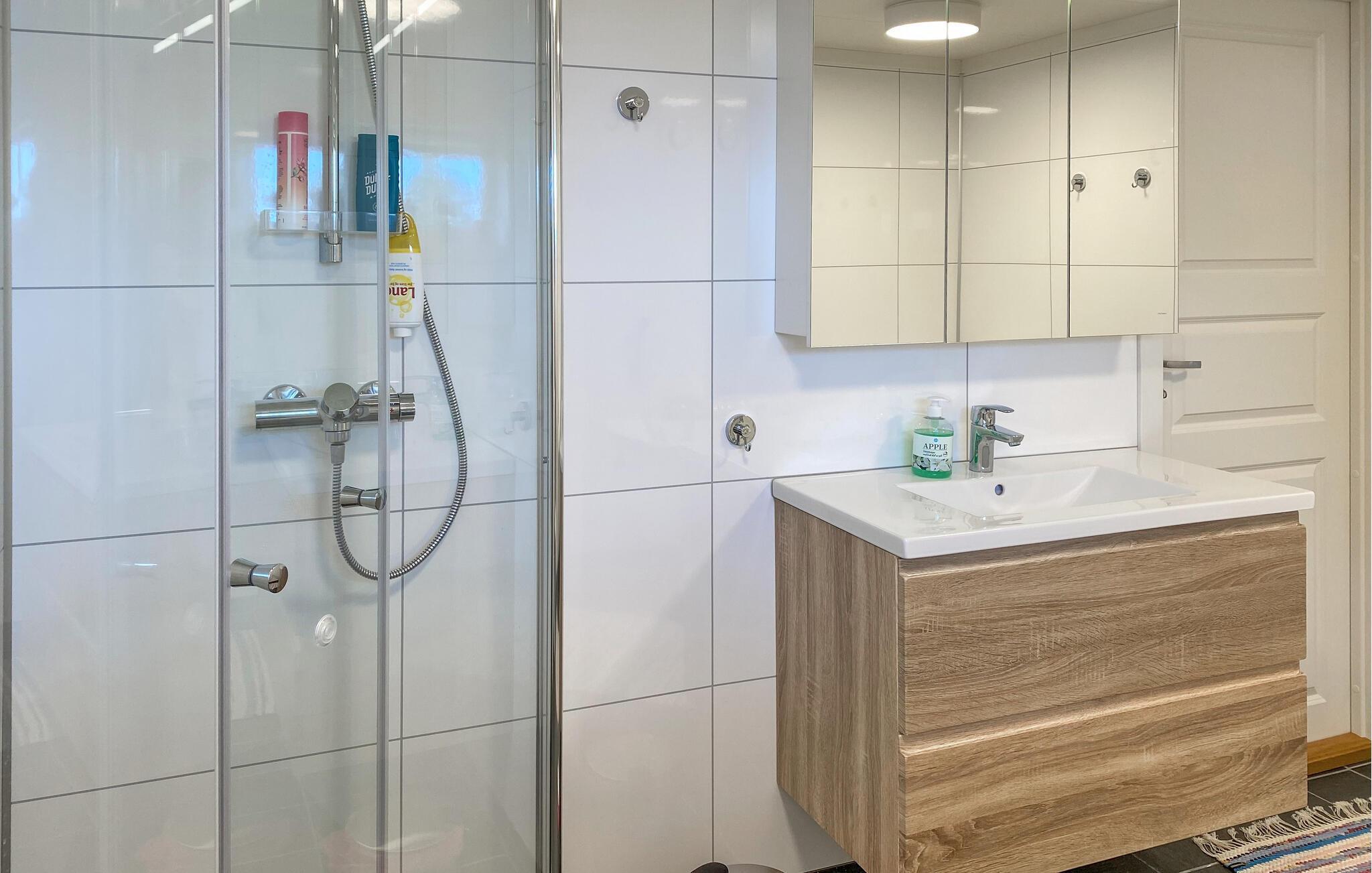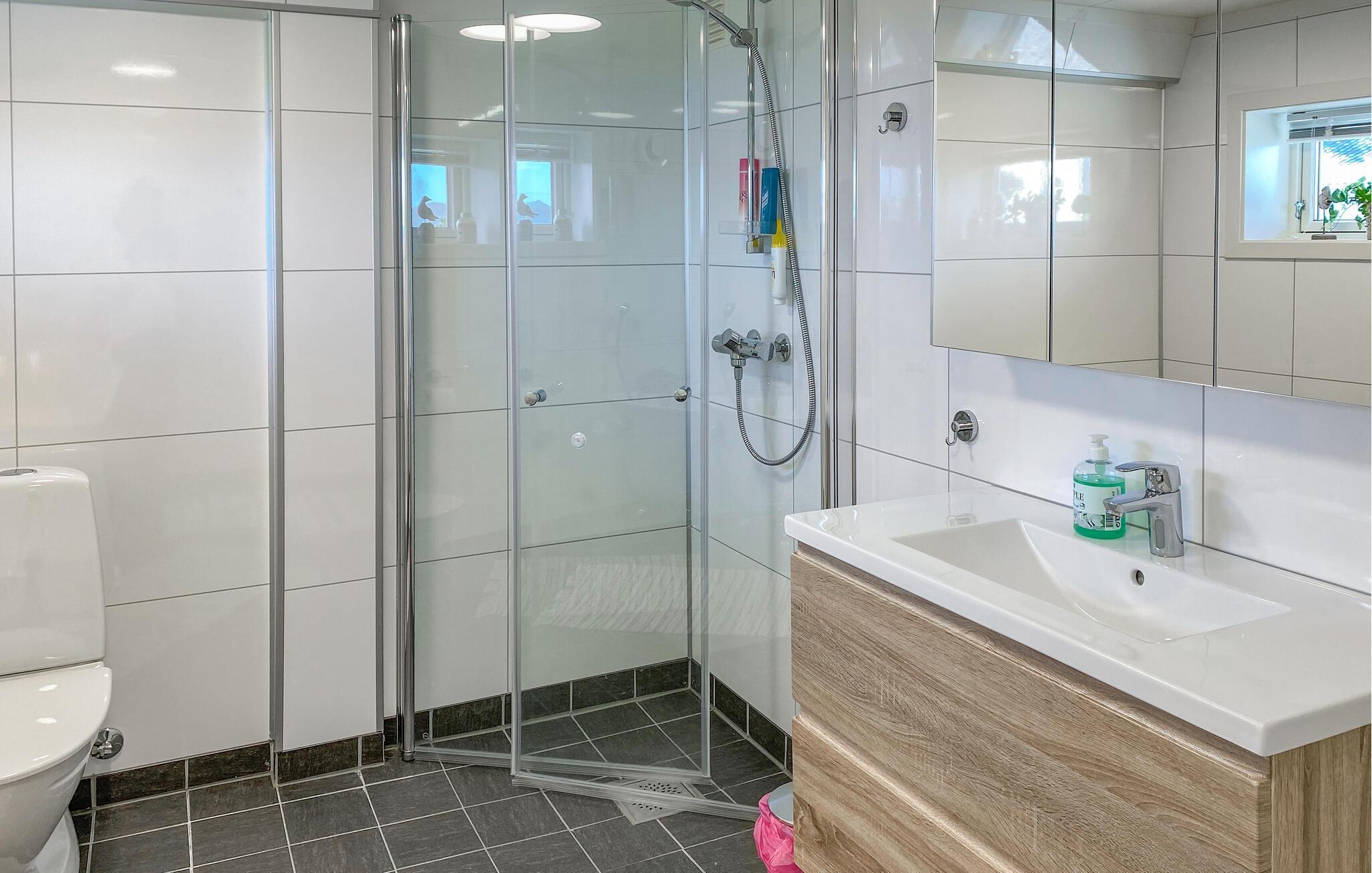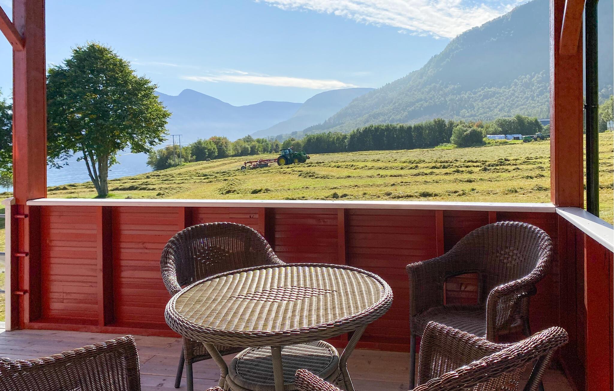 Auf der überdachten Terrasse, ausgestattet mit einem Tisch und komfortablen Stühlen, können Sie Ihre Morgenkaffees in der frischen Luft genießen und den Tag entspannt beginnen. Nutzen Sie die Gelegenheit für Wanderungen in der Umgebung oder mieten Sie ein Boot und erkunden Sie Ihre Urlaubsregion vom Wasser aus. Werfen Sie auch Ihre Angel ins Wasser und erleben Sie das Angeln in Norwegen. Die umliegende Natur bietet viele Möglichkeiten für Outdoor-Aktivitäten und sorgt für Entspannung und Erholung.