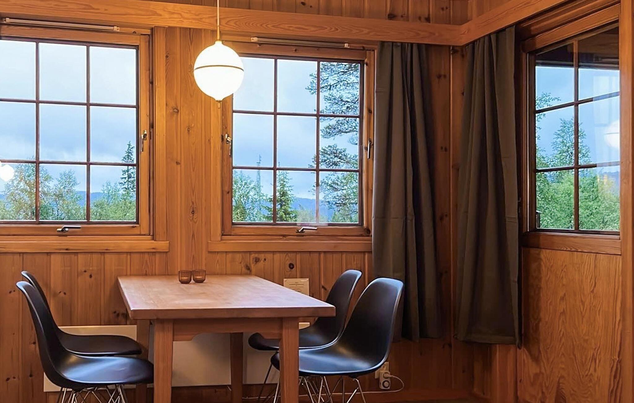 Der Innenbereich punktet mit seiner warmen Holzausstattung und einladendem Ambiente. Entspannen Sie im Wohnbereich und genießen Sie den Blick auf die Natur. Nutzen Sie den gemütlichen Essbereich für gemeinsame Mahlzeiten. Kochen Sie in der voll ausgestatteten Küche und lassen Sie den Abend in Ruhe ausklingen.