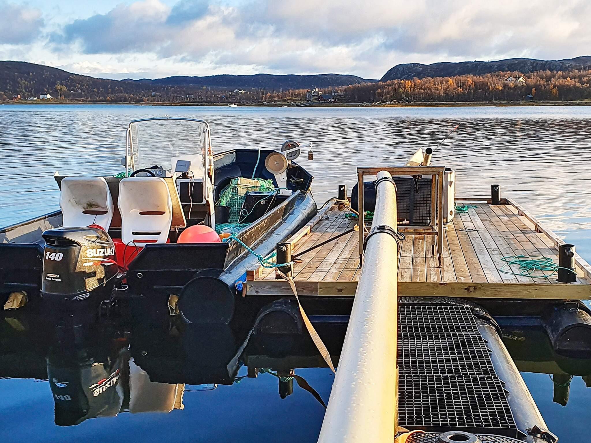 Die Boote liegen am Schwimmsteg vertäut. Filetierbank im Bootshaus mit fließend Wasser und Licht. Gefrierschrank für den Fang am Ferienhaus.