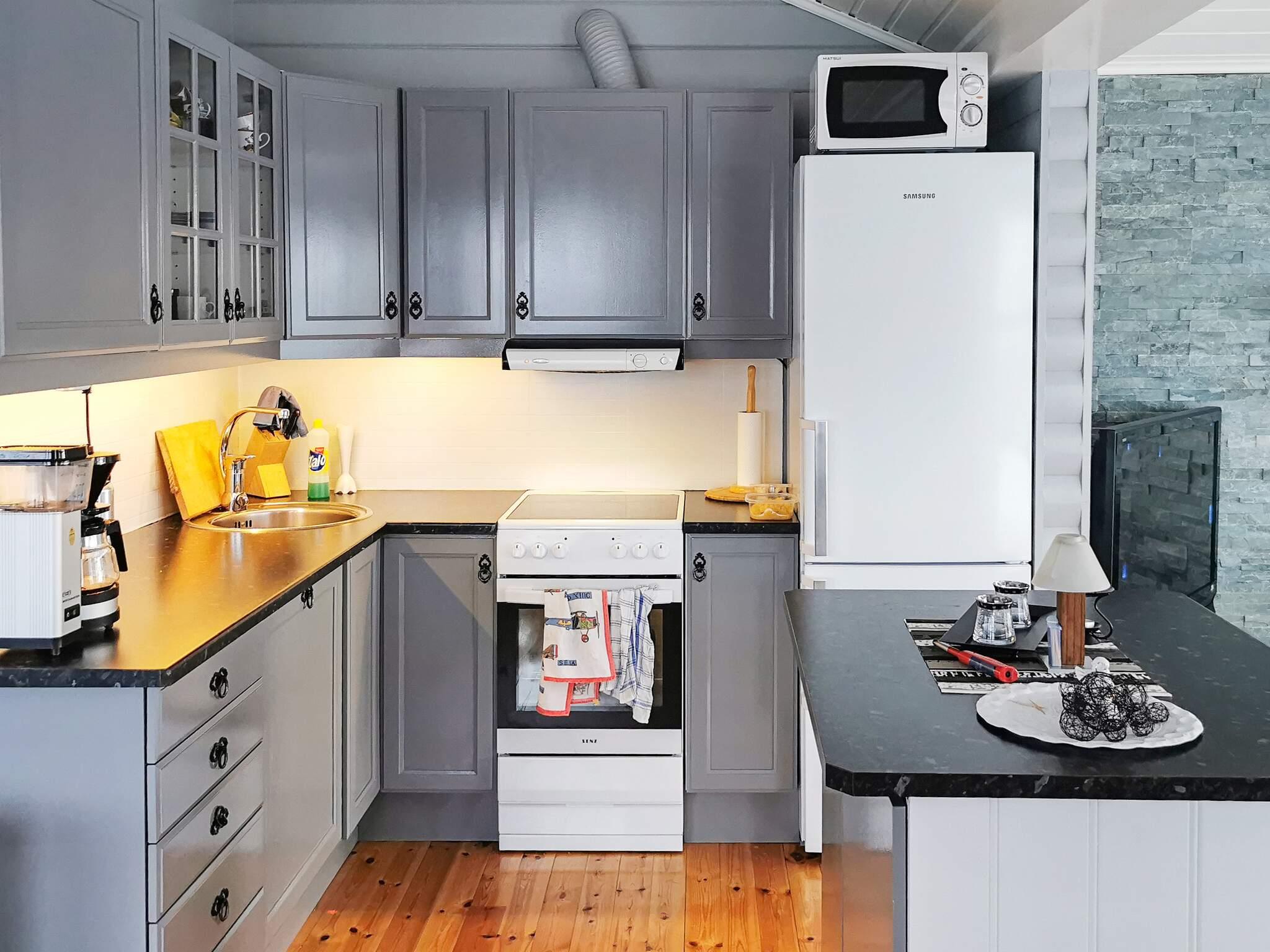 Im Haus wohnliche Einrichtung mit Kaminofen im offenen Küchen-/Wohnbereich für kühlere Abende. SAT-Empfänger mit deutschen TV-Sendern zur Auswahl. Kein WLAN-Empfang. In einem Schlafzimmer ist das Doppelbett 140 cm breit. Das zweite Schlafzimmer hat eine Familienkoje mit 120 cm breiter Doppelkoje unten und Einzelkoje (75 cm) darüber. Zugang zum dritten Schlafzimmer mit einem 90 cm breiten Bett nur von der überdachten Terrasse neben dem Haupteingang aus. Auf der Terrasse gibt es einen Holzkohlegrill sowie einen Gasgrill.