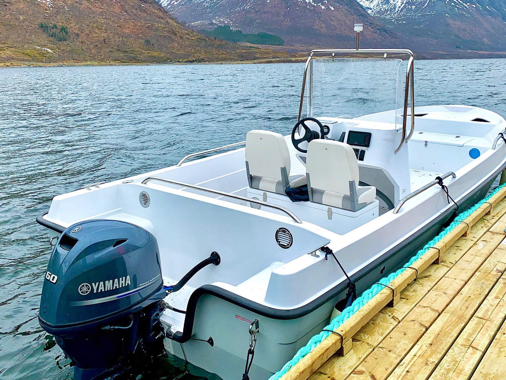 Das Boot liegt etwa 9 km vom Haus an einem Schwimmsteg im Bootshafen von Fiskebøl bereit.