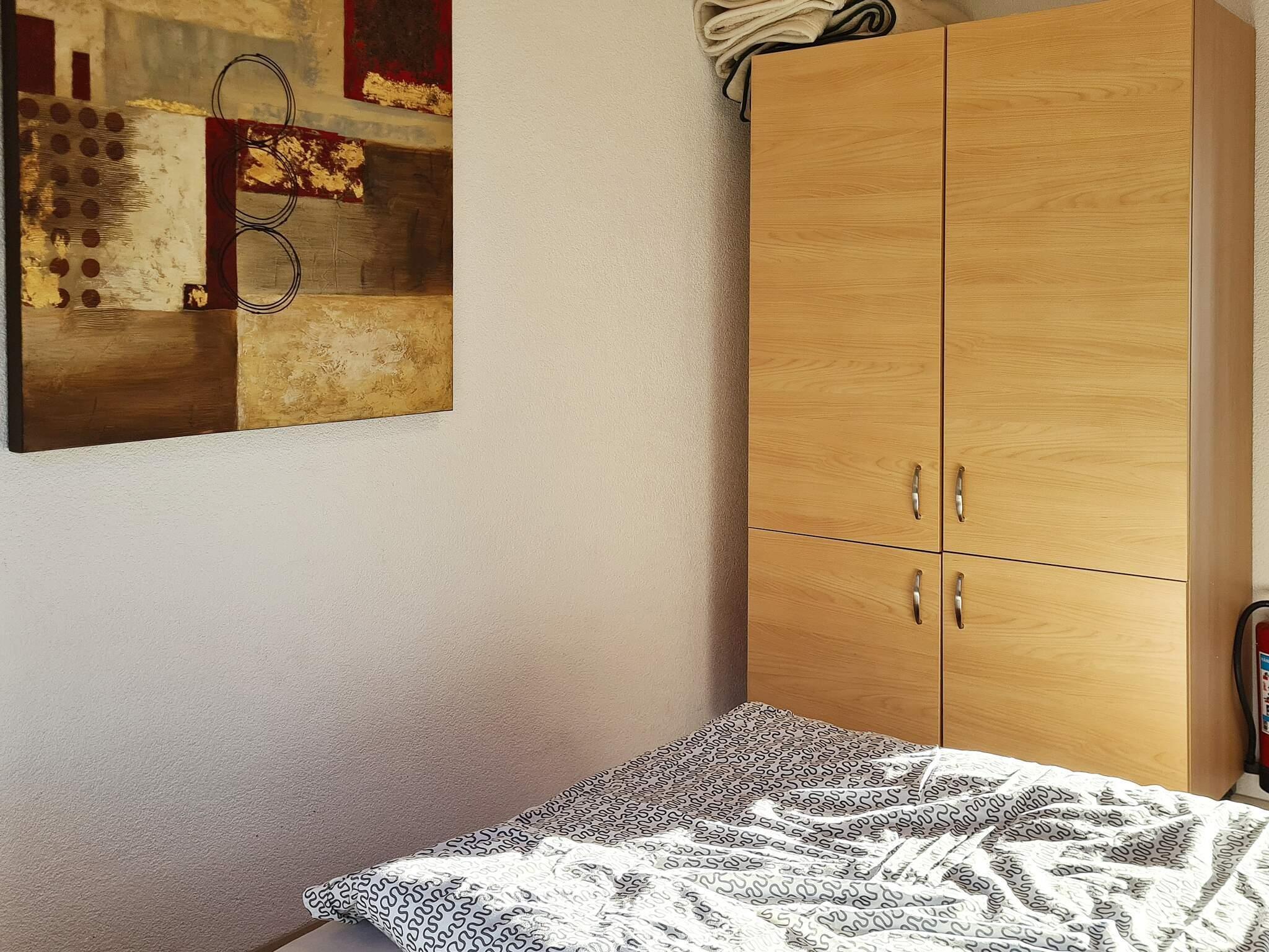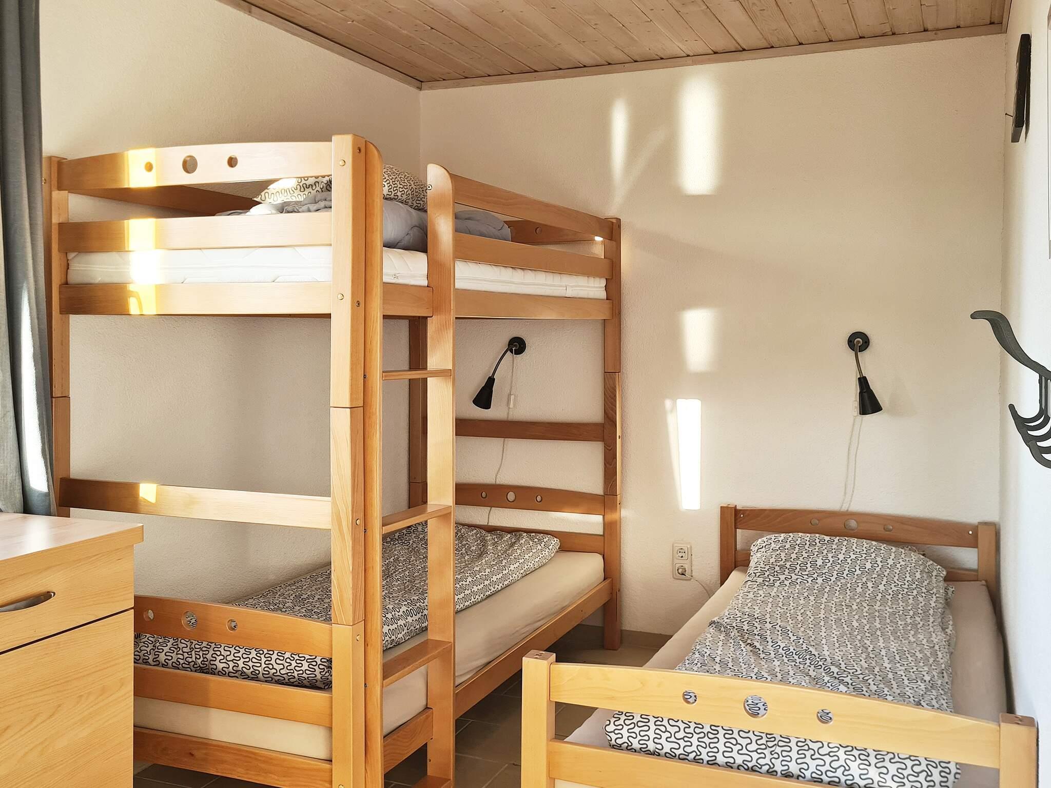 Vor dem Wohnzimmer gibt es eine überdachte Terrasse. Ein Schlafzimmer verfügt über ein Einzelbett und ein Etagenbett für 2 Personen, die Breite des Etagenbetts beträgt 90 cm.
