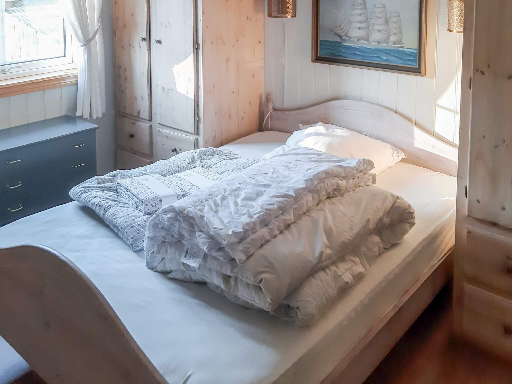 Die Ferienwohnung verfügt über 2 Schlafzimmer; eines im Untergeschoss, das andere im Erdgeschoss, beide mit Doppelbett. Zudem ist ein Kinderbett vorhanden. Für wohlige Wärme und Gemütlichkeit sorgt ein Holzofen, zusätzlich gibt es einen traditionellen Holzherd als Wärmequelle. Die Etagen des Einfamilienhauses werden einzeln vermietet. Vom Ferienhaus aus können Sie den schönen Blick auf das Meer genießen, insbesondere von der überdachten Terrasse mit Gartenmöbeln.