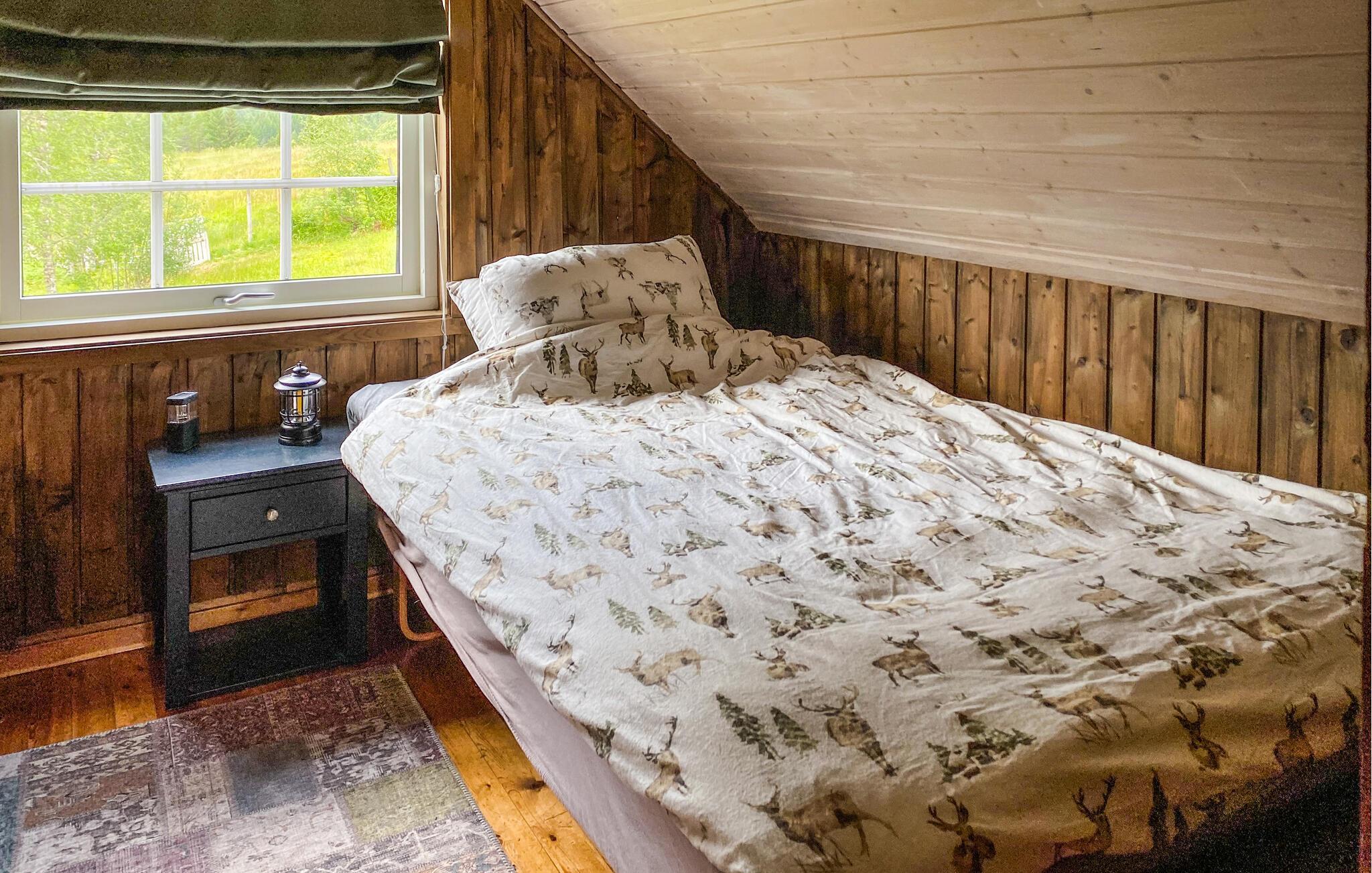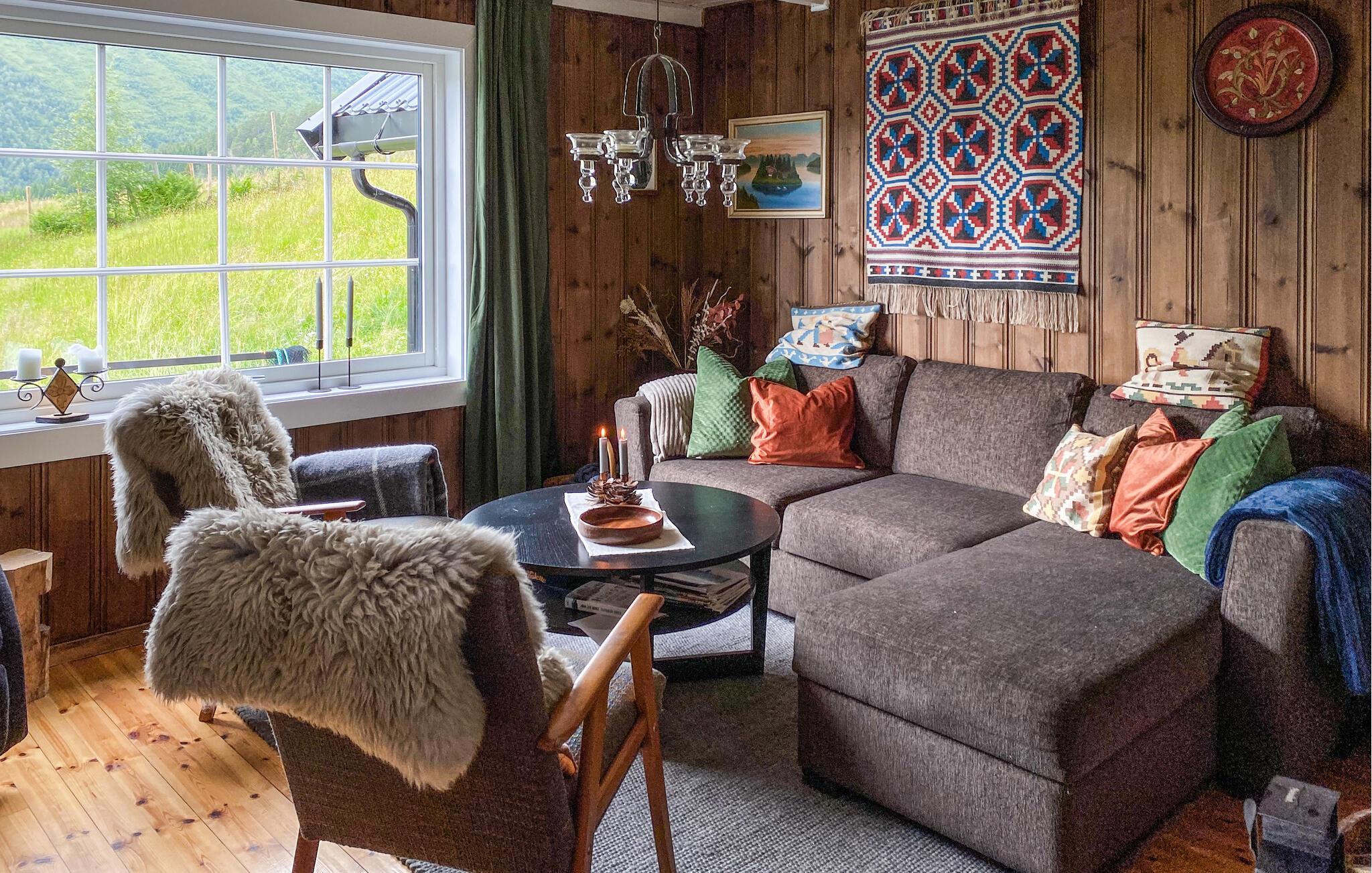 Verleben Sie Ihren nächsten Urlaub in diesem Ferienhaus am malerischen See Sætrevatnet. Vergessen Sie den Alltag und genießen Sie hier Ruhe und Erholung. Das gemütlich eingerichtete Wohnzimmer mit seinen warmen Holzwänden und liebevollen Details lädt zum Verweilen ein. Machen Sie es sich auf dem bequemen Sofa oder den übrigen urigen Sitzgelegenheiten bequem und genießen Sie die Ruhe, während Sie den Blick durch das große Fenster auf die grüne Landschaft schweifen lassen. Lassen Sie die Abende bei dem wärmenden Feuer im Kaminofen ausklingen.