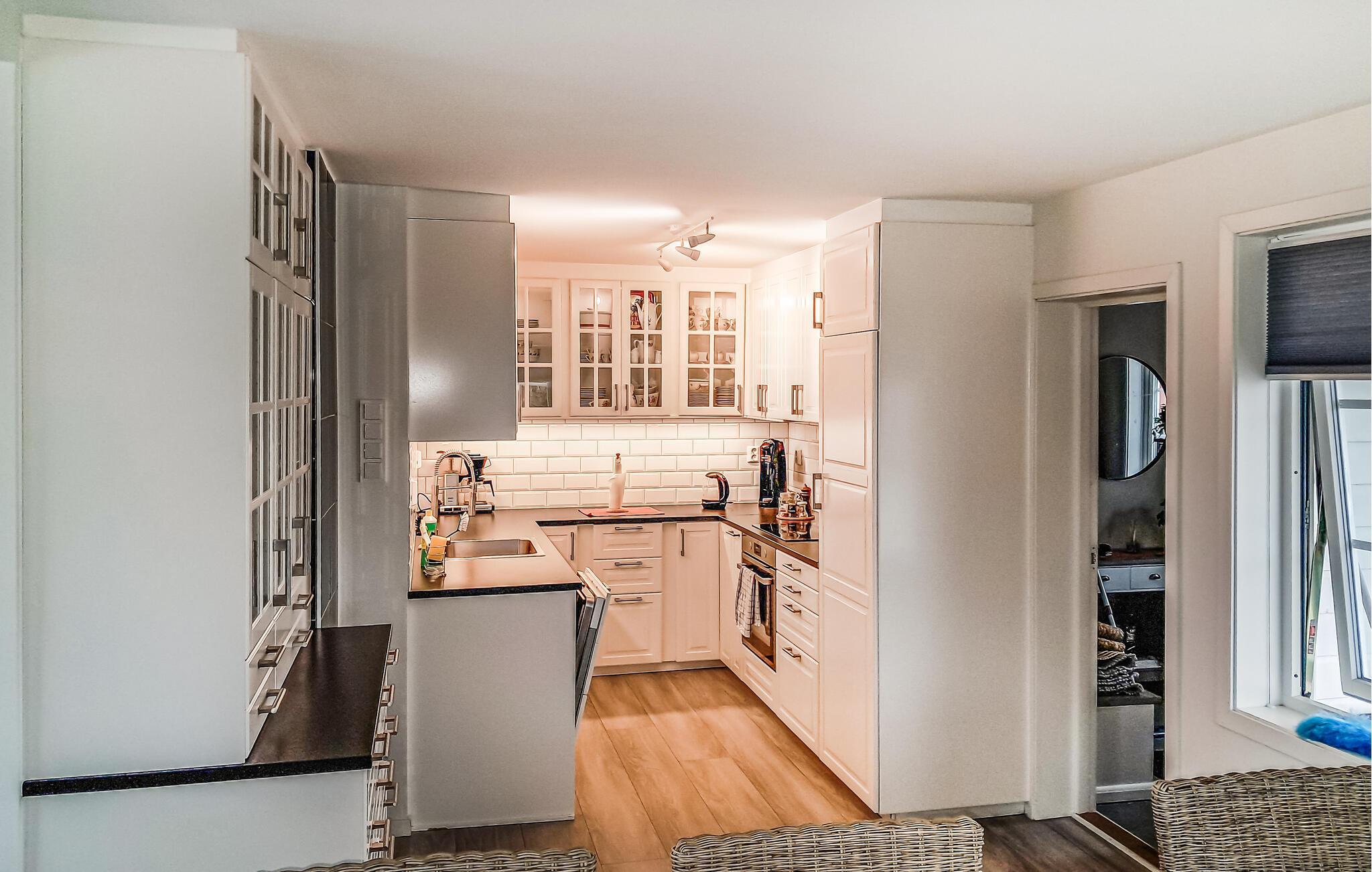 Erleben Sie Ruhe, Weite und Komfort in diesem geschmackvoll eingerichteten Ferienhaus. Die abgeschiedene Lage bietet ideale Bedingungen für alle, die Natur und Stille suchen, sei es zum Entspannen, Wandern oder Angeln. Das Innere des Hauses ist hell und gemütlich gestaltet. Nutzen Sie den offenen Wohnbereich mit großen Panoramafenstern für gemeinsame Stunden. Entspannen Sie sich in den bequemen Sesseln oder versammeln Sie sich zum Essen am großen Holztisch. Die hochwertigen Möbel und der klare Stil schaffen ein angenehmes Wohngefühl.