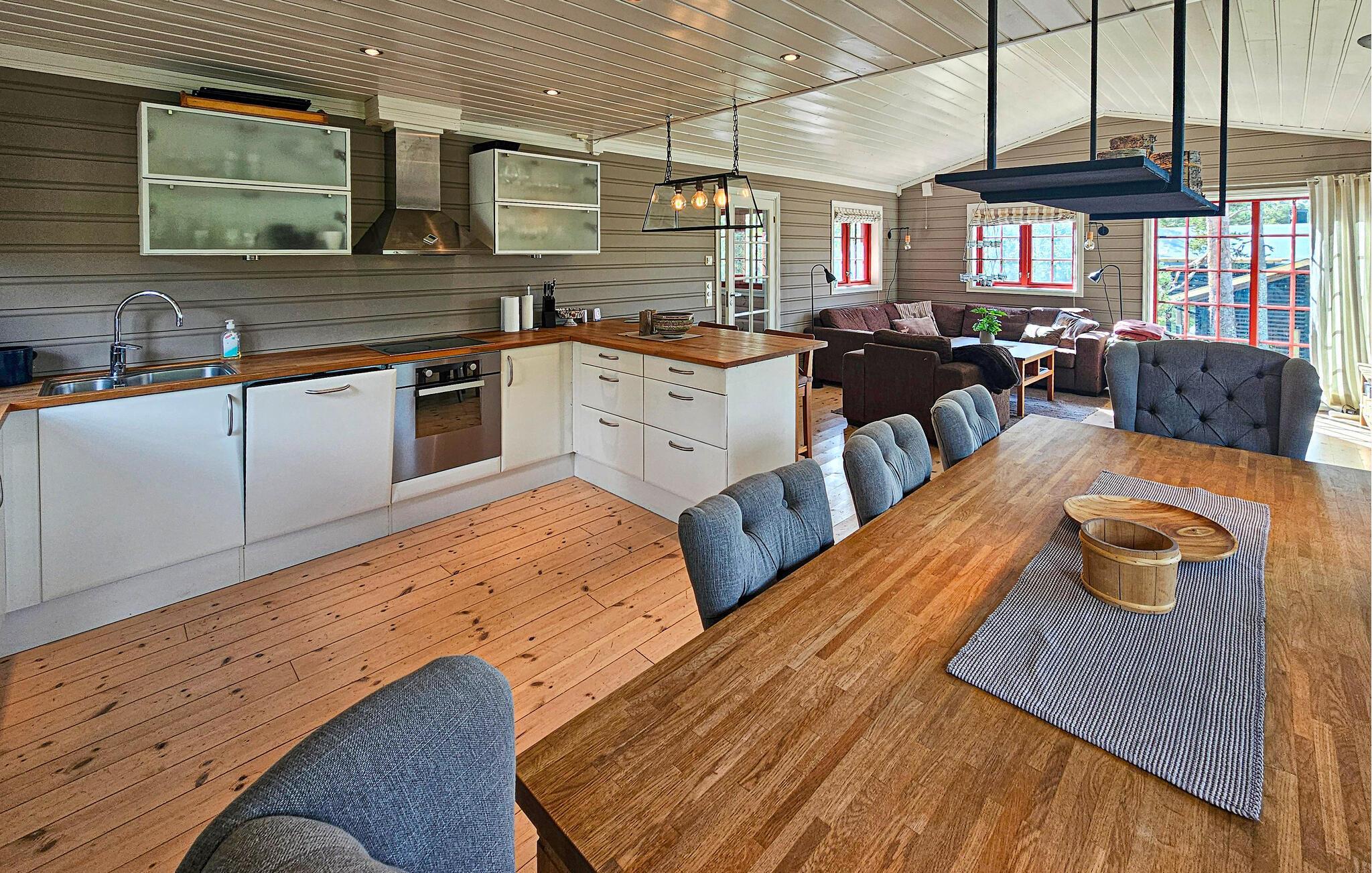 Die Einrichtung Ihres Ferienhauses mit Platz für zwei Familien kombiniert warme Holzelemente mit modernen Details und sorgt für eine einladende Atmosphäre. Verbringen Sie erholsame Stunden im Wohnbereich mit Sofalandschaft, Kamin und Fernseher. Kochen Sie in der modernen Küche mit viel Arbeitsfläche und einem langen Esstisch für gemeinsame Mahlzeiten oder gesellige Spieleabende. Eine weitere Rückzugsmöglichkeit finden Sie in einem zusätzlichen Wohnraum im Obergeschoss, der ideal für entspannte Momente geeignet ist. Entspannen Sie nach einem aktiven Tag in der Sauna und lassen Sie Körper und Geist zur Ruhe kommen.