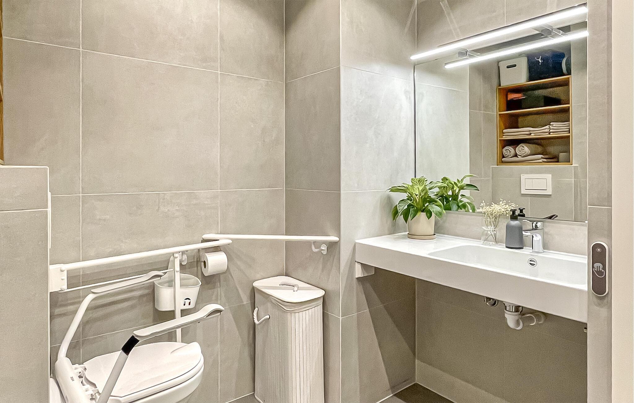 Genießen Sie sonnige Stunden auf dem Balkon. Nehmen Sie Platz in den gepolsterten Stühlen und lassen Sie den Blick über die Dächer der Stadt schweifen. Die Wohnung ist barrierefrei zugänglich und verfügt über einen rollstuhlgerechten Zugang sowie einen Behindertenparkplatz direkt vor dem Gebäude.