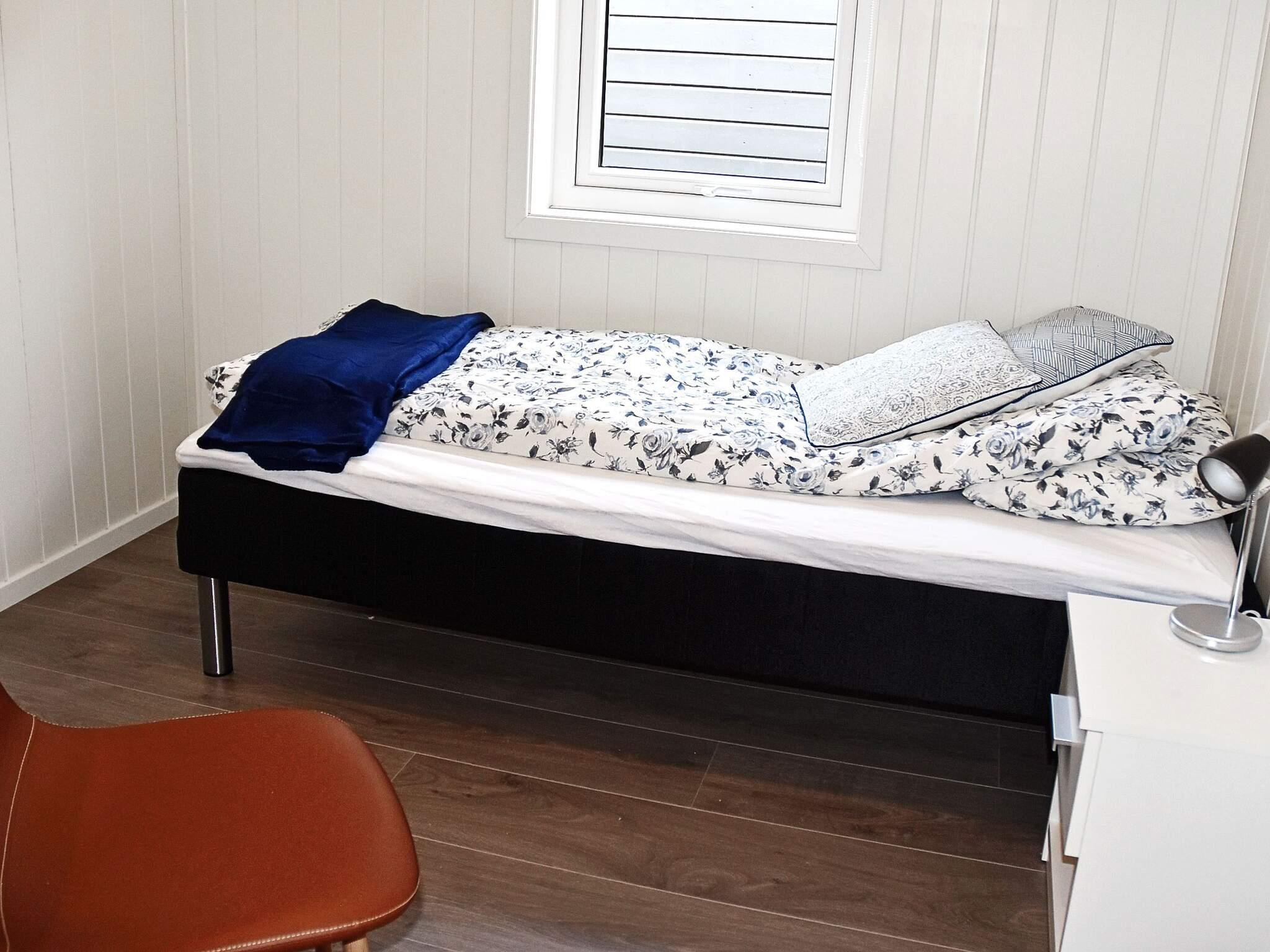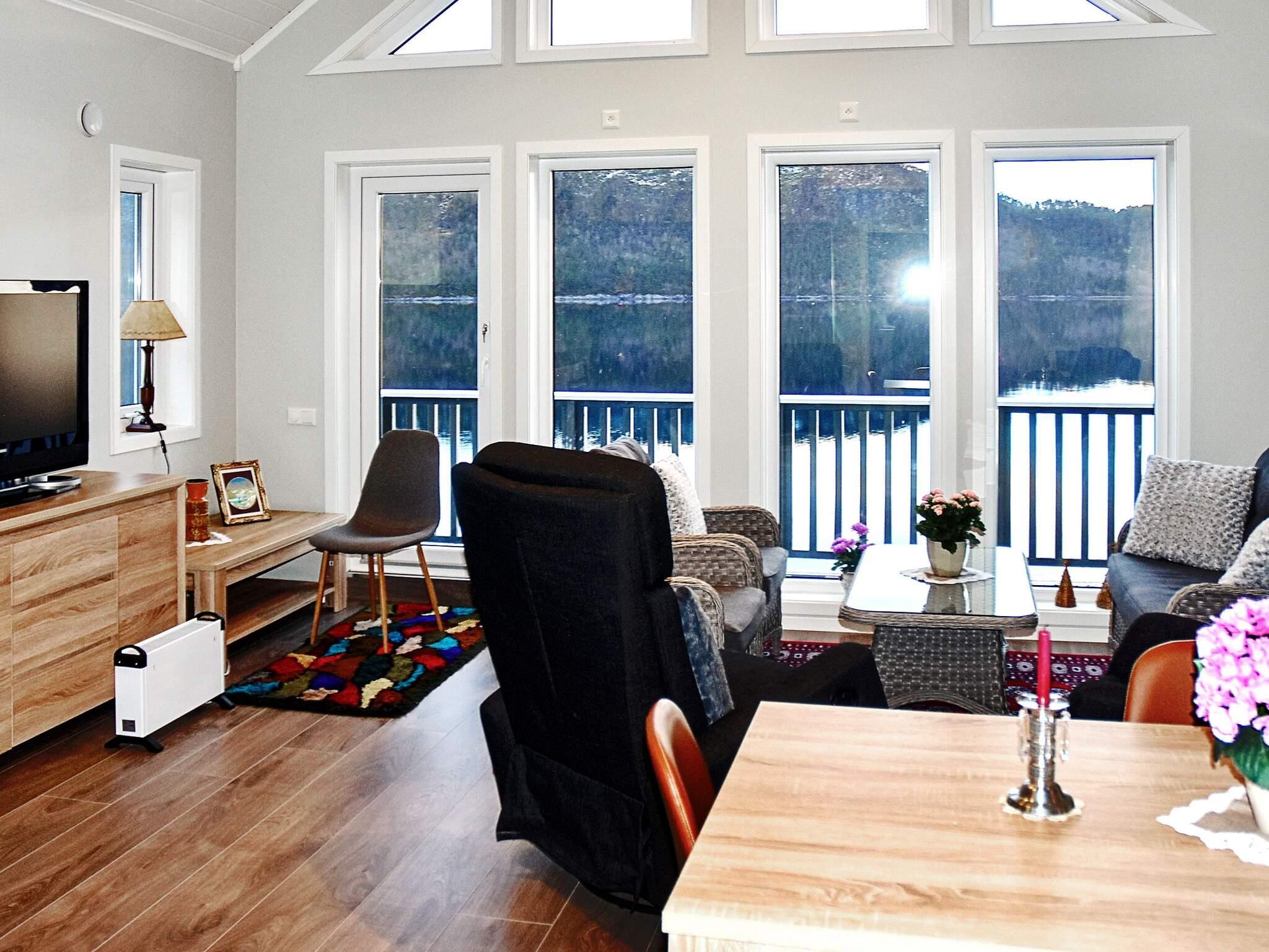 In der unteren Etage befindet sich ein großer Aufenthaltsbereich, dessen eine Seitenwand zur Fjordseite hin weit geöffnet werden kann, um diese Fläche quasi als Veranda nutzen zu können. In den Schlafzimmern mit zwei Einzelbetten können diese auch als Doppelbett genutzt werden. Zudem gibt es ein Schlafzimmer mit 120 cm breitem Einzelbett.