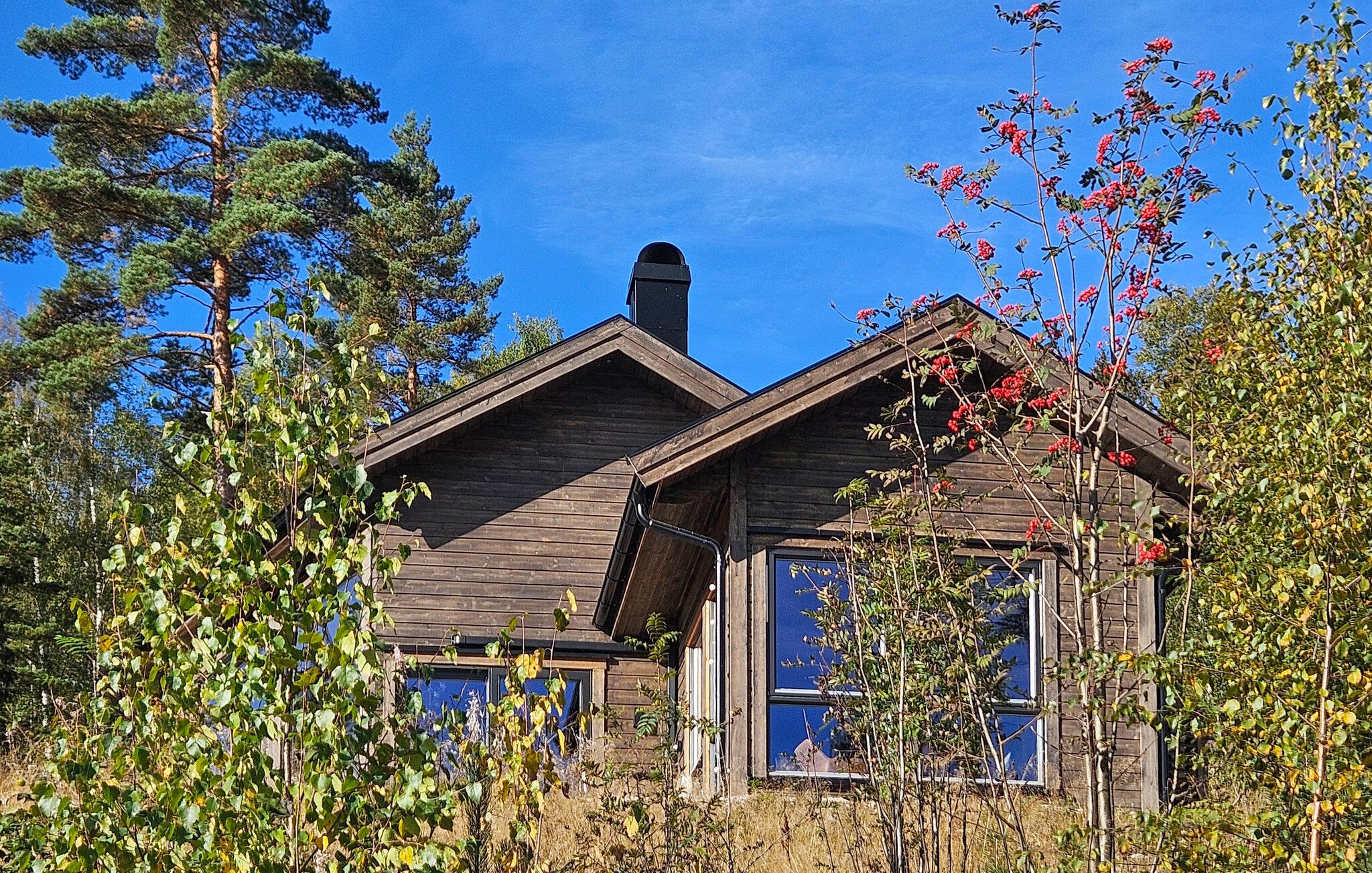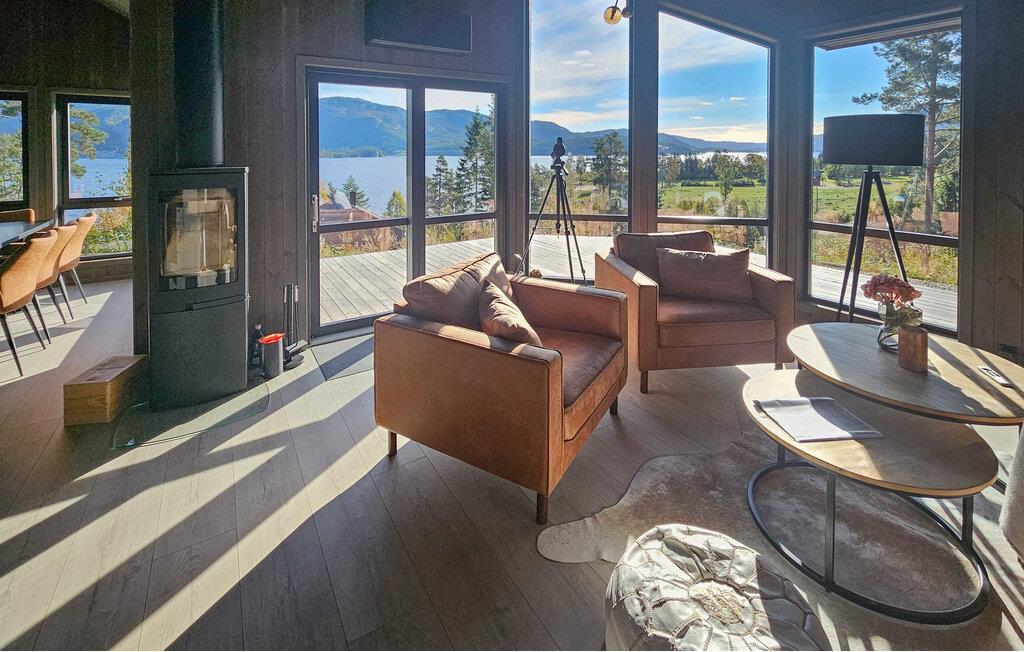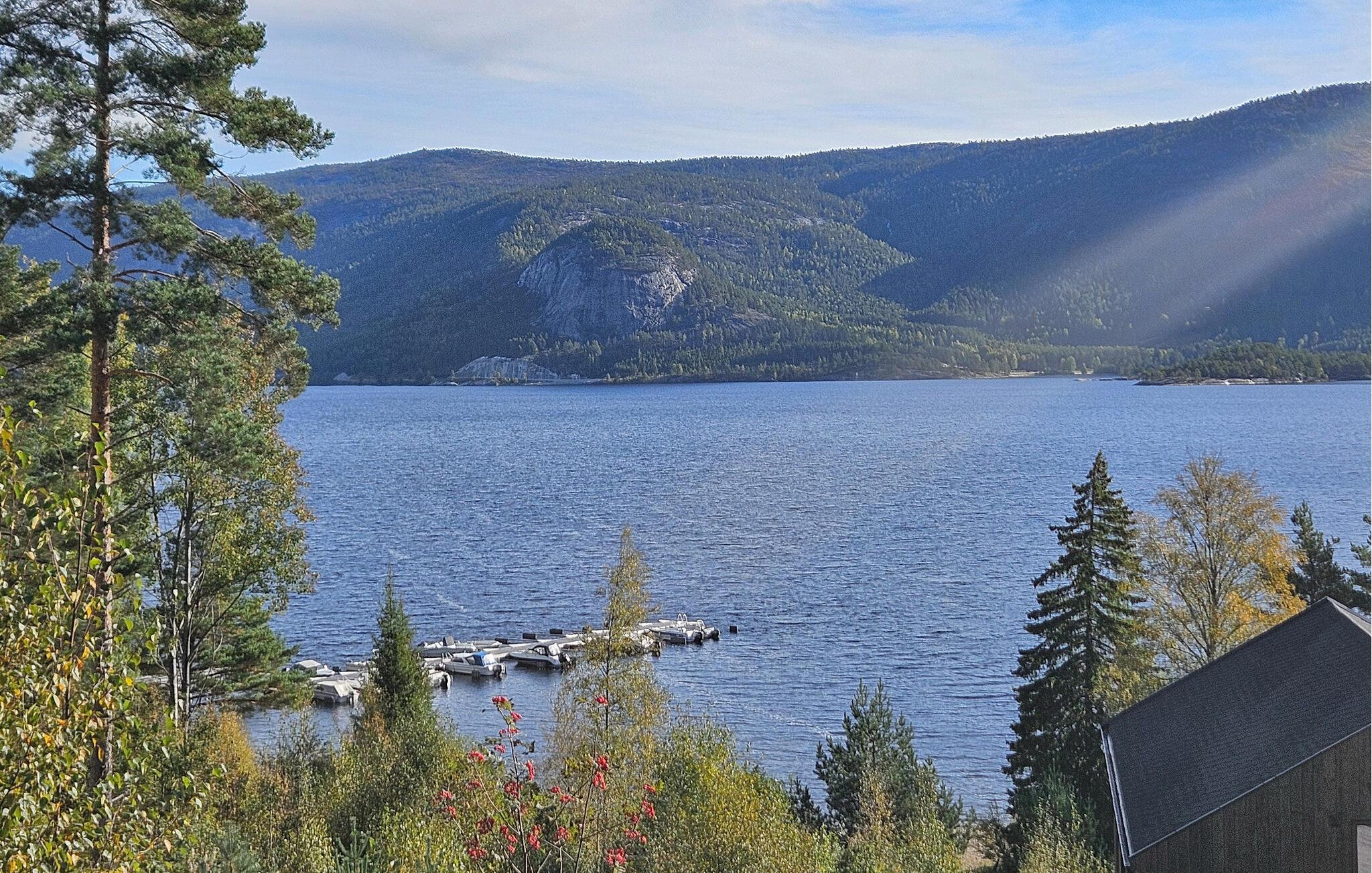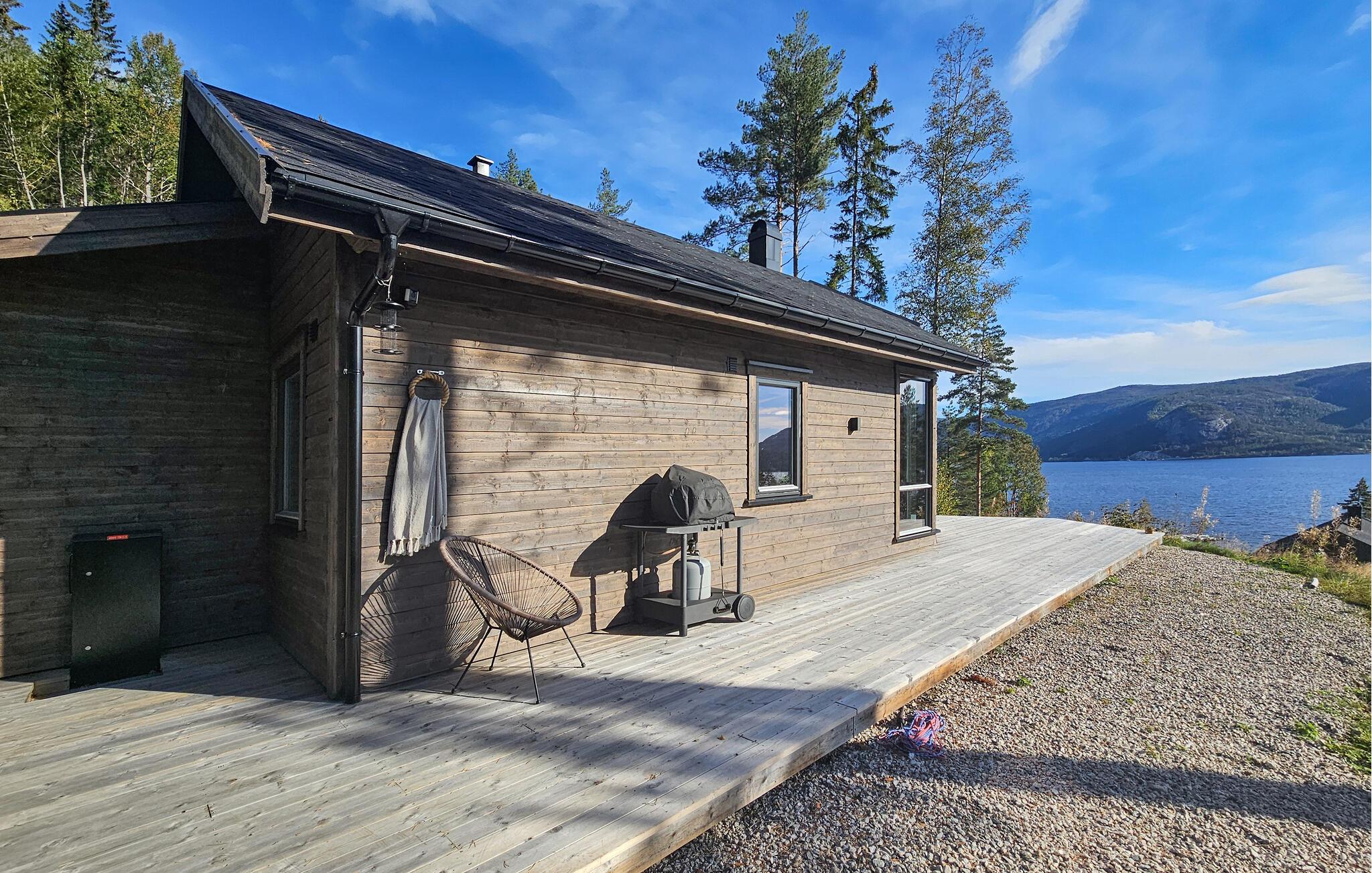 Entdecken Sie dieses moderne und gemütliche Ferienhaus in der Nähe von Treungen. Umgeben von malerischen Wäldern und mit Blick auf den See Nisser bietet das Haus eine idyllische Kulisse, die zum Entspannen einlädt. Genießen Sie die Ruhe auf der großzügigen Terrasse, während Sie den Panoramablick auf den See bewundern. Lassen Sie den Alltag hinter sich und starten Sie den Tag mit einem gemütlichen Frühstück im lichtdurchfluteten Wohnbereich. Der Kaminofen sorgt an kühlen Abenden für eine wohlige Atmosphäre, während die komfortablen Sitzgelegenheiten zu entspannten Stunden einladen. Bereiten Sie Ihre Mahlzeiten in der voll ausgestatteten Küche zu und genießen Sie diese am Esstisch mit Blick auf die beeindruckende Natur.