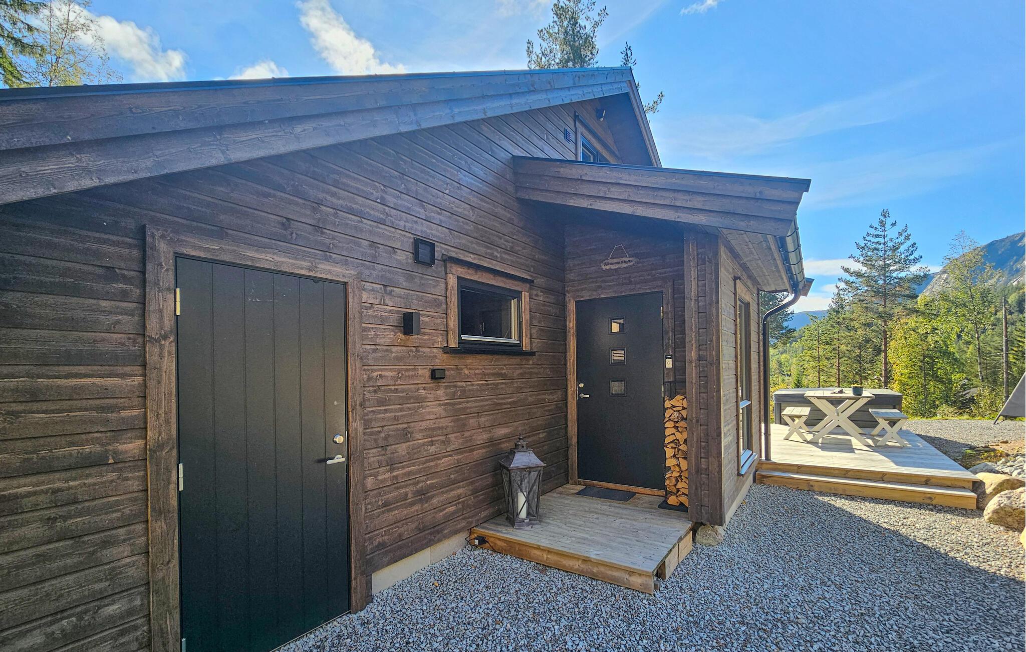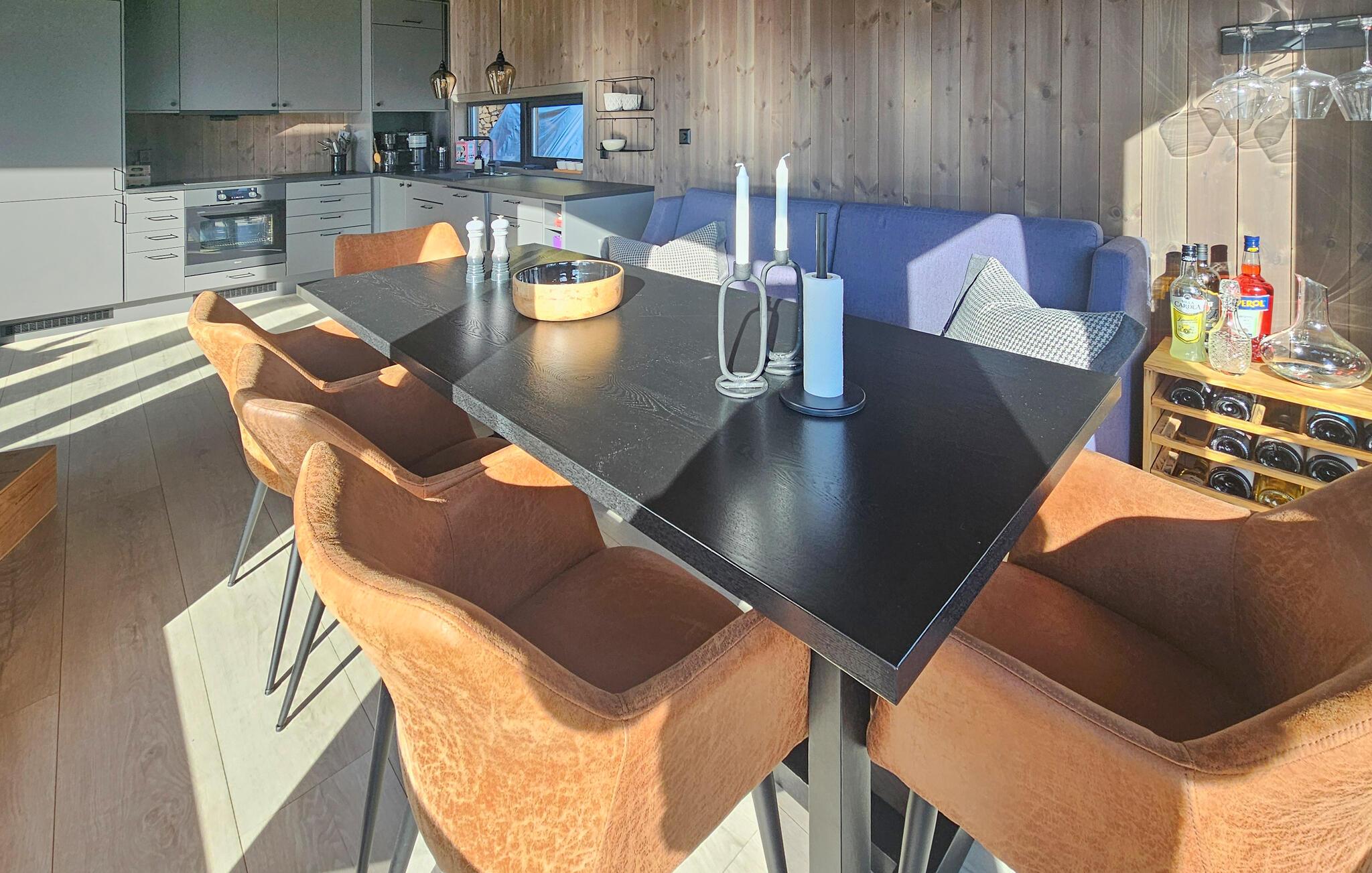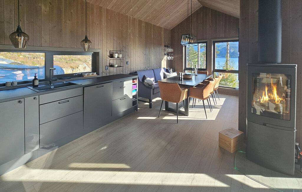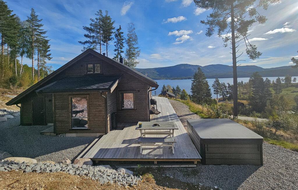 Entdecken Sie dieses moderne und gemütliche Ferienhaus in der Nähe von Treungen. Umgeben von malerischen Wäldern und mit Blick auf den See Nisser bietet das Haus eine idyllische Kulisse, die zum Entspannen einlädt. Genießen Sie die Ruhe auf der großzügigen Terrasse, während Sie den Panoramablick auf den See bewundern. Lassen Sie den Alltag hinter sich und starten Sie den Tag mit einem gemütlichen Frühstück im lichtdurchfluteten Wohnbereich. Der Kaminofen sorgt an kühlen Abenden für eine wohlige Atmosphäre, während die komfortablen Sitzgelegenheiten zu entspannten Stunden einladen. Bereiten Sie Ihre Mahlzeiten in der voll ausgestatteten Küche zu und genießen Sie diese am Esstisch mit Blick auf die beeindruckende Natur.