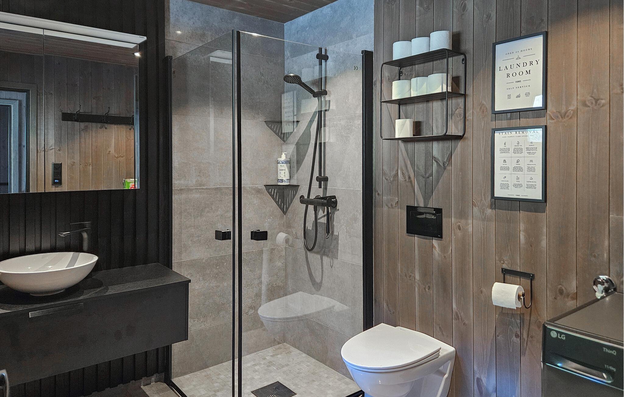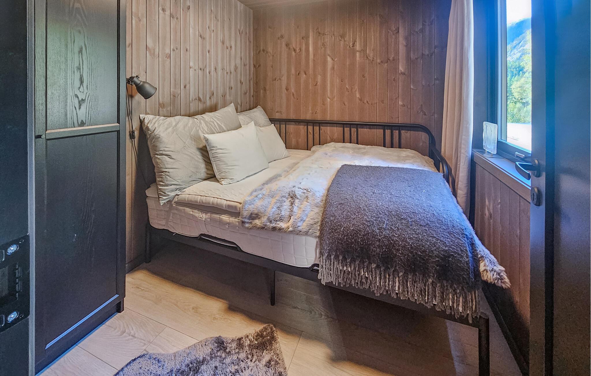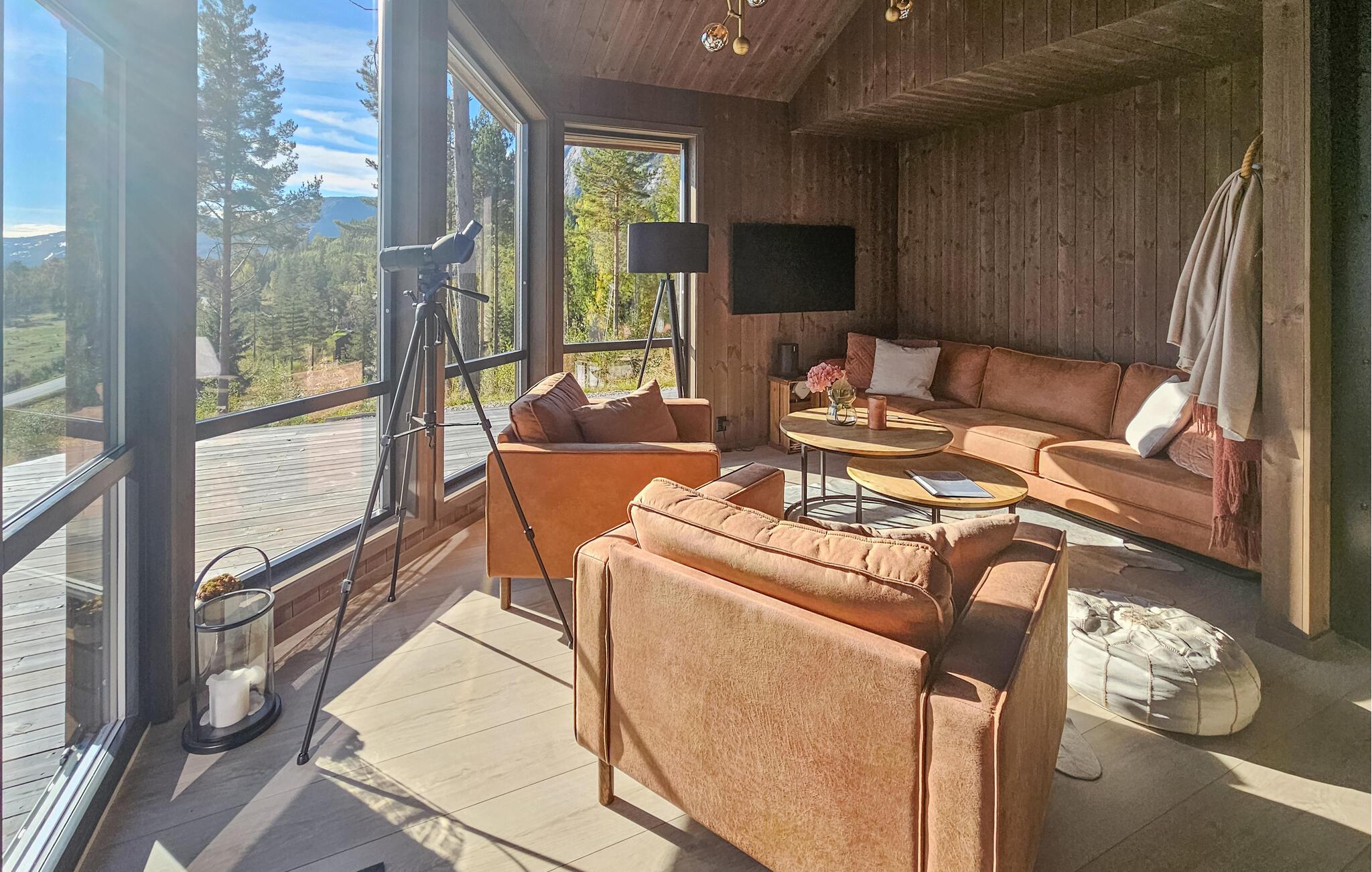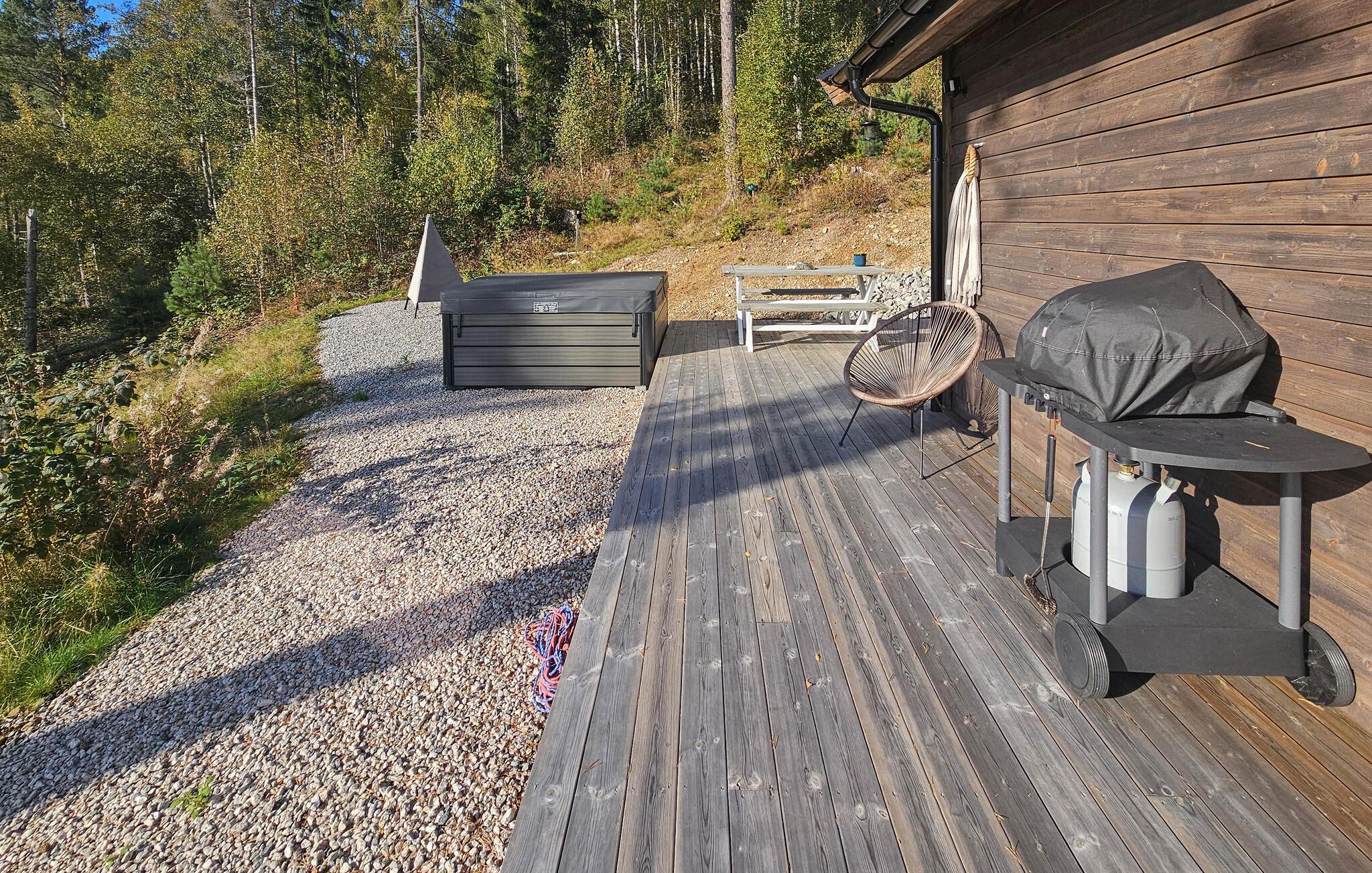 Entdecken Sie dieses moderne und gemütliche Ferienhaus in der Nähe von Treungen. Umgeben von malerischen Wäldern und mit Blick auf den See Nisser bietet das Haus eine idyllische Kulisse, die zum Entspannen einlädt. Genießen Sie die Ruhe auf der großzügigen Terrasse, während Sie den Panoramablick auf den See bewundern. Lassen Sie den Alltag hinter sich und starten Sie den Tag mit einem gemütlichen Frühstück im lichtdurchfluteten Wohnbereich. Der Kaminofen sorgt an kühlen Abenden für eine wohlige Atmosphäre, während die komfortablen Sitzgelegenheiten zu entspannten Stunden einladen. Bereiten Sie Ihre Mahlzeiten in der voll ausgestatteten Küche zu und genießen Sie diese am Esstisch mit Blick auf die beeindruckende Natur.