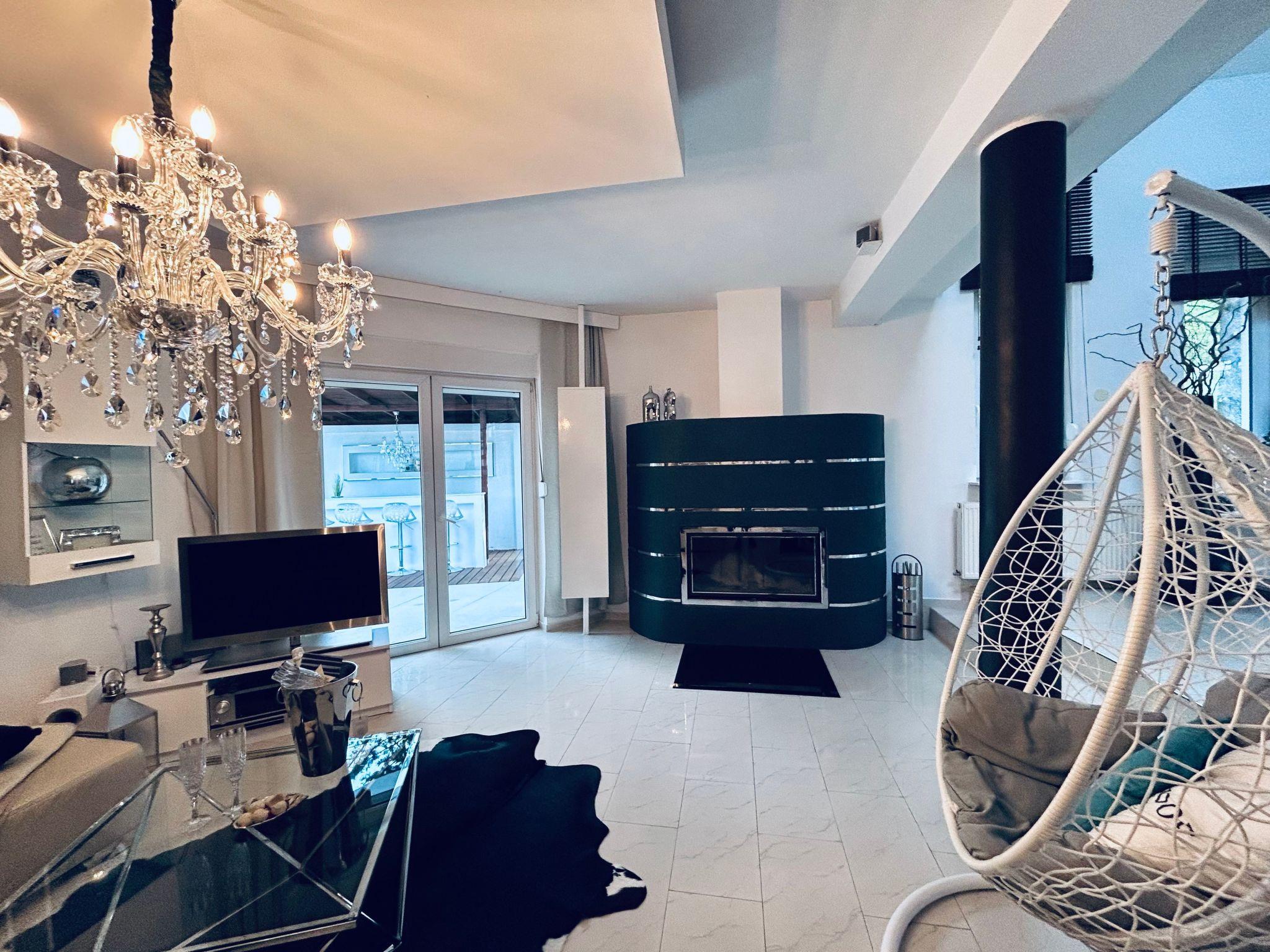 Inside, you will find an exclusive interior that leaves nothing to be desired. The light-flooded living room with modern leather sofa and fireplace promises cosy evenings, while a fully equipped kitchen with lounge bar invites you to linger. There is also a modern bathroom on the ground floor. The two cosy bedrooms on the upper floor and the impressive interior balcony not only offer priceless views, but also a retreat for rest and relaxation. Modern architecture, high-quality designer furniture and a 5.1 home cinema system round off the interior experience.