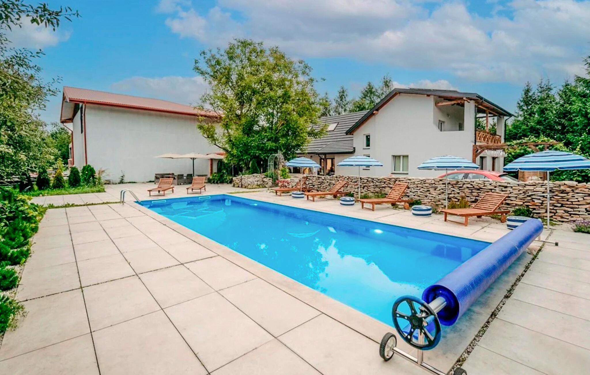 Genießen Sie den Urlaub im attraktiven Ferienhaus mit Pool und Wellness im Freien.
