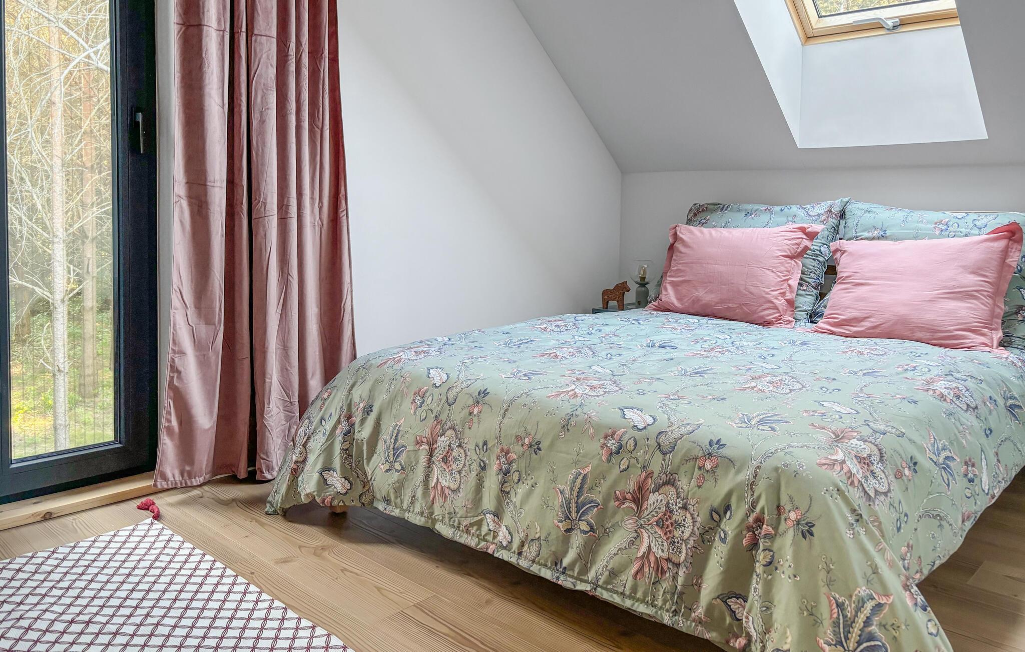 Morgens gibt es an der Küchentheke die erste Tasse Kaffee des Tages. Tauschen Sie sich hier schon über die Pläne des kommenden Urlaubstages aus. Und freuen Sie sich dann auf ein entspanntes Frühstück am Esstisch. Sie können auch auf der geräumigen Terrasse speisen und dabei die frische Luft und die Stille des Waldes genießen. Das stilvolle und gemütliche Design der Innenräume schafft eine angenehme Atmosphäre, die zum Verweilen auf dem bequemen Sofa und den modernen Möbeln einlädt. Durch die hohen Fenster haben Sie einen herrlichen Blick auf die umliegende Natur.