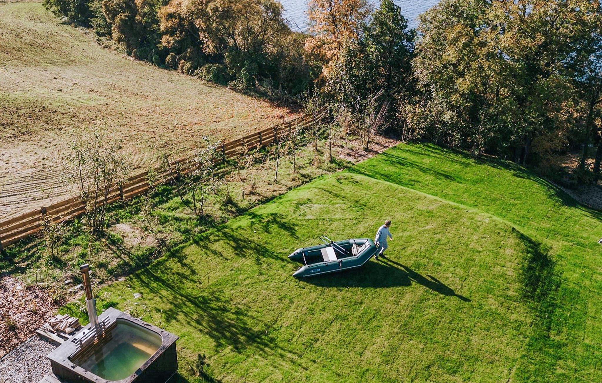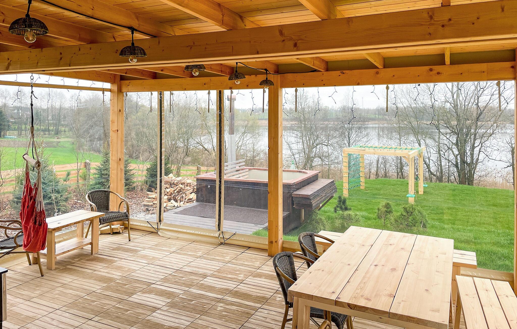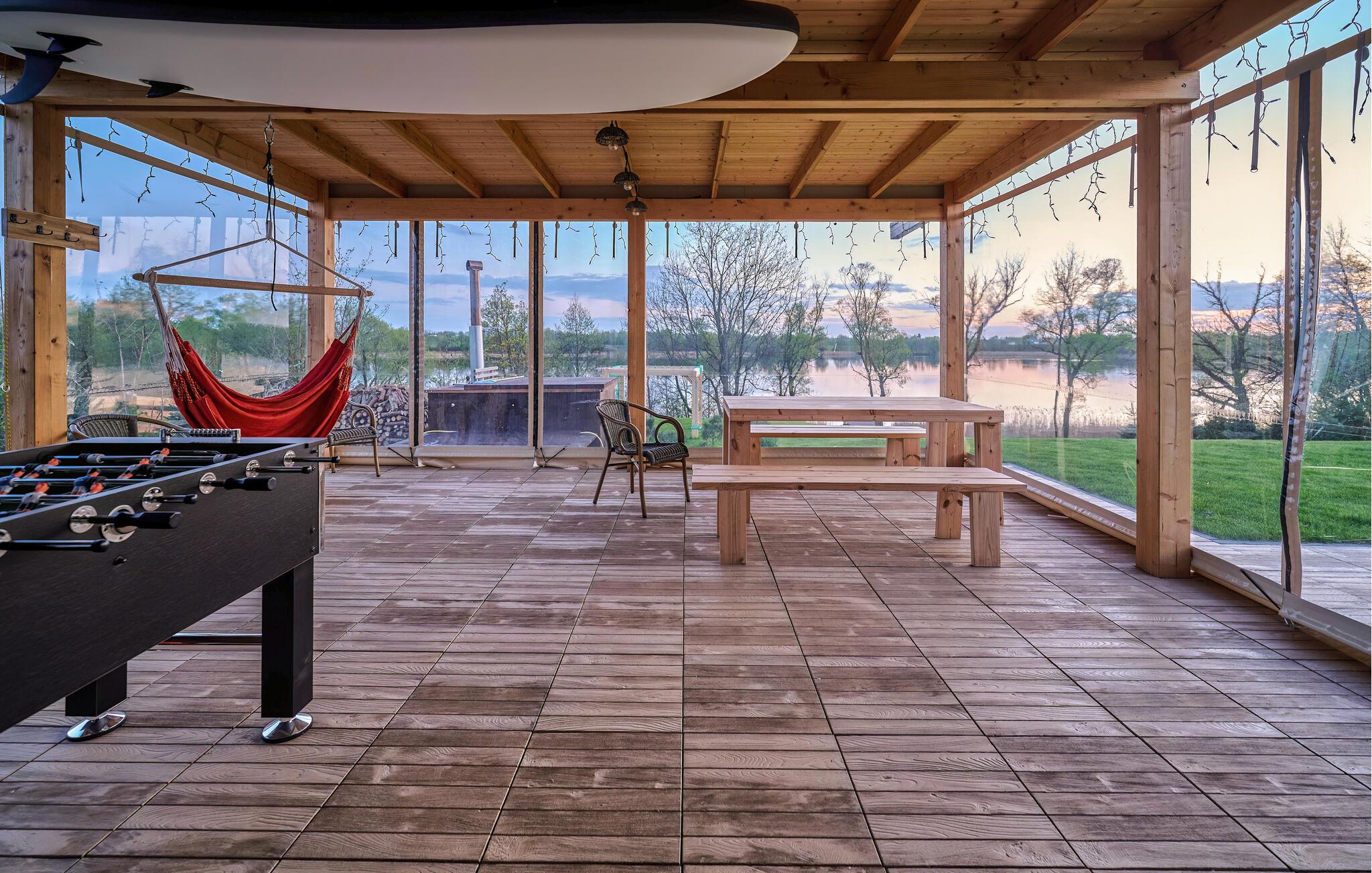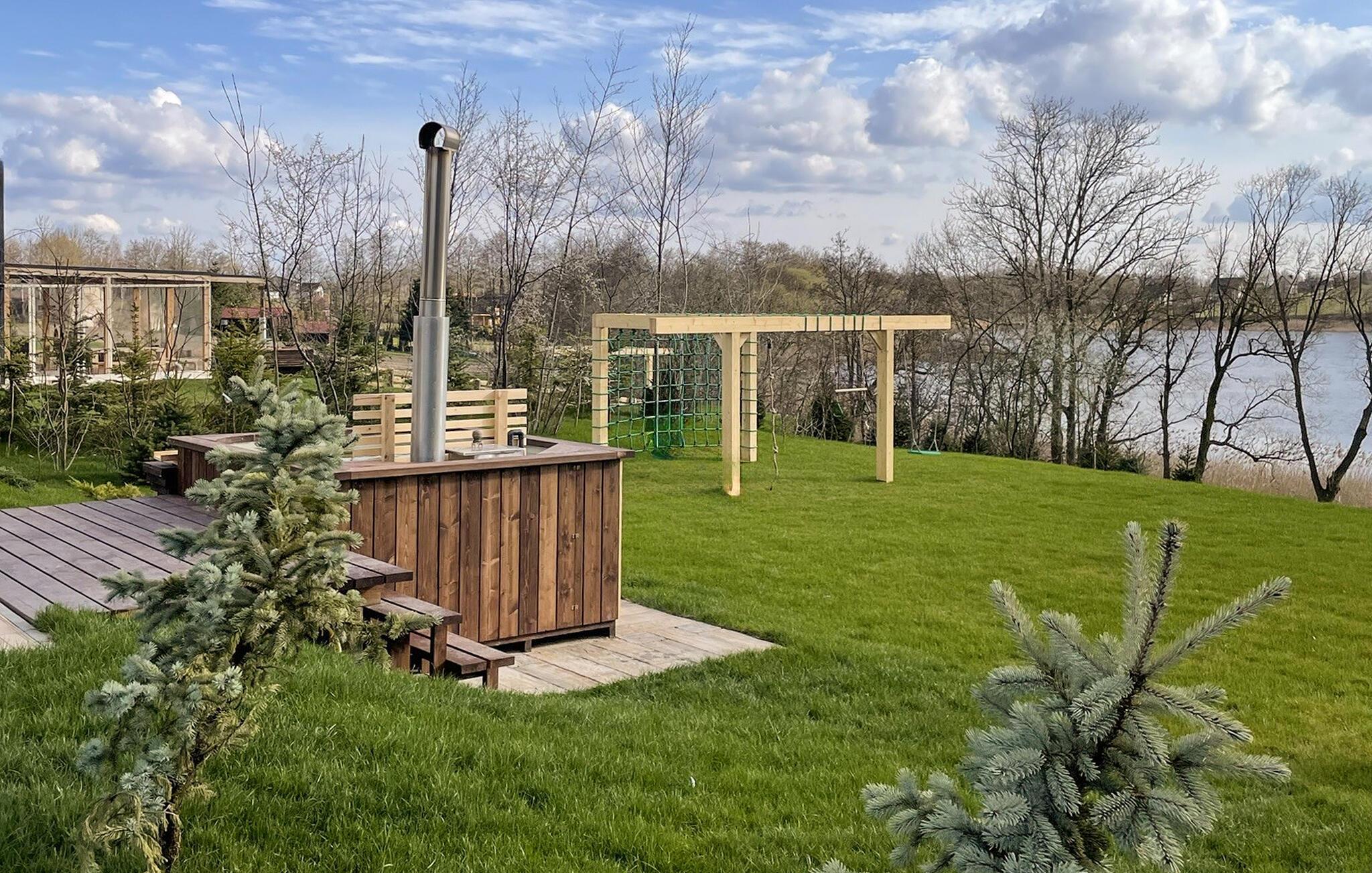 Genießen Sie die ruhige Lage direkt am Wasser. Setzen Sie sich an den großen Tisch und verbringen Sie lange Mahlzeiten im Freien. Legen Sie sich anschließend in eine der Hängematten und lassen Sie den Blick über den See schweifen. Spielen Sie eine Partie Tischfußball auf der Terrasse oder nutzen Sie den nahe gelegenen Sandplatz für eine Runde Beachvolleyball und entspannen Sie im Whirlpool im Garten. Ein eigener Steg führt direkt zum See, wo Sie baden können.