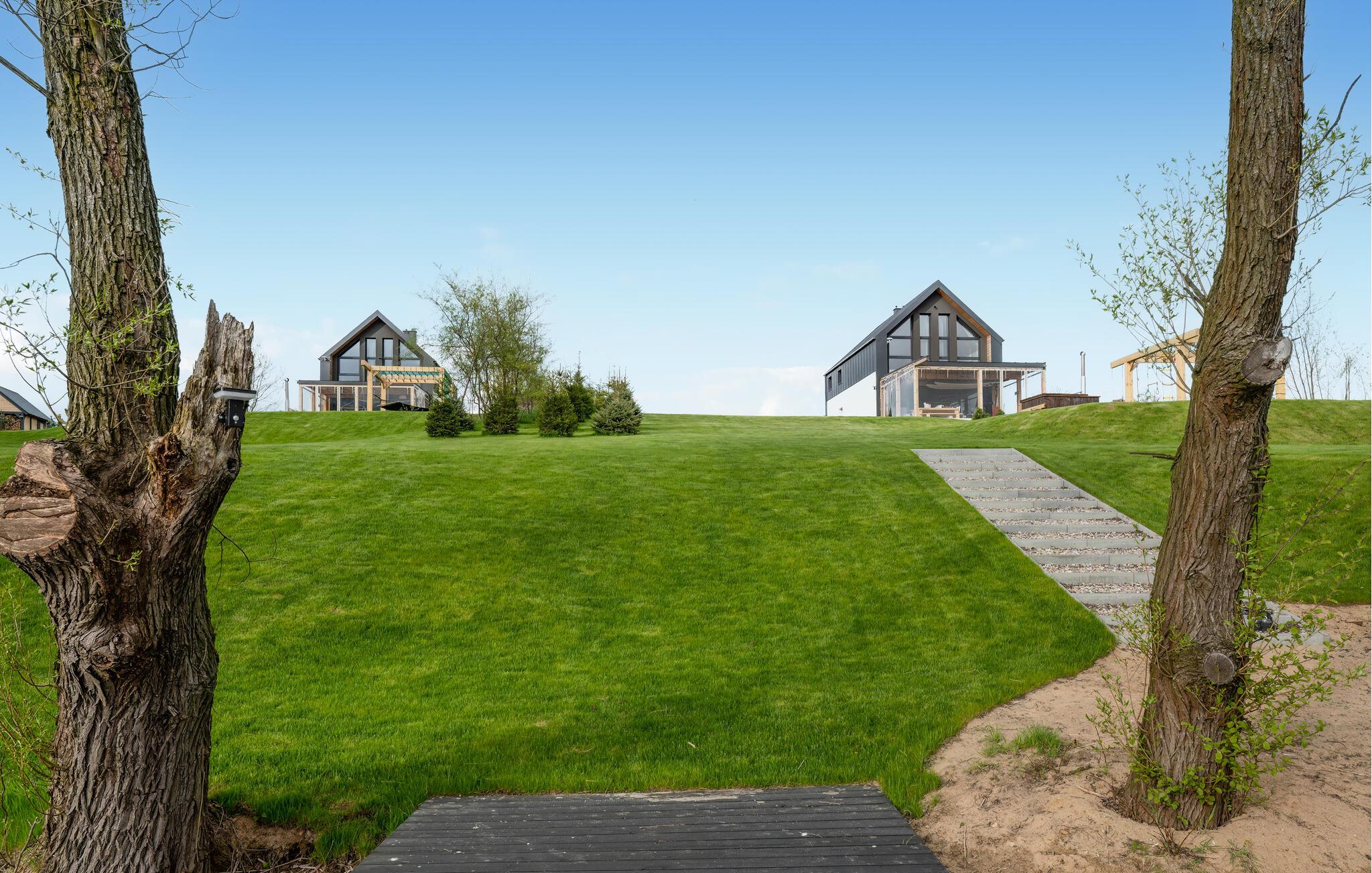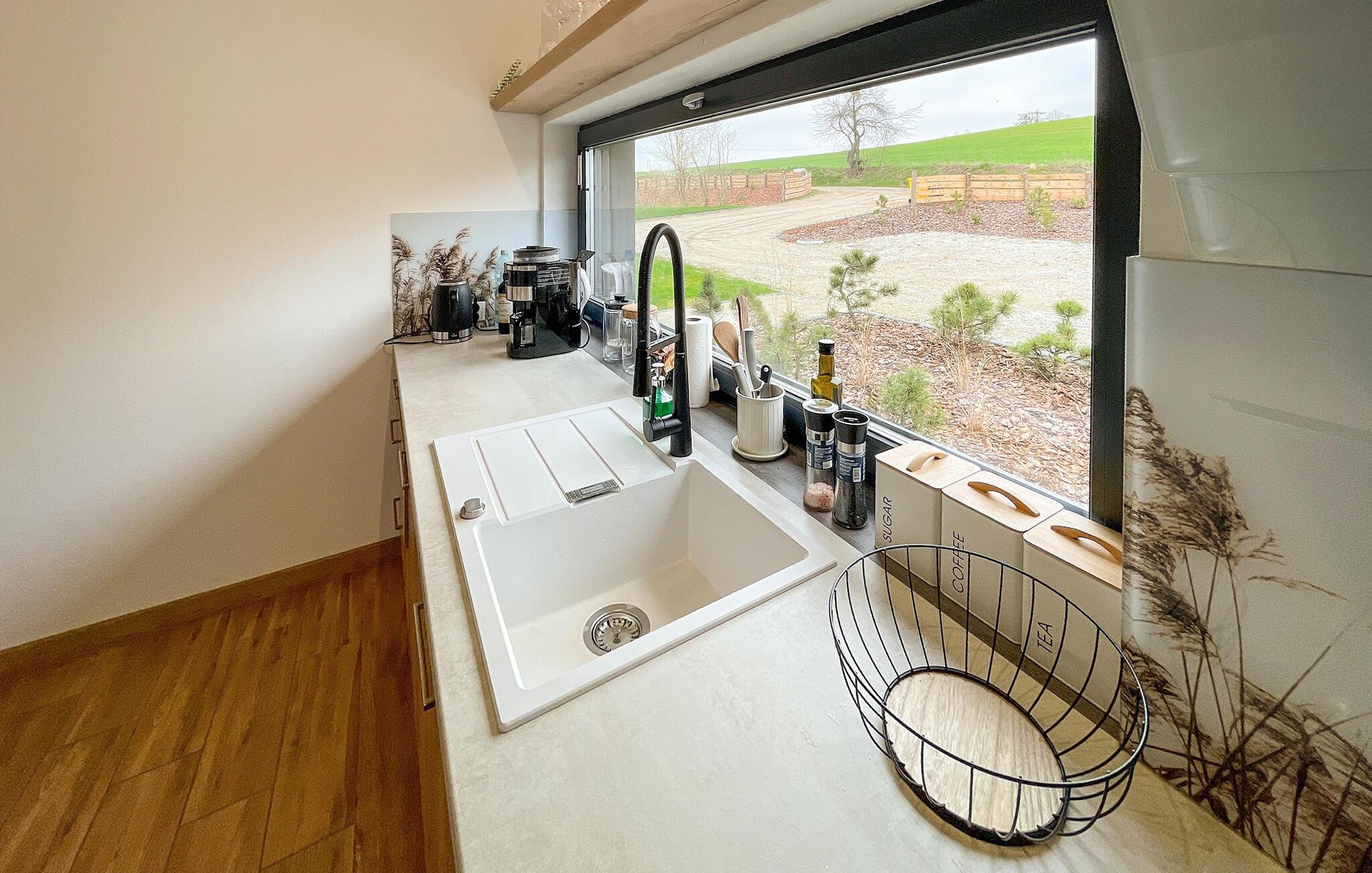 Betreten Sie Ihr modernes Ferienhaus und spüren Sie sofort die entspannte Atmosphäre des offenen Wohnbereichs. Große Fensterfronten lassen viel Licht herein und verbinden den Innenraum mit der umliegenden Landschaft. Machen Sie es sich auf dem Sofa bequem und genießen Sie ruhige Stunden nach einem Tag am See. Nehmen Sie am Esstisch Platz und planen Sie den nächsten Urlaubstag mit Blick ins Grüne. Die moderne Küche bietet ausreichend Arbeitsfläche, um gemeinsam zu kochen. Durch das Fenster fällt der Blick direkt in die Landschaft, während warme Holzböden und dezente Farben eine angenehme Wohnatmosphäre schaffen.
