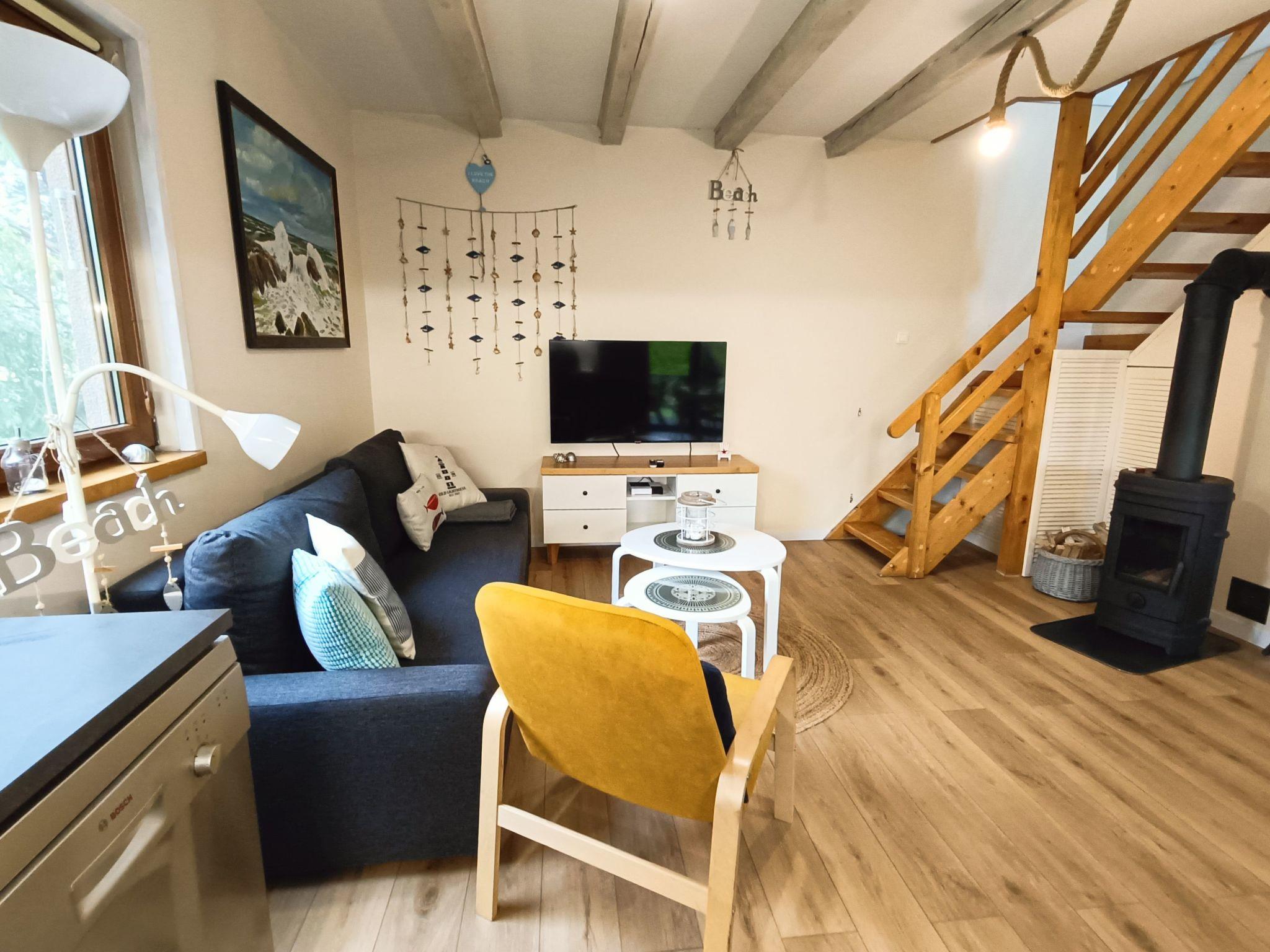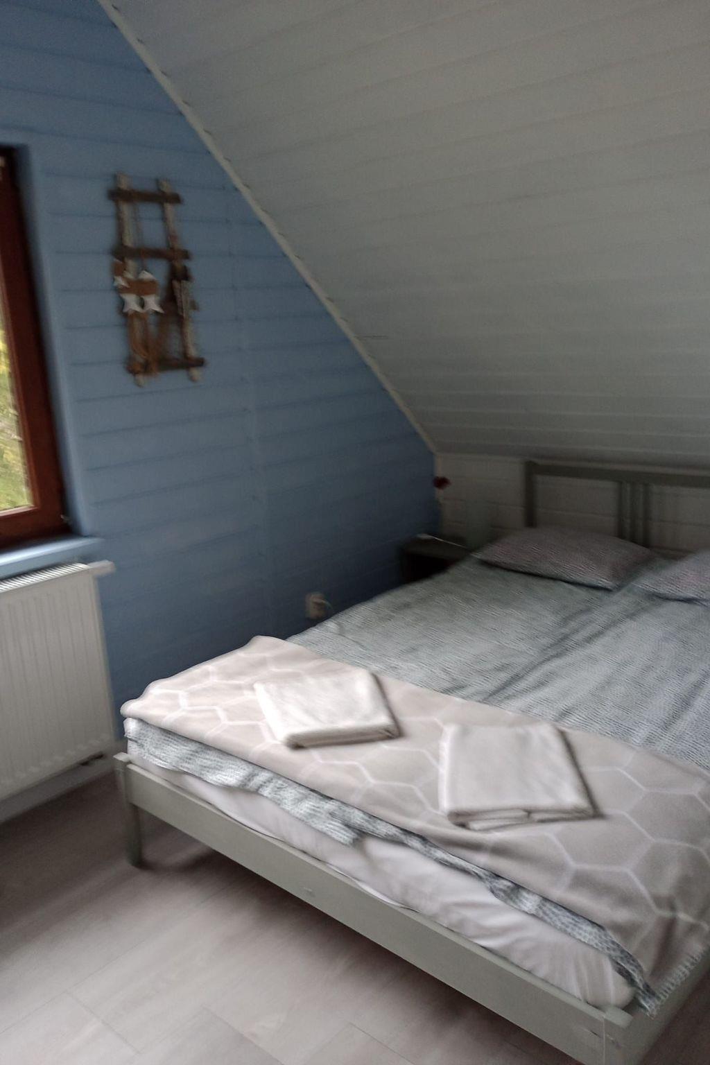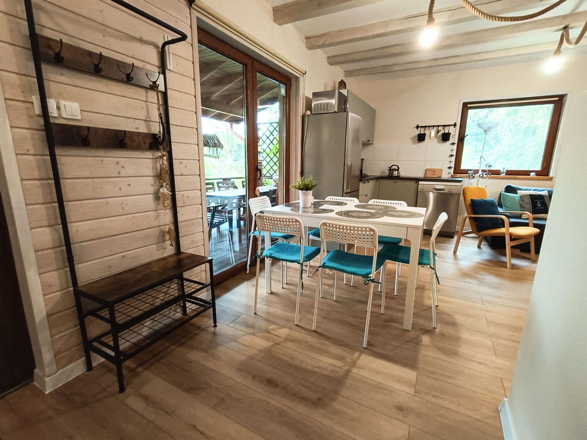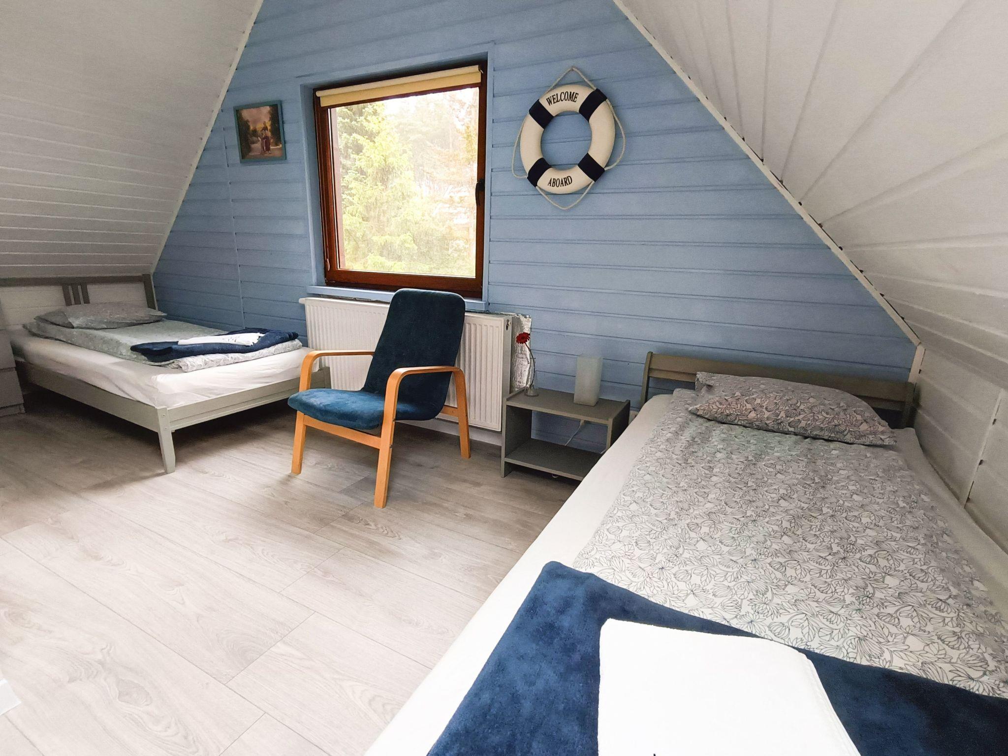 The proposed 4-bedroom, 4-bathroom house for rent in Kopalin of over ninety square metres has two en-suite bedrooms in the attic - one with a double bed and one single bed, and the other with two single beds. On the ground floor there is an additional bedroom with en-suite bathroom, a large living room with a fully equipped kitchenette (fridge, induction hob, dishwasher, microwave, coffee machine, pots and pans along with a set of crockery and cutlery) and a bathroom with washing machine. Each room and bathroom on the ground floor of the year-round house for rent has a window with a mosquito net in place. Romantic moments in the evenings are ensured by a wood-burning fireplace. In front of the house is a very large covered terrace with garden furniture. In front of the terrace there is a concrete barbecue and a hammock. This house was built in 2011 and the interior was renovated in 2023.