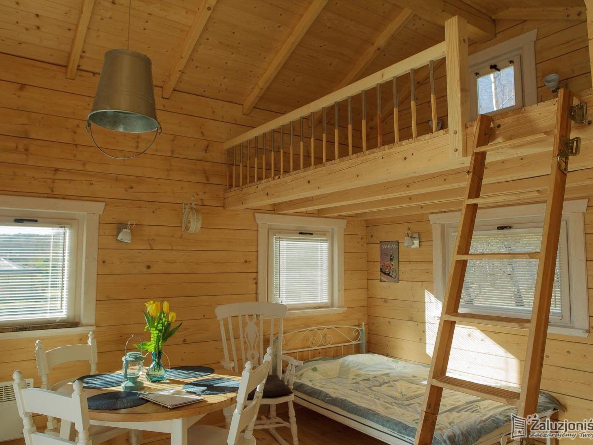 Inside the Blue cottage there is a cosy living room connected to the kitchen, a bathroom and a sleeping area. On the mezzanine floor there is a second double mattress for sleeping.