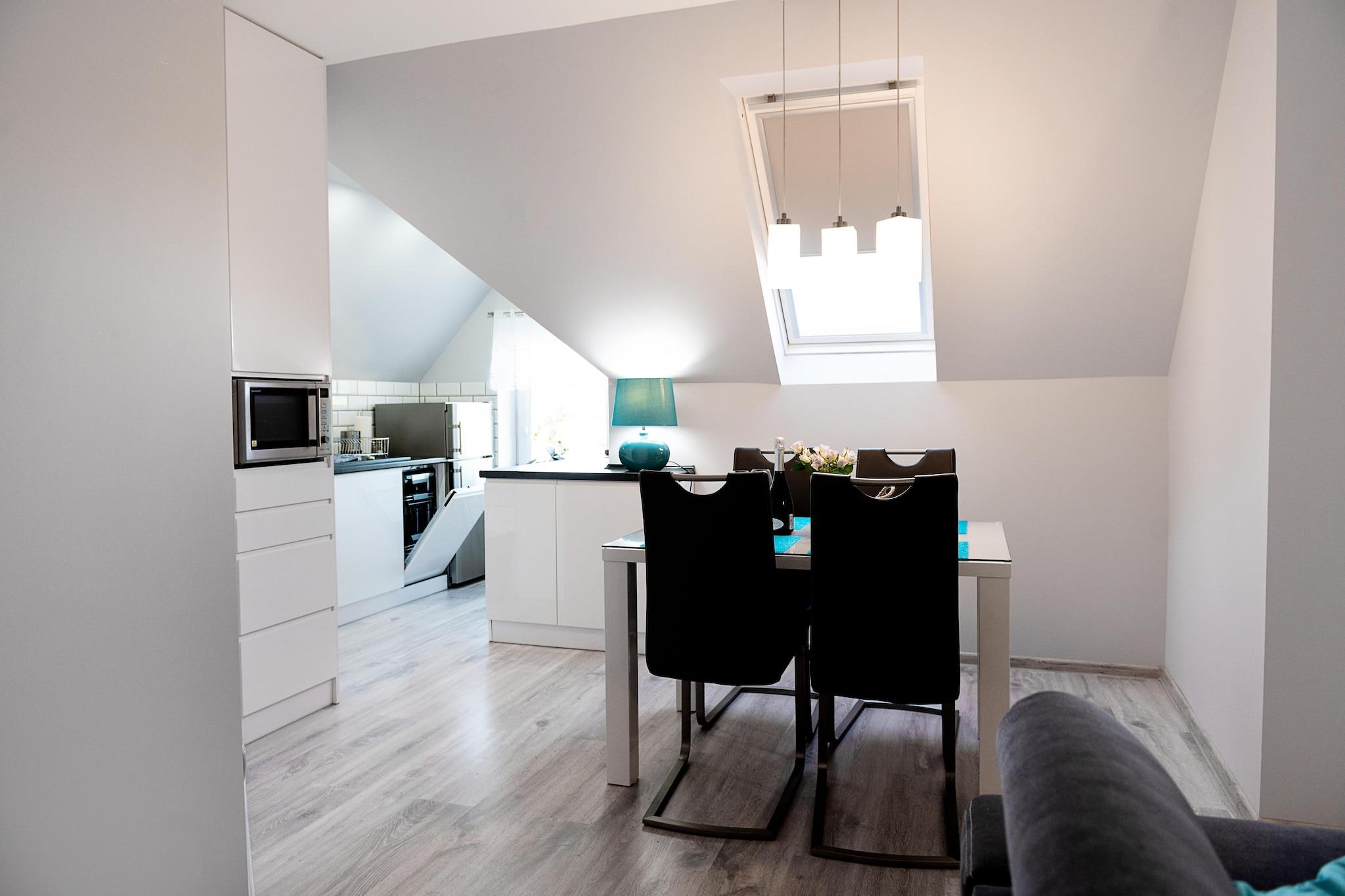 The intimate holiday apartment complex is located in the centre of the resort, 190 m from the seaside beach. In the immediate vicinity there are catering outlets serving home-cooked meals. There are also cafes and souvenir shops. A large, comfortable 2-level apartment. It occupies the third and fourth floors of the building (there is no elevator). On the lower level of the apartment there is a spacious living room combined with a well-equipped kitchen and a bathroom with a shower (there is also a washing machine). In the living room there is a fold-out 2-person sofa and TV. The upper level has 2 separate bedrooms. The apartment has a small terrace with a set of garden furniture. Central heating. Wireless internet is available. The price of the stay includes: electricity and water consumption, parking, internet. On request, a baby cot and a high chair. Pobierowo is a holiday resort in the West Pomeranian Voivodeship. It is located on the shores of the Baltic Sea, in the centre of the picturesque Rewal Coast. As befits a seaside town, Pobierowo offers tourists a clean beach and a guarded bathing area. There is also a fishing base here, which is great as a background for souvenir photos. Children will be delighted with a visit to the Whale Park in nearby Rewal (approx. 7 km), with real sea giants. In worse weather, a trip to one of several public indoor pools will be an ideal option. A rope park will also be fantastic entertainment for the whole family or a group of friends. The pride of the town and the entire region is the renovated narrow-gauge railway, which can be used for a charming trip to neighbouring resorts.