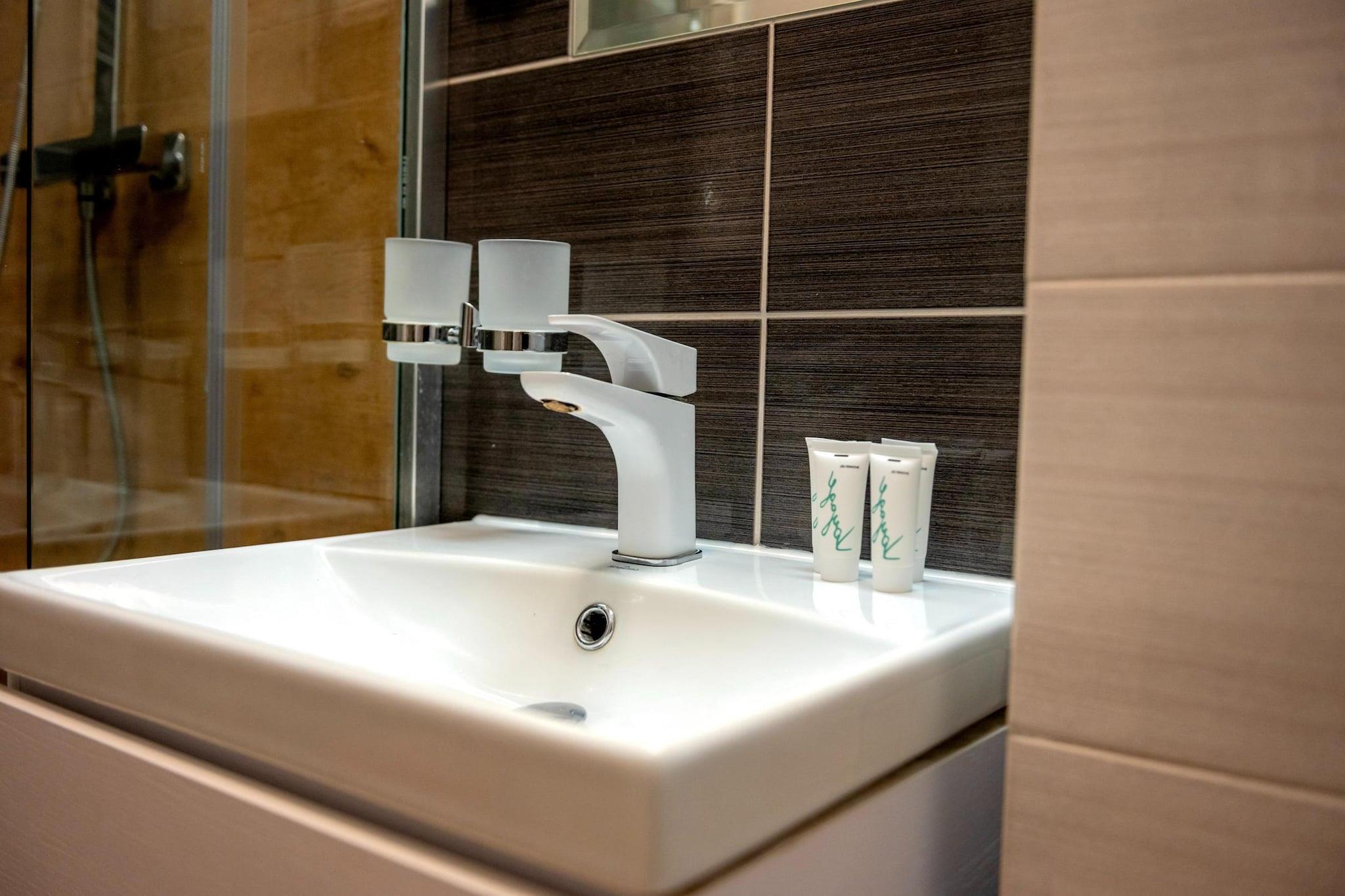 On the 2nd floor: (open kitchen(hob(2 ring stoves, induction), electric kettle, coffee machine, microwave, fridge-freezer), Living/diningroom(double sofa bed, TV(flatscreen, german television channels), dining table), bedroom(double bed), bathroom(shower, washbasin, toilet, hairdryer)) Internet access, balcony, heating(central), garden furniture, sun loungers, parking, lift