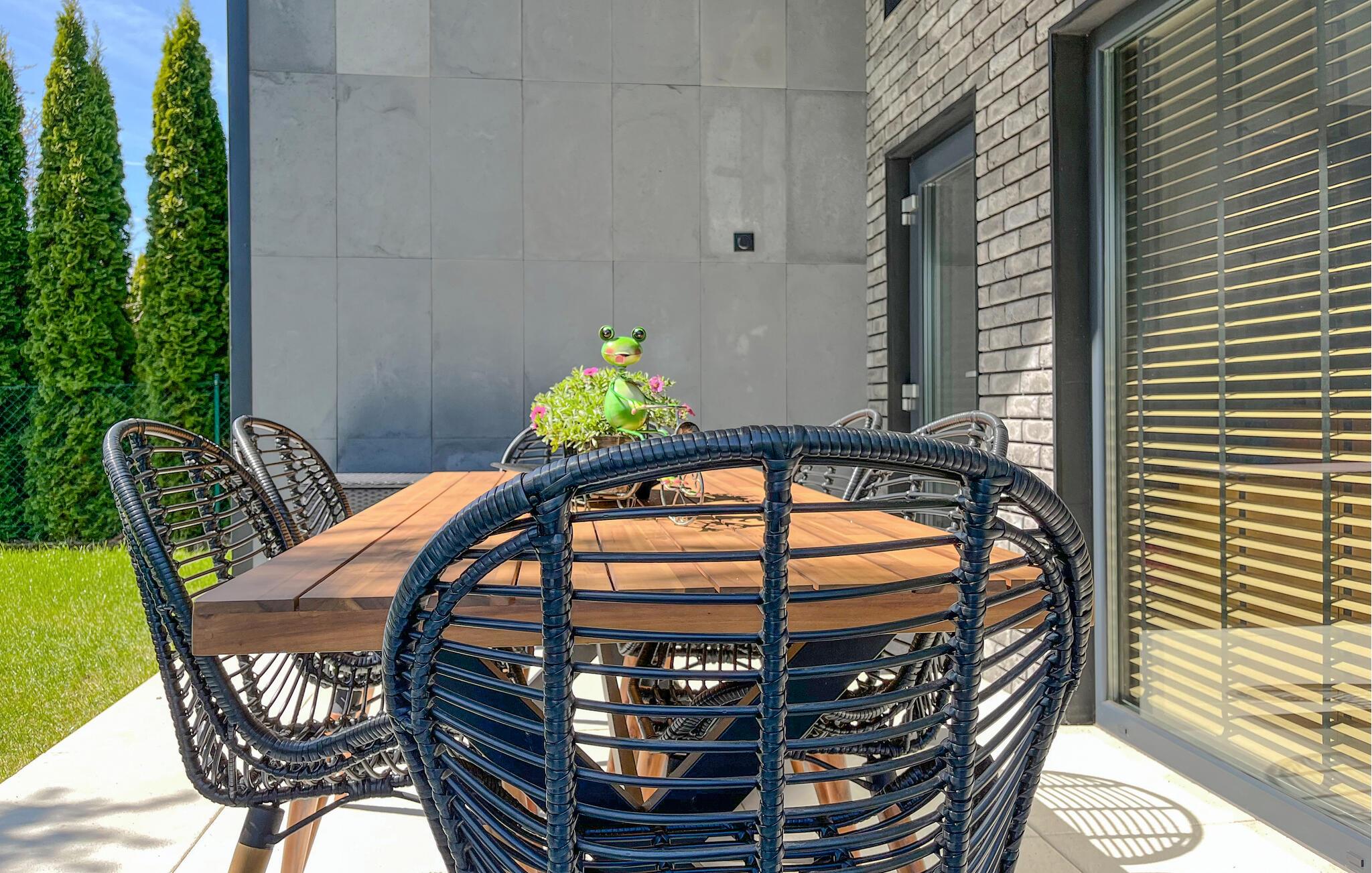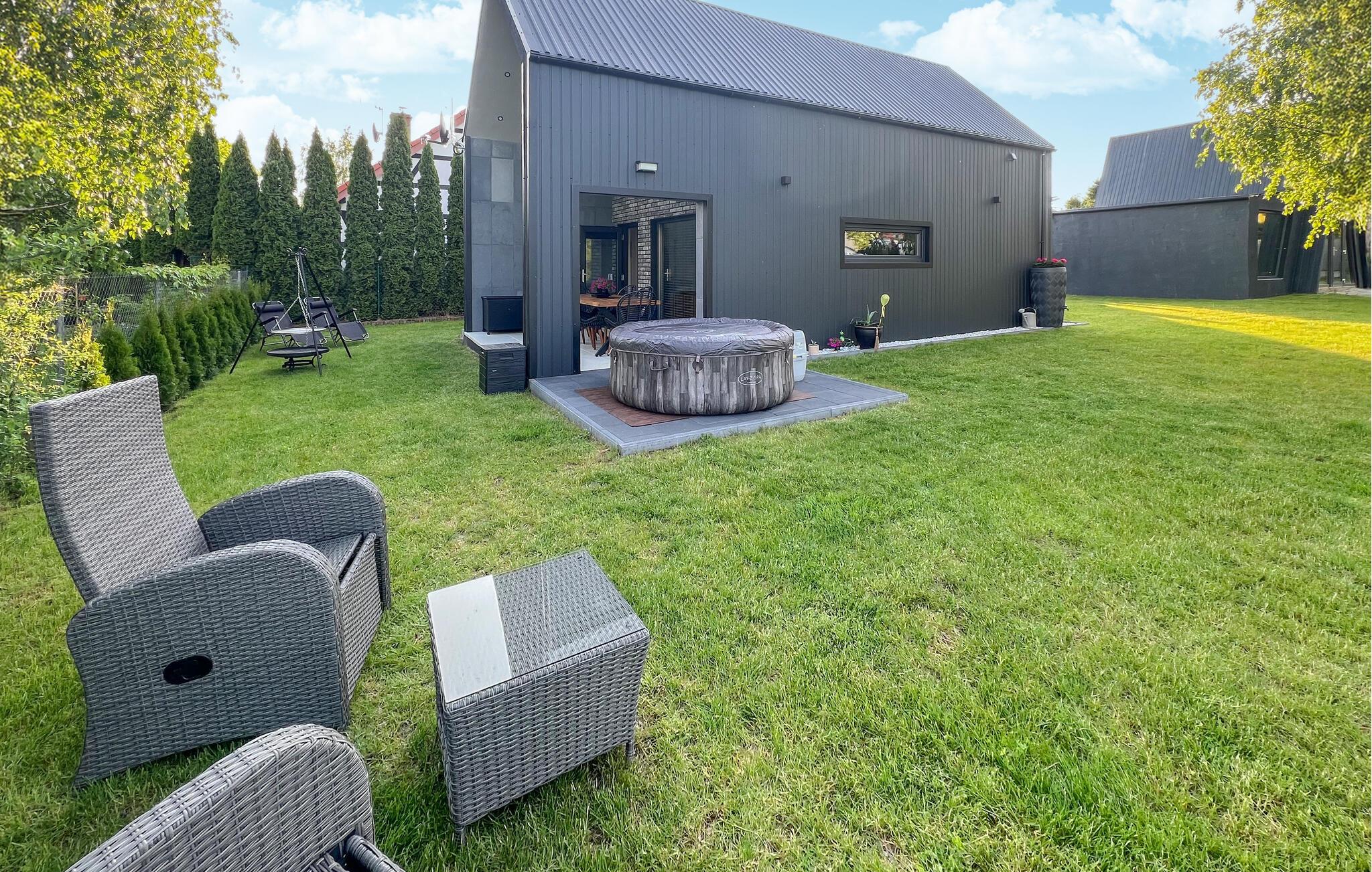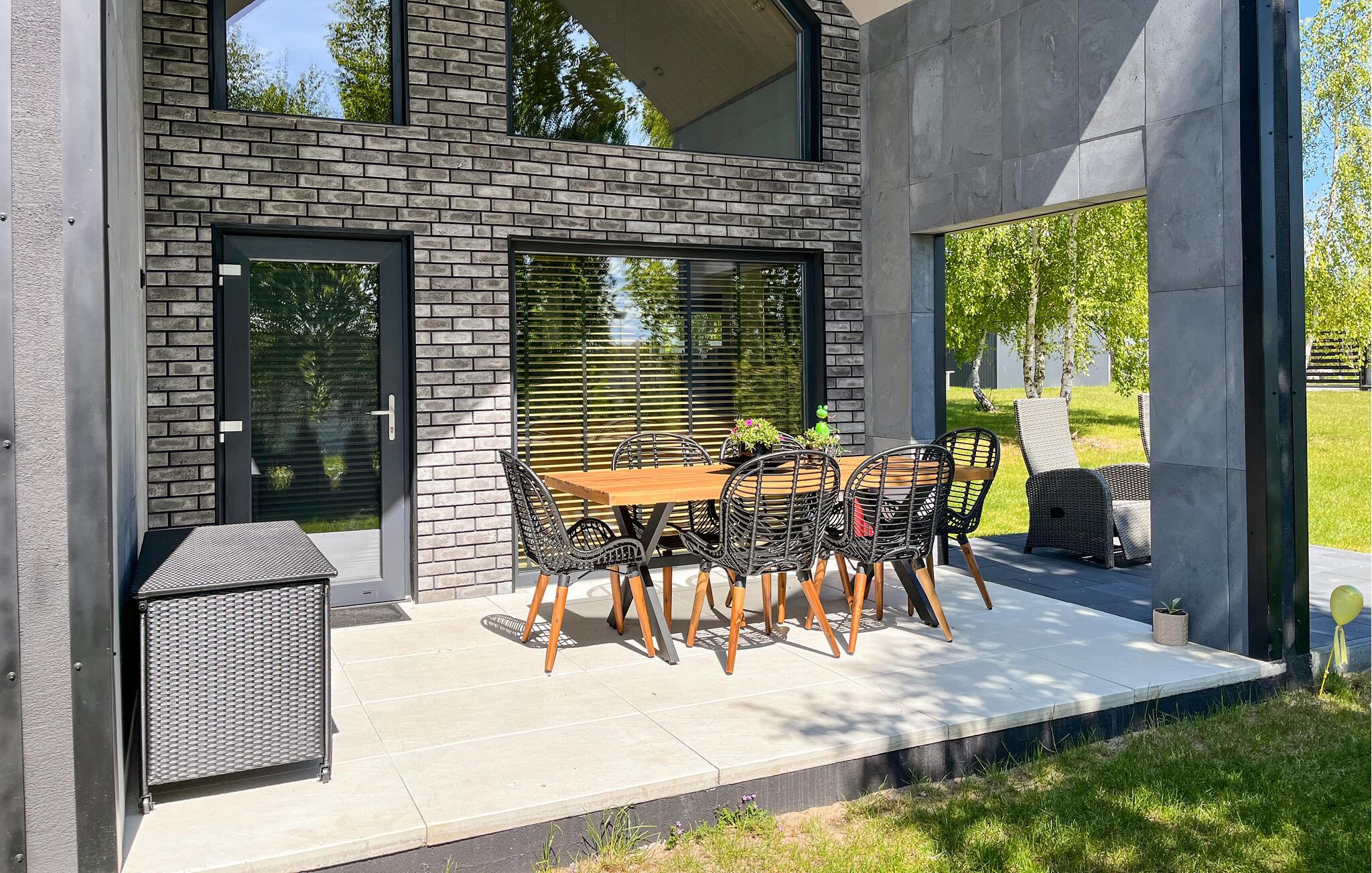 Dieses stilvolle Ferienhaus auf zwei Ebenen begeistert mit einer hochwertigen Einrichtung und großen Fensterfronten, die den Innenraum mit dem Garten verbinden. Lichtdurchflutete Räume schaffen für Sie eine einladende Atmosphäre, ideal für entspannte Stunden mit der Familie oder Freunden. Im Wohnbereich können Sie sich wohlfühlen, während die offene Küche zu gemeinsamen Kochabenden einlädt. Der Garten mit Terrasse bietet Ihnen Platz zum Entspannen oder für gesellige Grillabende.