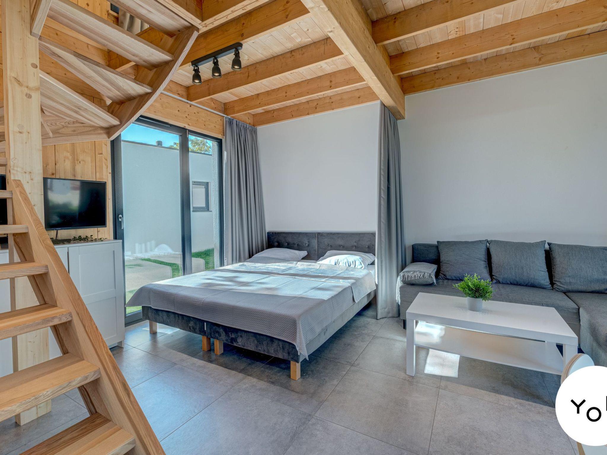 The 4-6 person cottage with mezzanine is our largest cottage, with an additional high mezzanine, measuring 44-52 m2, with separate access to a spacious (15m2) terrace dedicated to the cottage. The 4-6 person cottage with mezzanine is ideal for a holiday for a large family of 6 or even 2 families. Inside, guests have a comfortable living room with space to relax and spend time together. The fully equipped kitchen with dining area allows for the preparation of daily meals and also encourages culinary experiments. After an actively spent day, a comfortable double bed in the Parents' space, separated by a blackout curtain, will ensure a well-deserved and peaceful sleep. A fold-out 2-person sofa is provided for children. On the mezzanine there is a unique hammocking area, as well as two connected single beds and a comfortable double bed, and a space for relaxation.