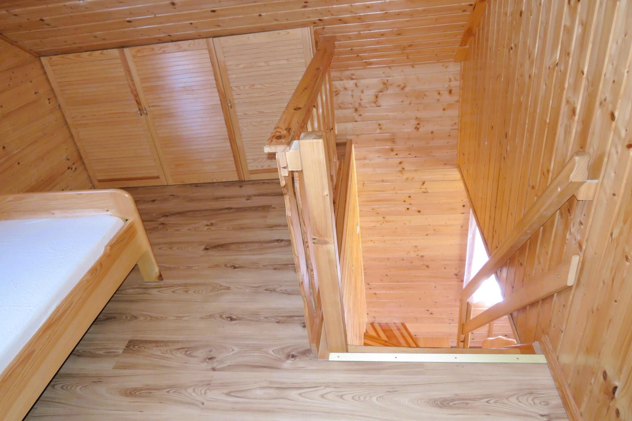 Ground floor: (Living room(single sofa bed, TV(satellite, german television channels), dining table), open kitchen(hob(2 ring stoves, ceramic), electric kettle, boiling water tap, coffee machine, fridge), bathroom(shower, washbasin, toilet)) On the 1st floor: (bedroom(single bed), bedroom(2x single bed)) seating area, grill, balcony, terrace, garden, garden furniture, parking, play equipment, Volleyball court