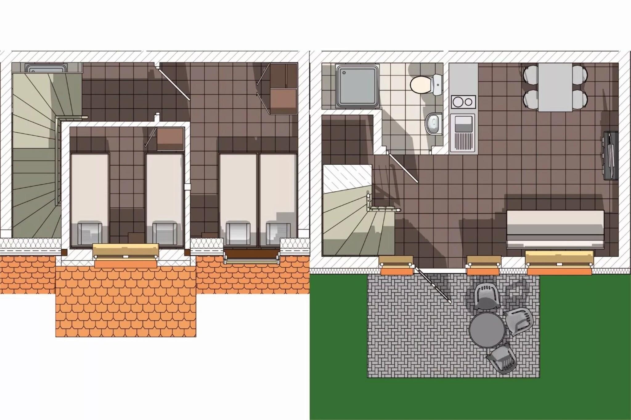 Ground floor: (open kitchen(hob(2 ring stoves, electric), electric kettle, coffee machine, dishwasher, fridge-freezer), Living/diningroom(double sofa bed, TV(flatscreen, german television channels), dining table(4 persons)), bathroom(shower, washbasin, toilet, hairdryer)) On the 1st floor: (bedroom(double bed), bedroom(single bed, single bed)) Reception, Internet access, Play area, Lawn, washing machine(shared with other guests, paid), heating(central), terrace, garden(shared with other guests, fenced, 3000 m2), garden furniture, sun loungers, BBQ(charcoal), parking, trampoline(shared with other guests), parasol, sand pit(shared with other guests), slide(shared with other guests), table tennis table(shared with other guests), fitness equipment(shared with other guests), high chair, ironing board, iron, Swing set, baby crib(free)