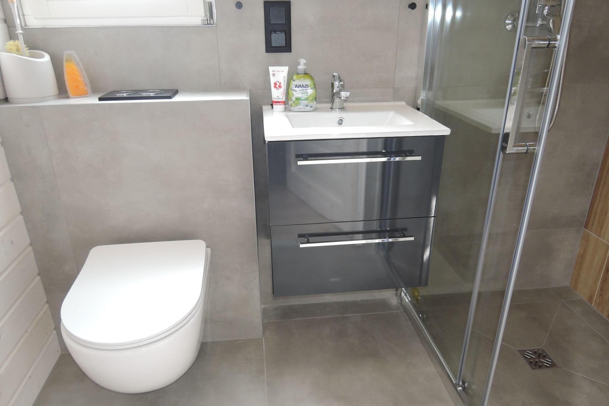 Ground floor: (Living/bed room(double sofa bed)) On the 1st floor: (bedroom(double bed), bedroom(2x single bed)) Kitchenette(dining table, hob(2 ring stoves, electric), electric kettle, toaster, coffee machine, fridge-freezer), bathroom(shower, washbasin, toilet), seating area, grill, heating, garden furniture, parking, trampoline, slide, Swing set, baby crib(free)