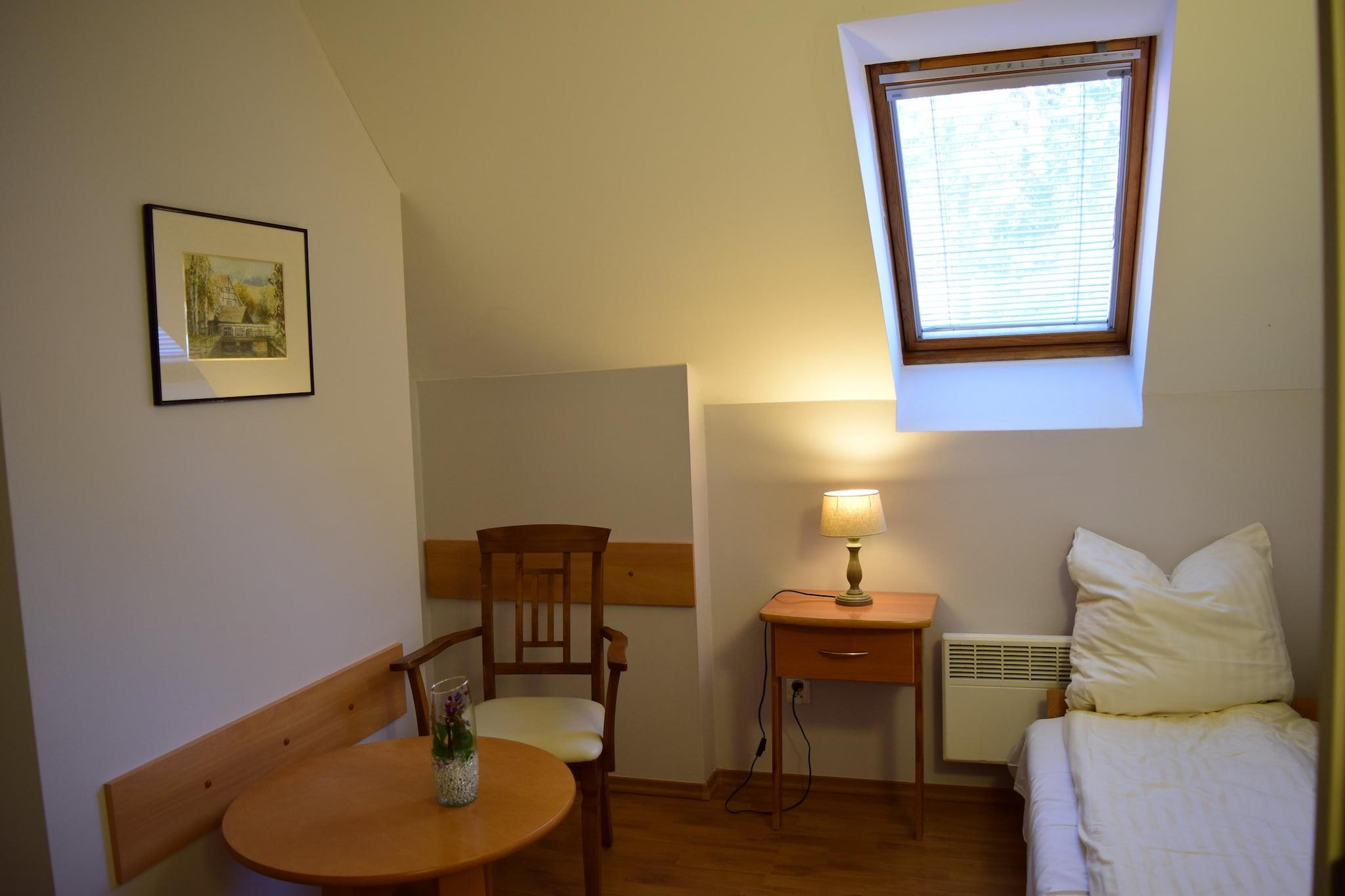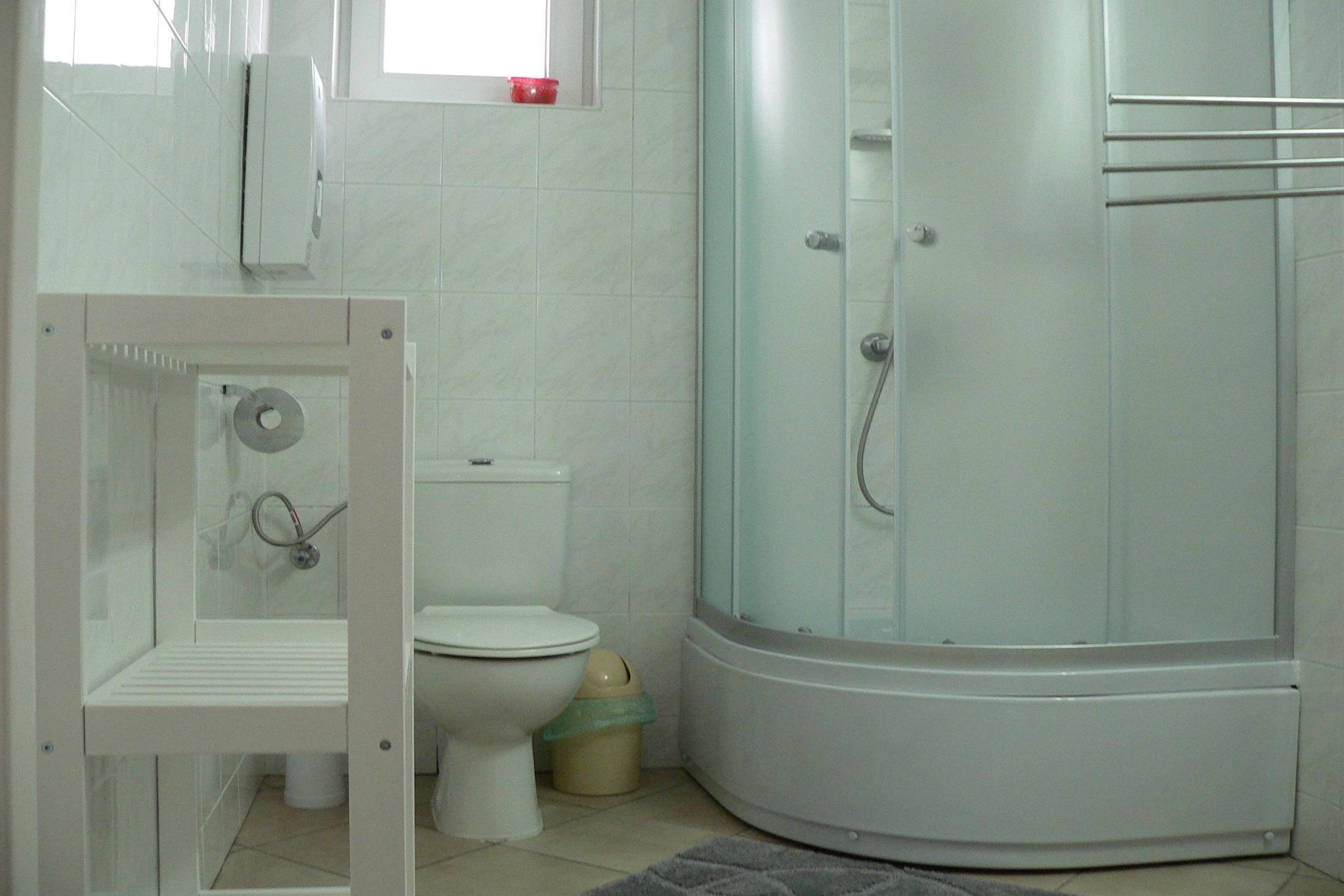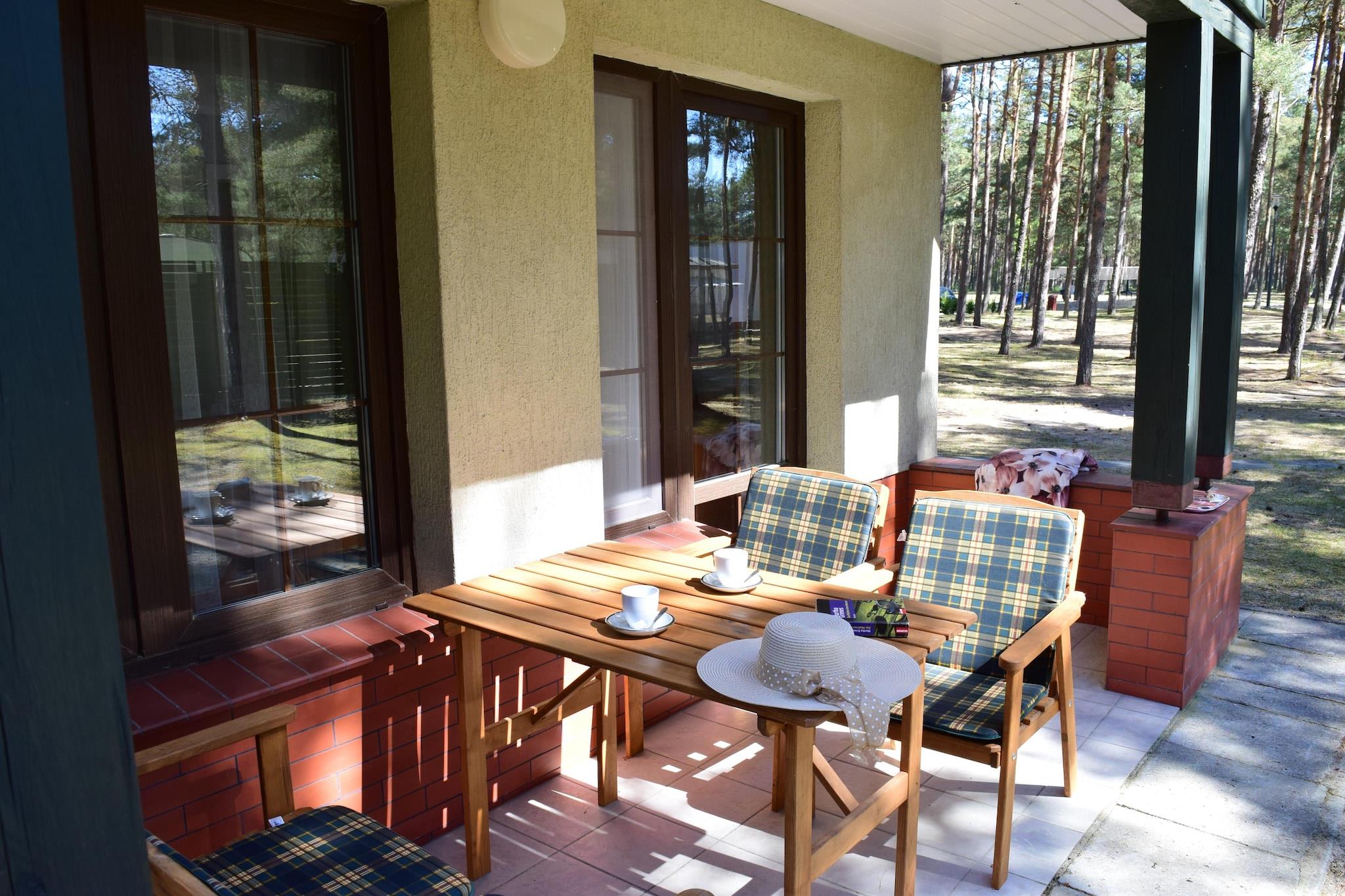 Ground floor: (open kitchen(hob(2 ring stoves, electric), electric kettle, microwave, dishwasher, fridge-freezer, Blender), Living/diningroom(double sofa bed, TV(flatscreen), dining table, radio), bathroom(shower, washbasin, toilet)) On the 1st floor: (bedroom(double bed), bedroom(single bed, single bed)) Barbecue center, Reception, Internet access, Parking, Bike rental, Volleyball field, Indoor playroom, Play area, Lawn, heating(electric), terrace(private, roofed), garden(shared with other guests, fenced, 1,5 hm2), bicycle storage(shared with other guests), garden furniture, sun loungers, trampoline(shared with other guests), slide(shared with other guests), table tennis table(shared with other guests), table football(shared with other guests), bicycles available(paid), high chair, Swing set, baby crib(free)