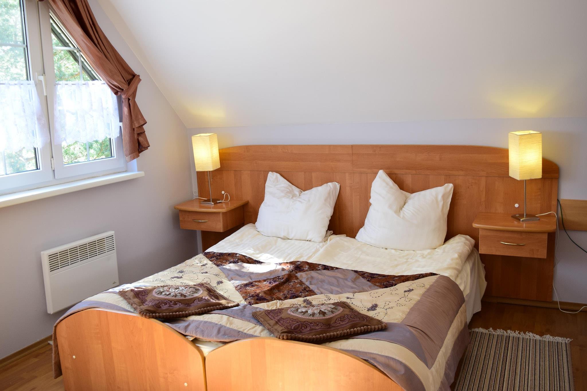 Ground floor: (open kitchen(hob(2 ring stoves, electric), electric kettle, microwave, dishwasher, fridge-freezer, Blender), Living/diningroom(double sofa bed, TV(flatscreen), dining table, radio), bathroom(shower, washbasin, toilet)) On the 1st floor: (bedroom(double bed), bedroom(single bed, single bed)) Barbecue center, Reception, Internet access, Parking, Bike rental, Volleyball field, Indoor playroom, Play area, Lawn, heating(electric), terrace(private, roofed), garden(shared with other guests, fenced, 1,5 hm2), bicycle storage(shared with other guests), garden furniture, sun loungers, trampoline(shared with other guests), slide(shared with other guests), table tennis table(shared with other guests), table football(shared with other guests), bicycles available(paid), high chair, Swing set, baby crib(free)