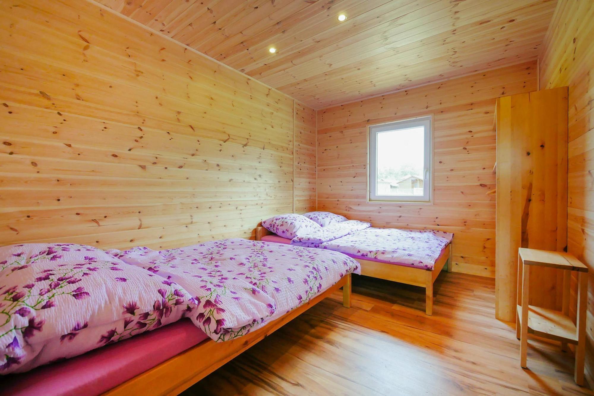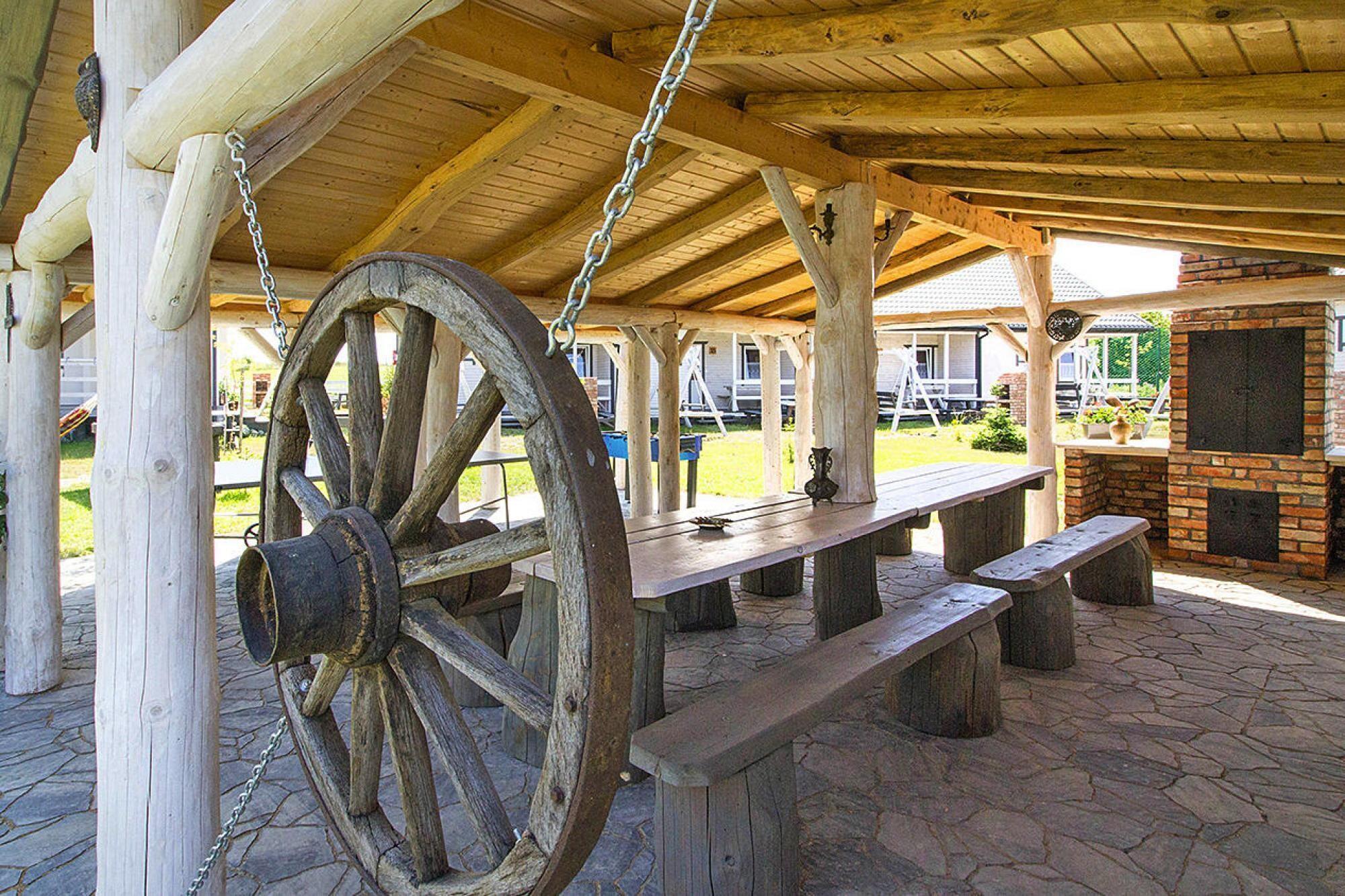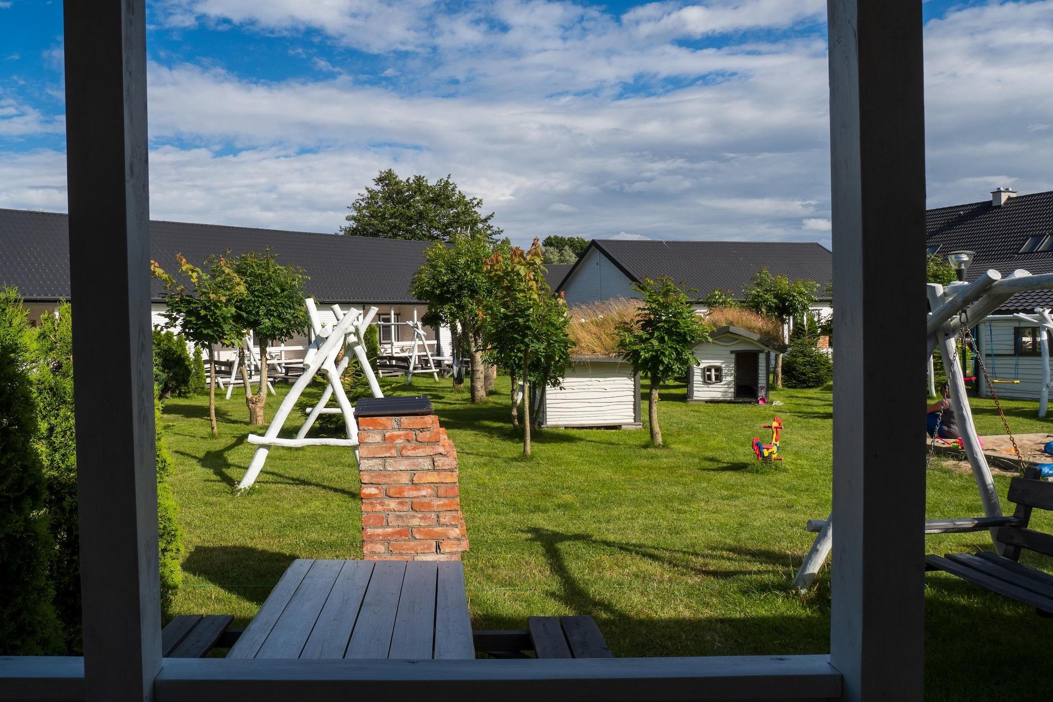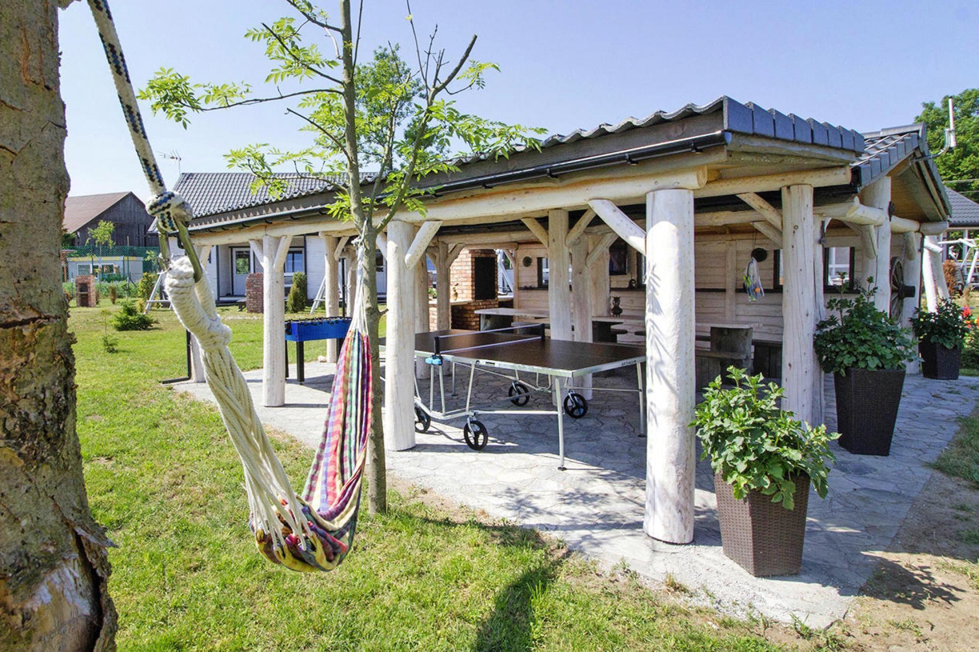 Ground floor: (open kitchen(hob(2 ring stoves, induction), electric kettle, toaster, coffee machine, fridge-freezer), Living/bed room(double sofa bed, TV(flatscreen), dining table), bedroom(2x double bed), bedroom(double bed), bathroom(shower, washbasin, toilet)) Reception, Internet access, Lawn, coffee machine, washing machine(shared with other guests, paid), heating(electric), terrace(roofed), garden(shared with other guests, fenced, 4500 m2), garden furniture, sun loungers, BBQ(charcoal), parking, sand pit(shared with other guests), play equipment(shared with other guests), table tennis table(shared with other guests), table football(shared with other guests), air hockey(shared with other guests), bicycles available, hammock, high chair, outdoor fireplace, Volleyball court, Garden shed, Swing set, baby crib(paid)