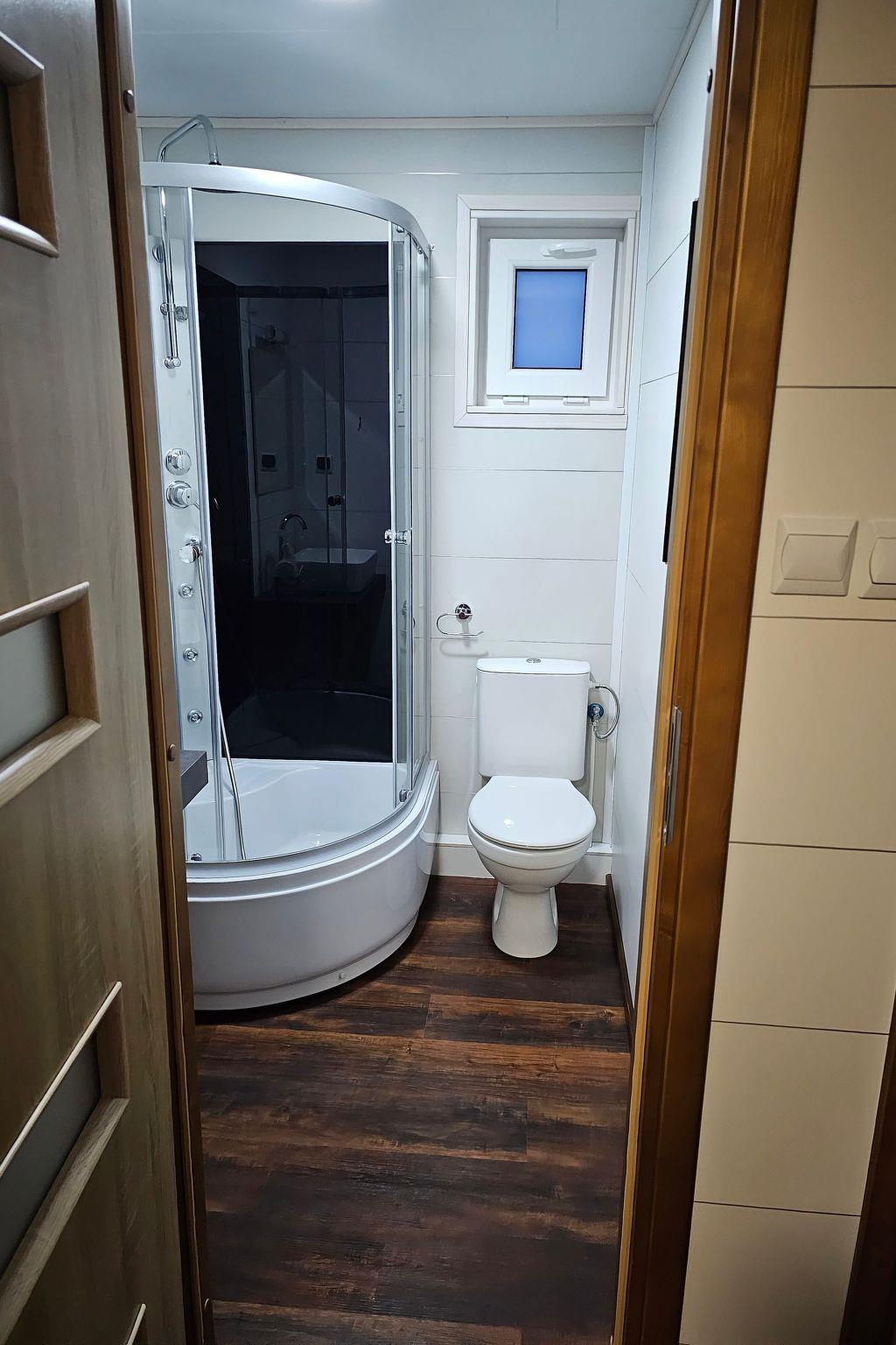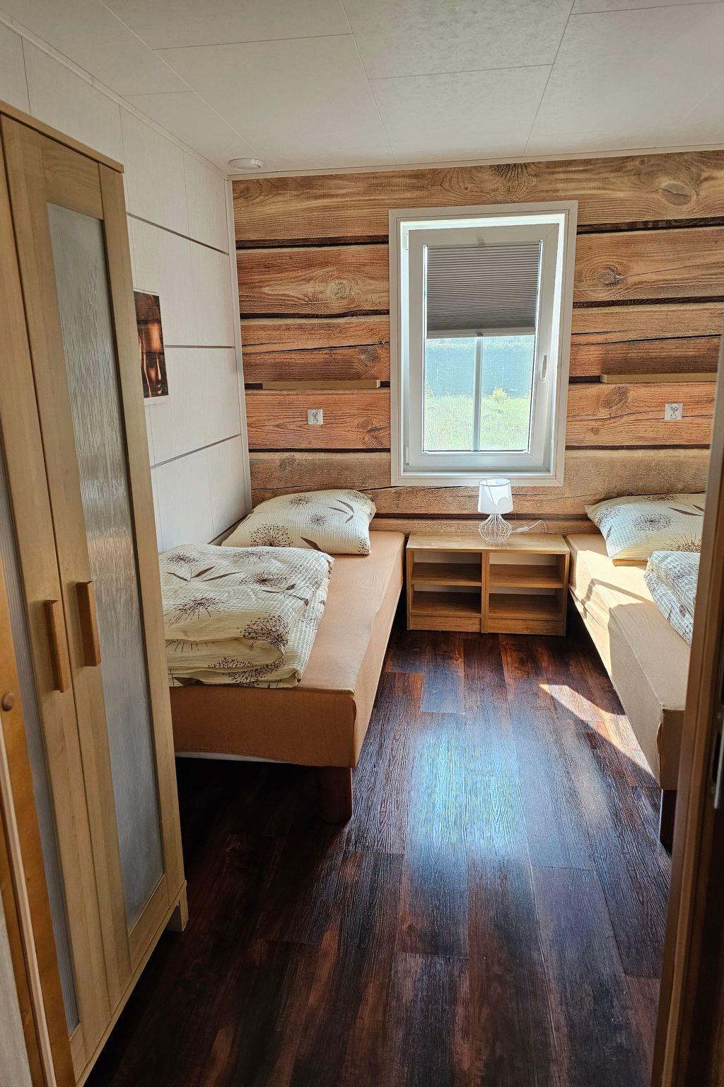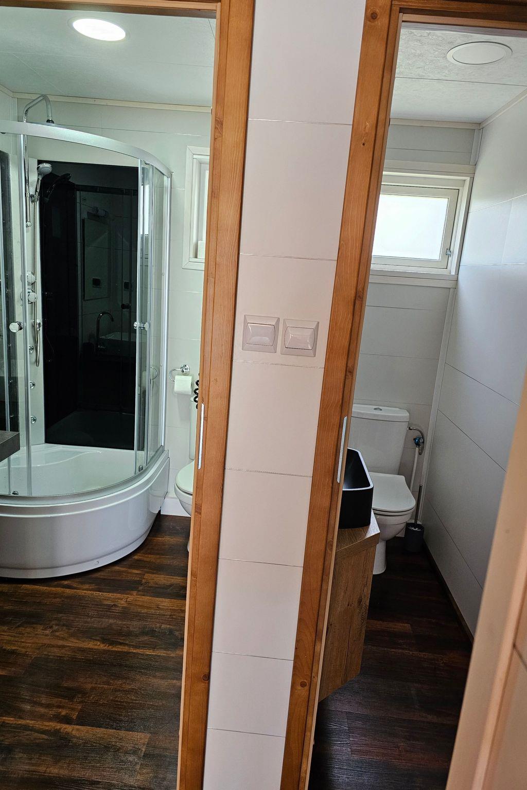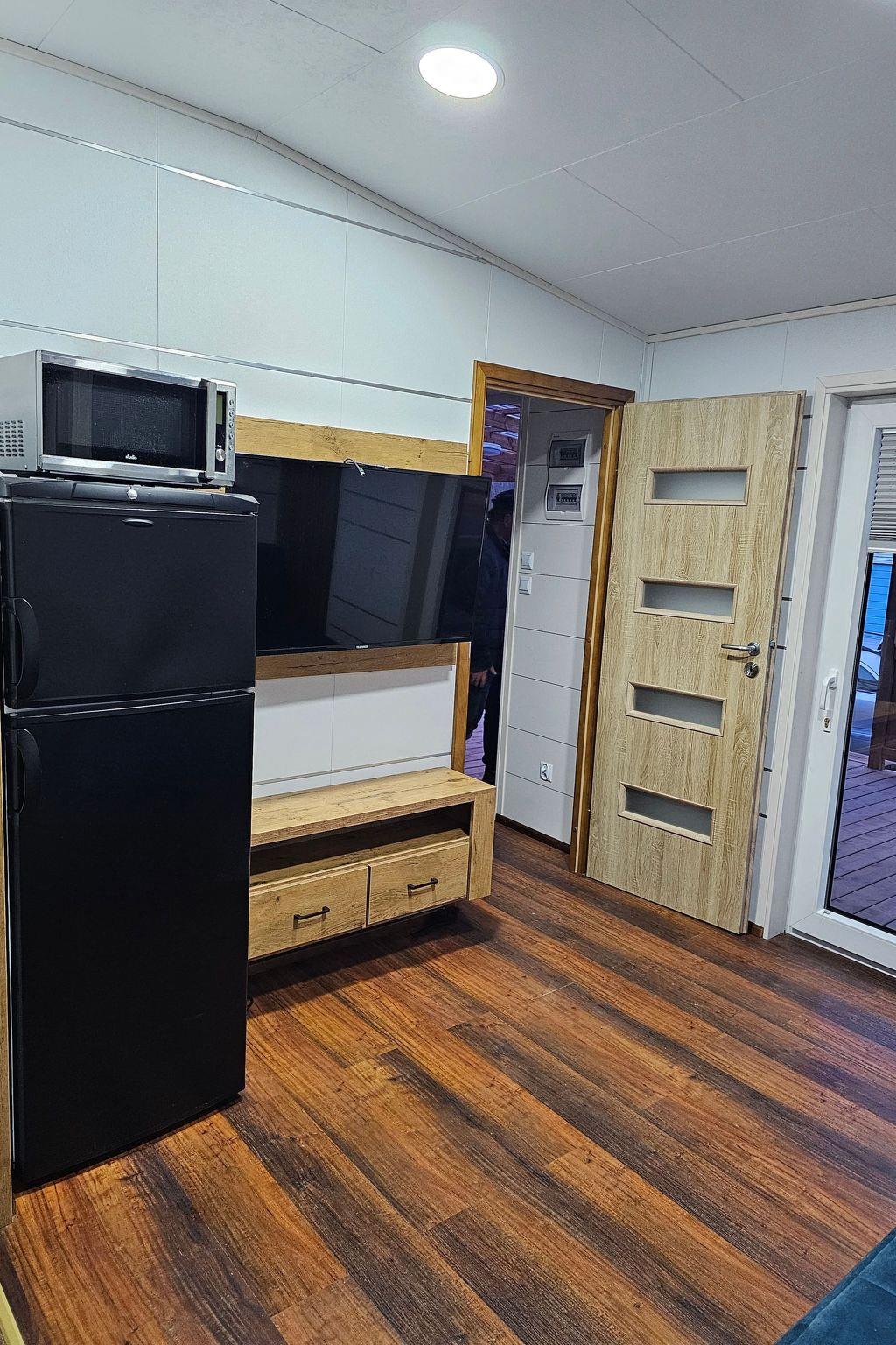 The interior of the cottage has been designed with comfort and functionality in mind. There is a fully equipped kitchenette with modern appliances such as hob, oven, dishwasher and microwave. We also provide two cosy rooms with single beds, wardrobes and bedside tables, a spacious living room with sofa and flat-screen TV, and two bathrooms with shower or toilet. All this is complemented by a terrace equipped with table, chairs and barbecue equipment, where you can spend pleasant evenings.