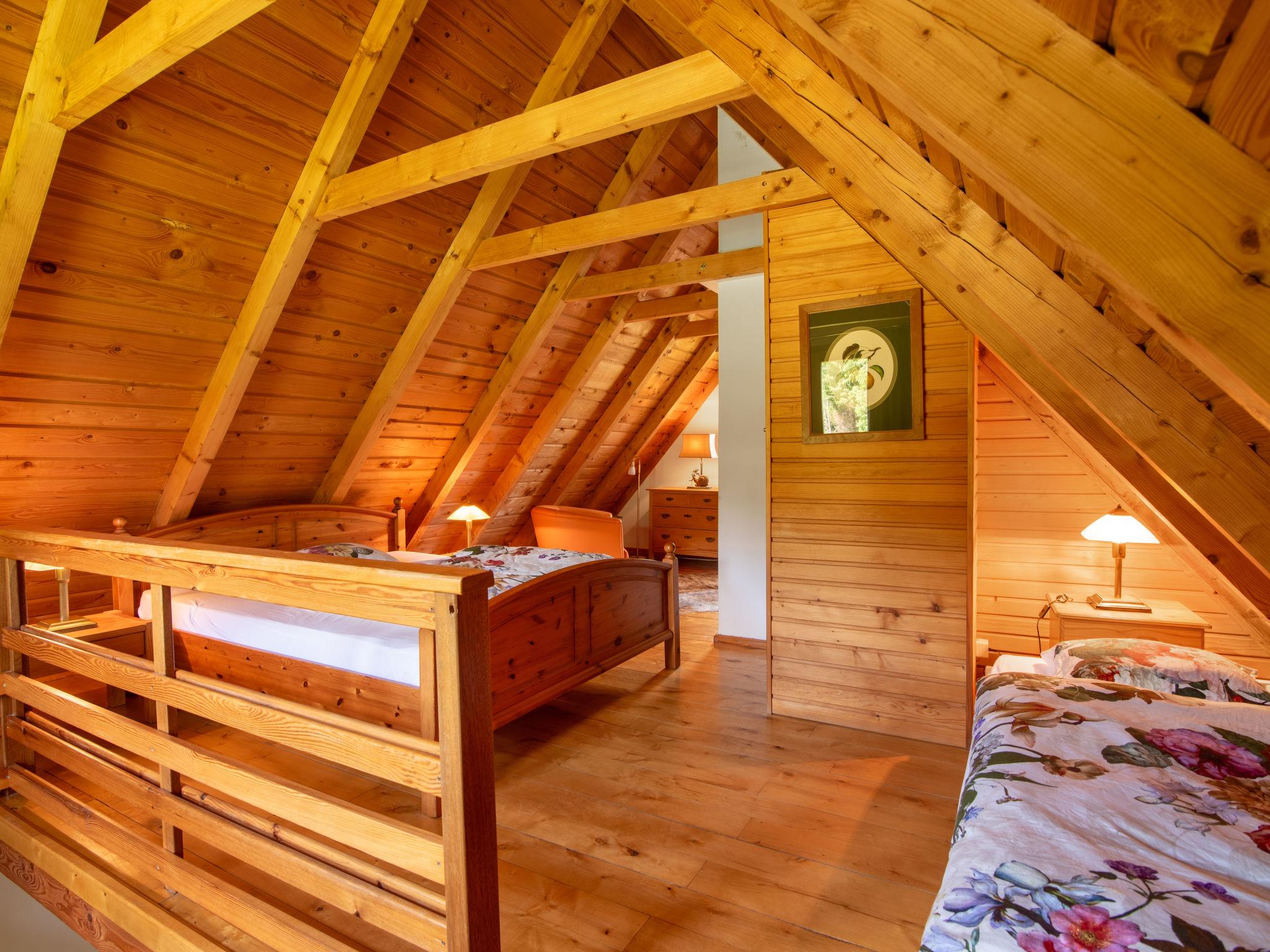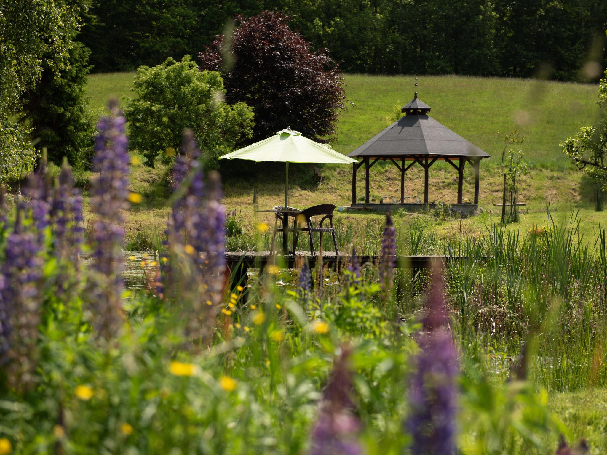 2-room house 75 m2 on 2 levels. Practical and comfortable furnishings: open living room with satellite TV and radio. Exit to the garden. Open kitchen (4 hot plates, oven, grill, electric coffee machine) with dining table. Shower/WC. Wood heating, underfloor heating, boiler (100 litres). Top floor: 1 room with sloping ceilings with 1 bed (90 cm), 1 french bed (180 cm), bath/WC. Terrace furniture, barbecue, deck chairs (4), sitting area. Marvellous view of the countryside and the forest. Facilities: sauna. Internet (WiFi). Parking at the house. Please note: non-smoking house. Maximum 1 pet/ dog allowed.