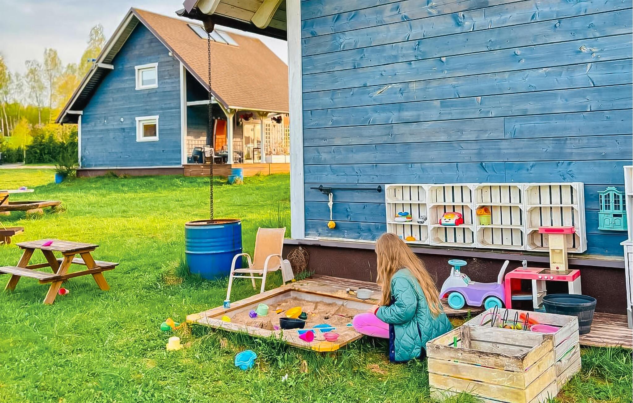 Treten Sie hinaus auf das weitläufige Grundstück mit Rasenfläche. Entspannen Sie in der Hängematte oder beobachten Sie, wie Ihre Kinder im Sandkasten spielen. Nutzen Sie den Picknicktisch für Mahlzeiten im Freien und genießen Sie die ländliche Ruhe. Am Abend lädt die gemeinschaftlich genutzte Sauna im separaten Saunahaus zu wohltuender Wärme ein, während auch der Whirlpool Entspannung verspricht.