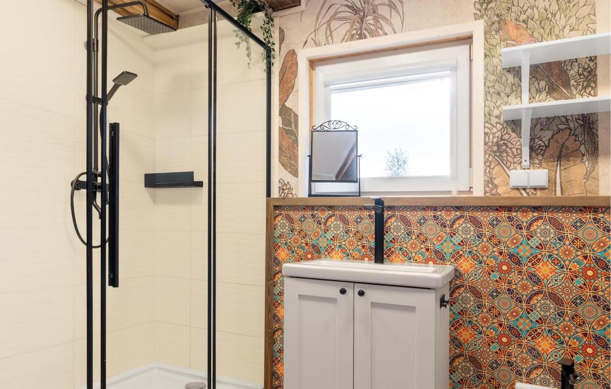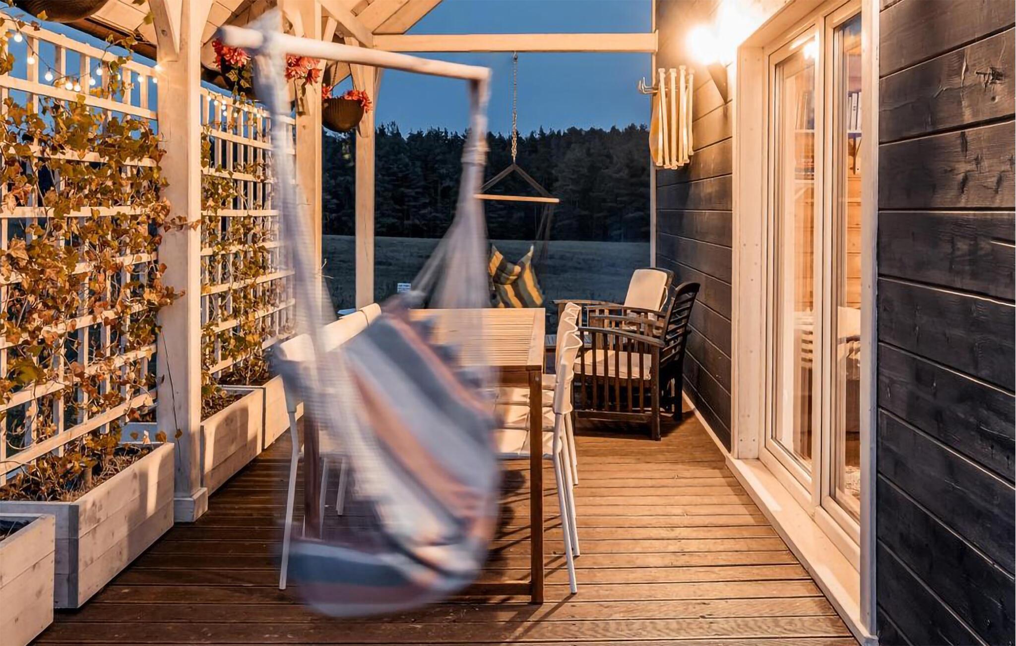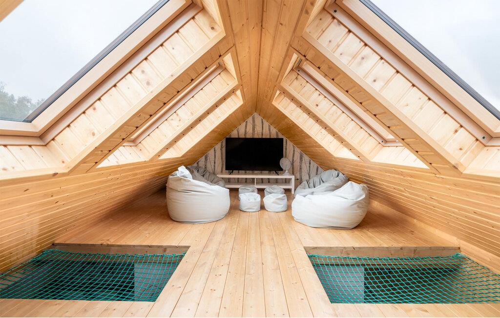 Lassen Sie sich vom warmen Charakter Ihres Hauses mit seinen hellen Holzverkleidungen begeistern. Machen Sie es sich auf dem Sofa gemütlich und genießen Sie die wohlige Wärme des Kaminofens an kühleren Abenden. Der offene Wohn- und Essbereich wirkt durch die großen Fenster besonders freundlich. Nehmen Sie am Esstisch mit Blick ins Grüne Platz und starten Sie entspannt in den Tag. In der kompakten, offenen Küche bereiten Sie Ihre Mahlzeiten unkompliziert zu. Ziehen Sie sich auf die Galerie unter dem Dach zurück, wo Sitzsäcke und ein Fernseher einen behaglichen Rückzugsort schaffen.