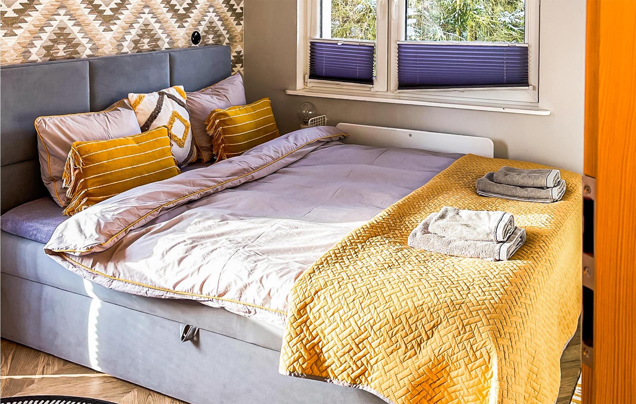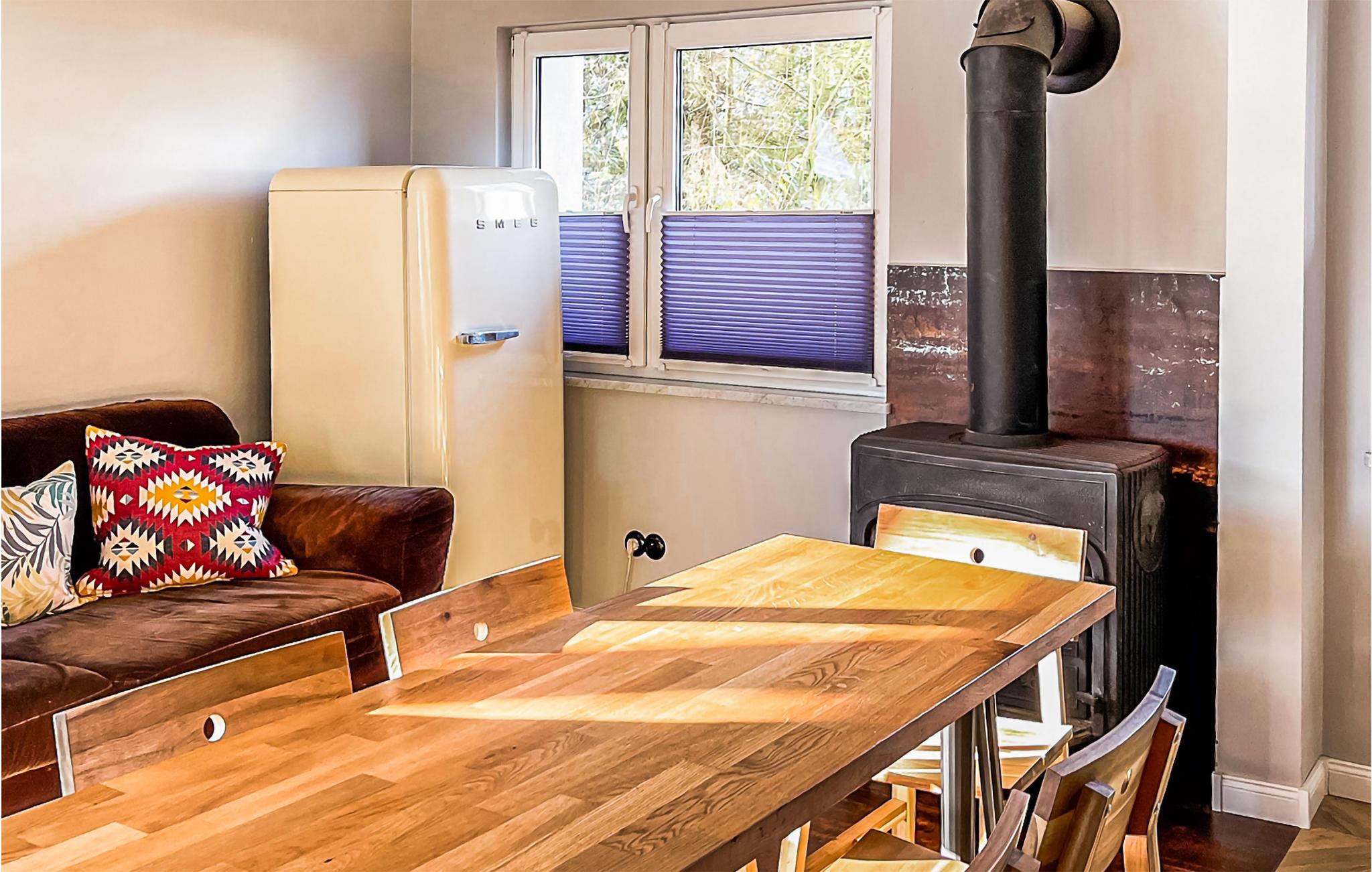 Willkommen in diesem komfortablen Ferienhaus, das Sie am Ufer des Kamionka-Sees erwartet und mit seinen wohnlichen, geschmackvoll eingerichteten Räumen die ideale Kulisse für eine schöne Zeit mit der Familie bildet. Machen Sie es sich nach einem herrlichen Urlaubstag im Wohnzimmer auf dem Sofa gemütlich, spielen Sie Spiele, essen Sie gemeinsam und lassen Sie in stilvollem Rahmen das Erlebte gemeinsam noch einmal Revue passieren, während die Flammen im Kaminofen behaglich knistern. In der hauseigenen Sauna können Sie ebenfalls entspannen.